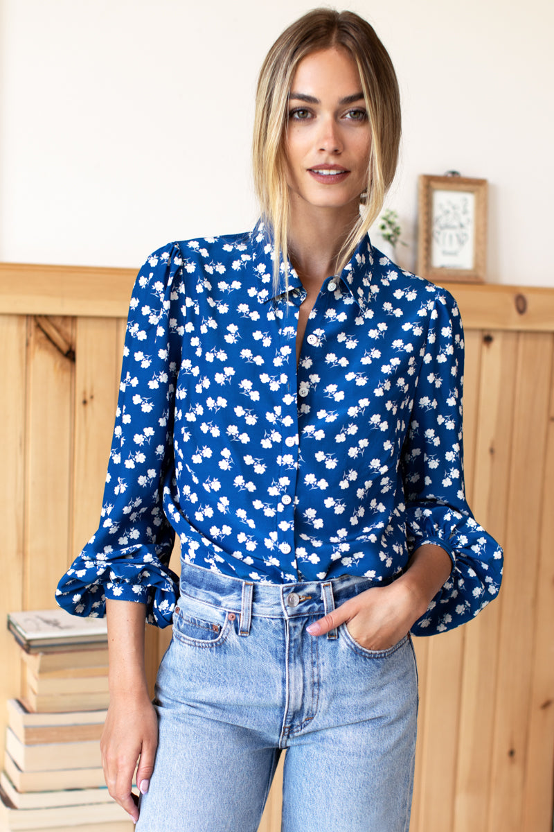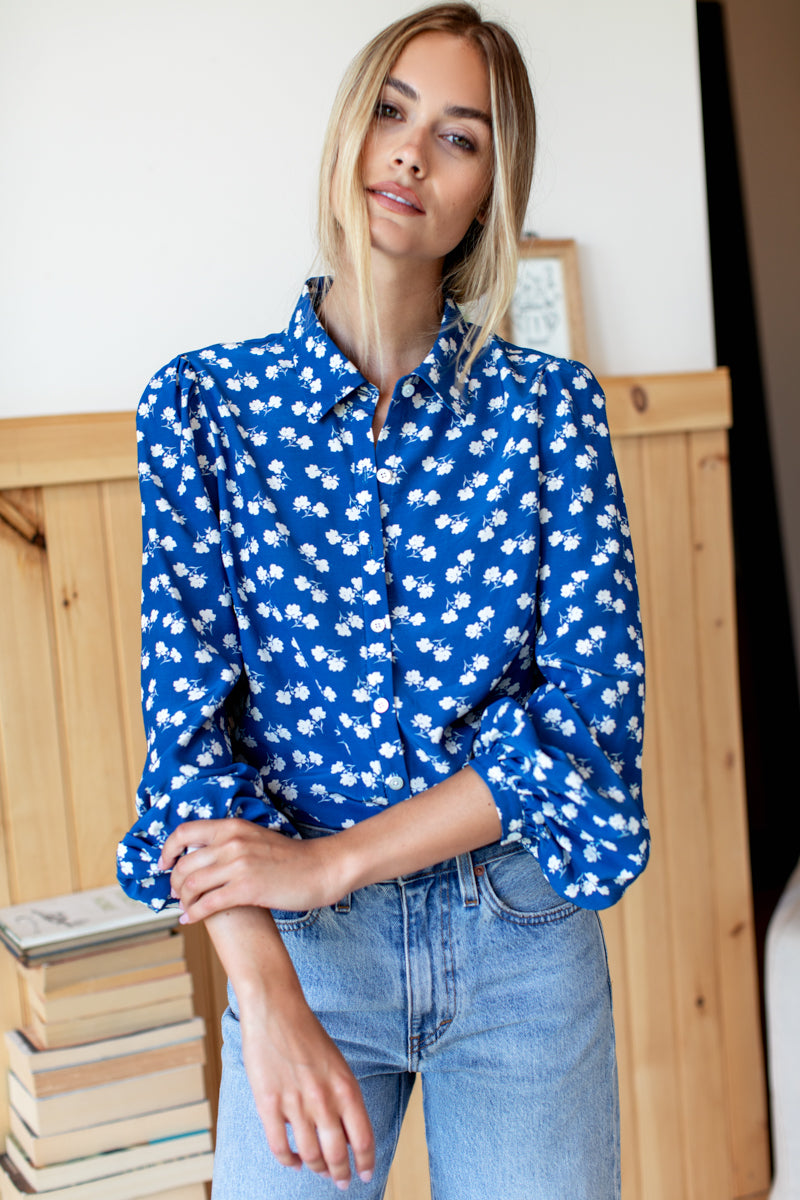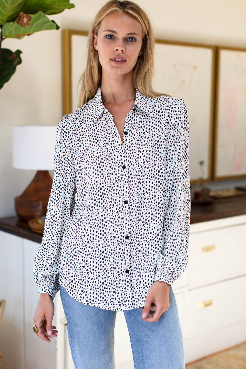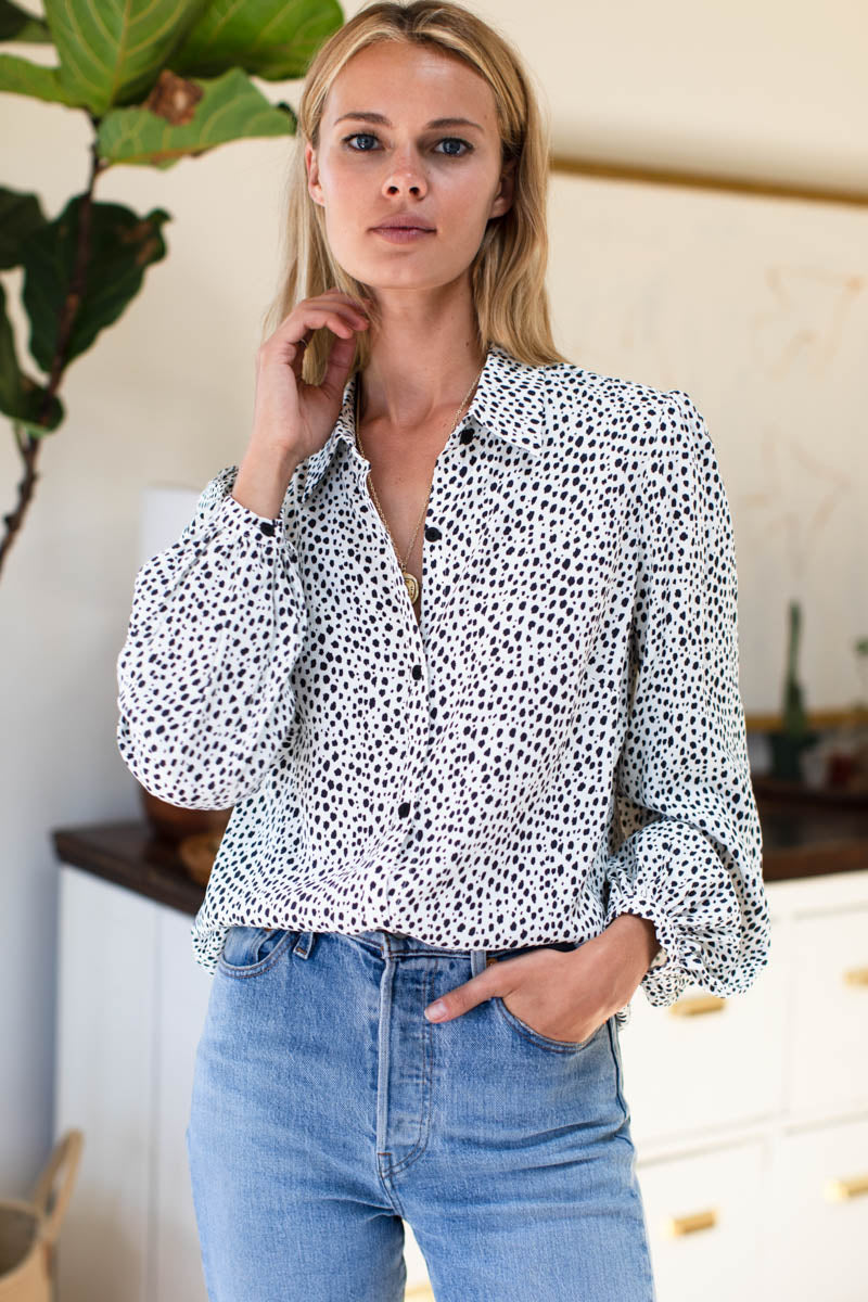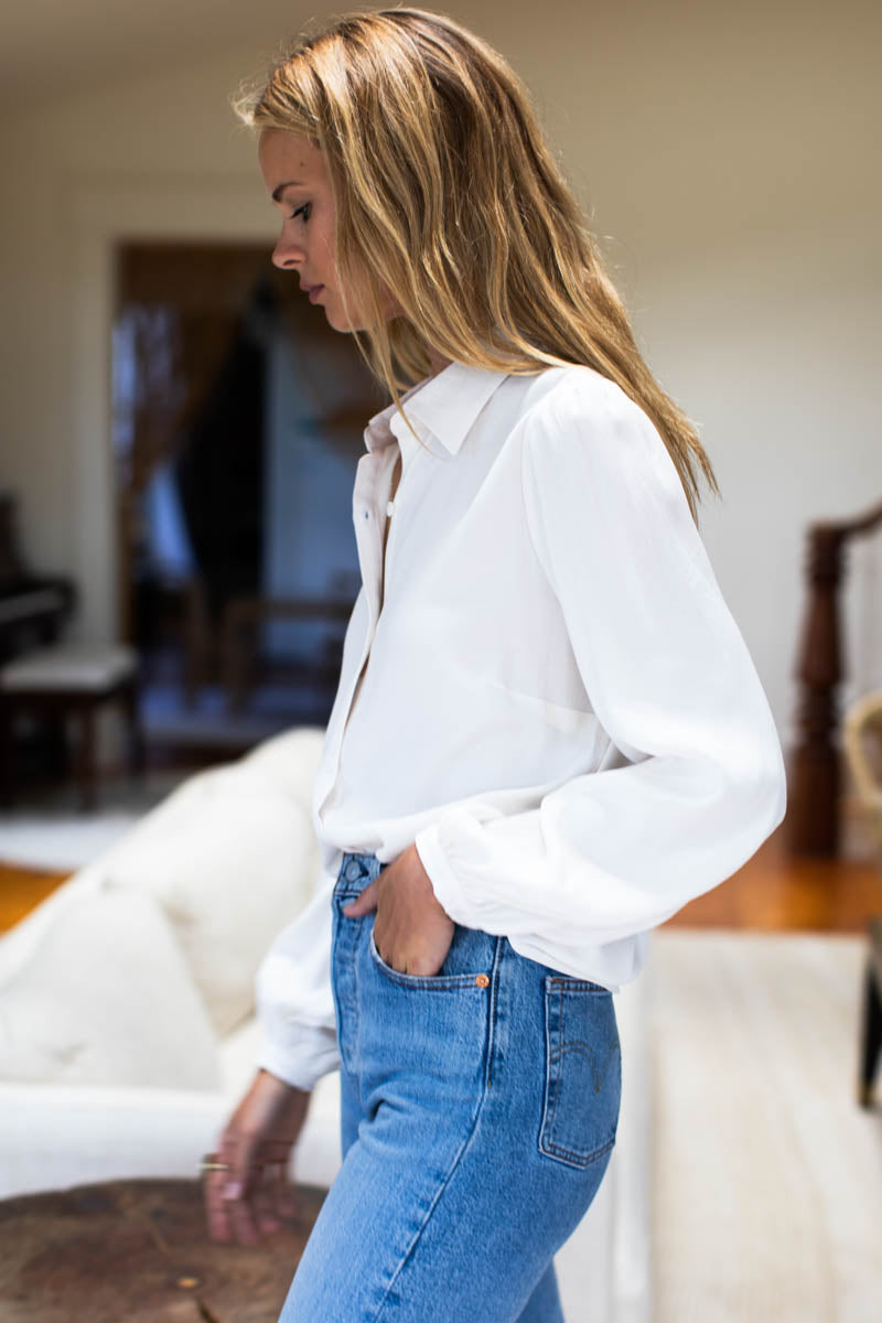 Viscose with luxe silk feel Set in puff shoulder Full button front closure Full length sleeves with button closure at wrist Model is wearing a size small Made in NYC...