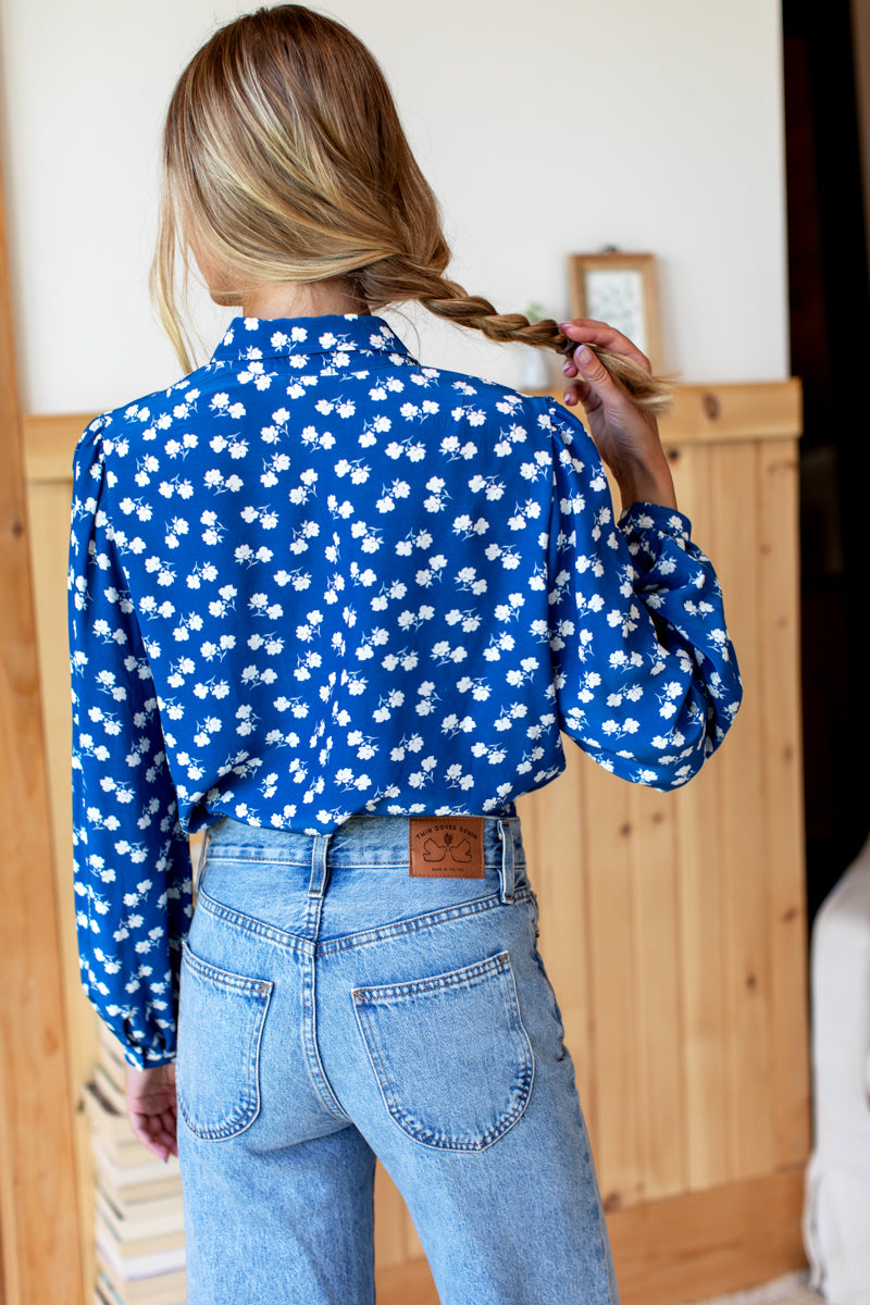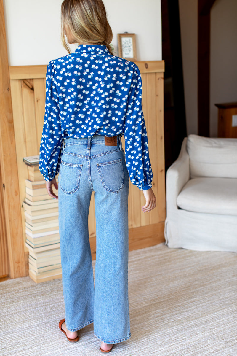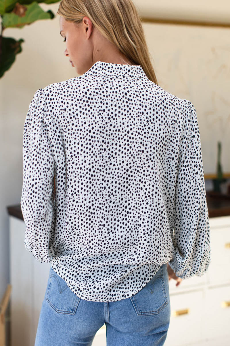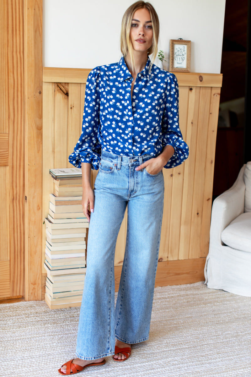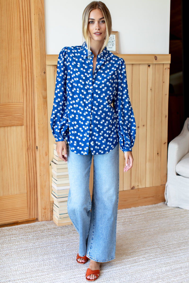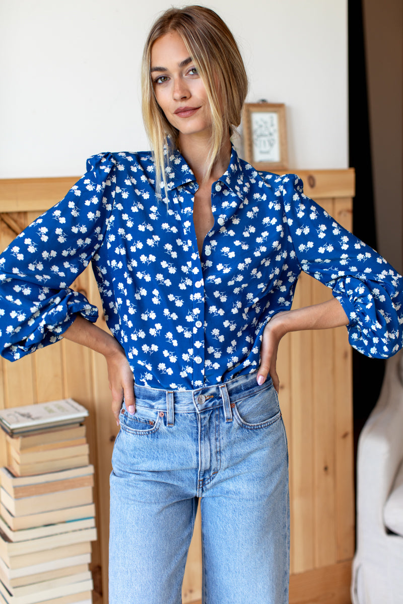 Viscose with luxe silk feel Set in puff shoulder Full button front closure Full length sleeves with button closure at wrist Model is wearing a size small Made in NYC...