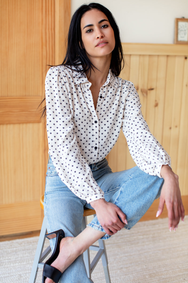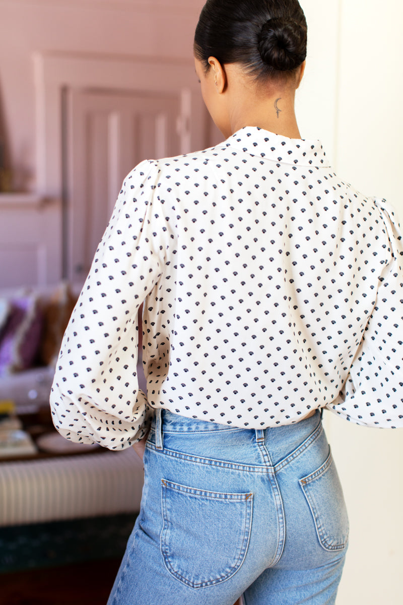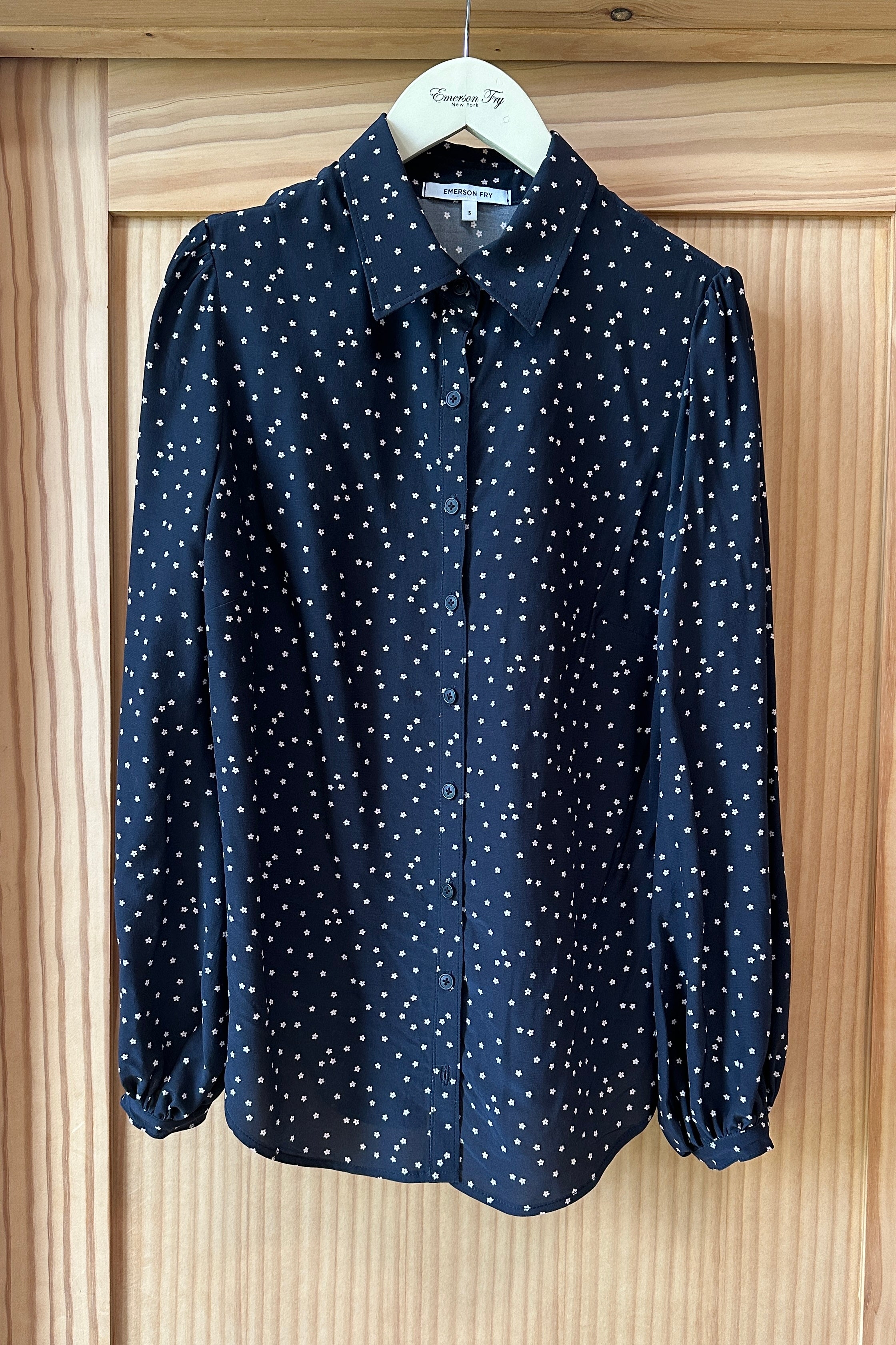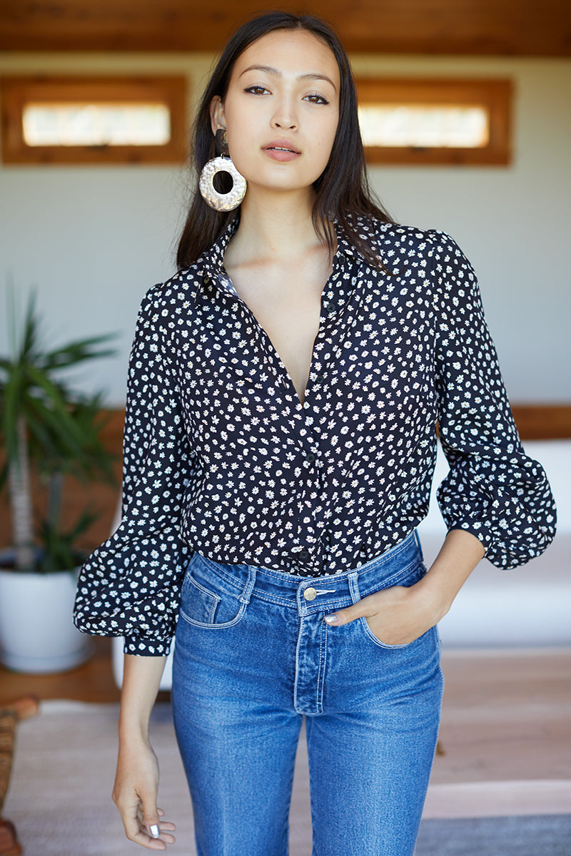 Sustainable Viscose Set in puff shoulder Full button front closure Full length sleeves with button closure at wrist Model is wearing a size small Made in NYC Size XXS: Bust 35.5”,...