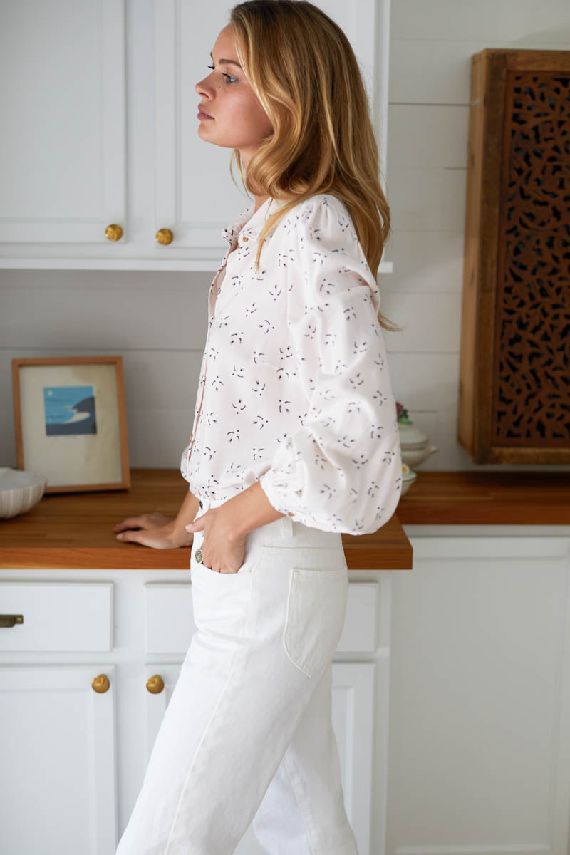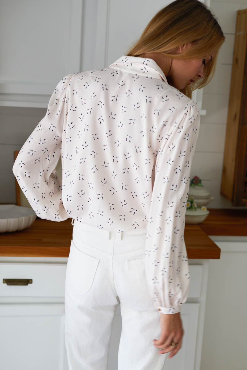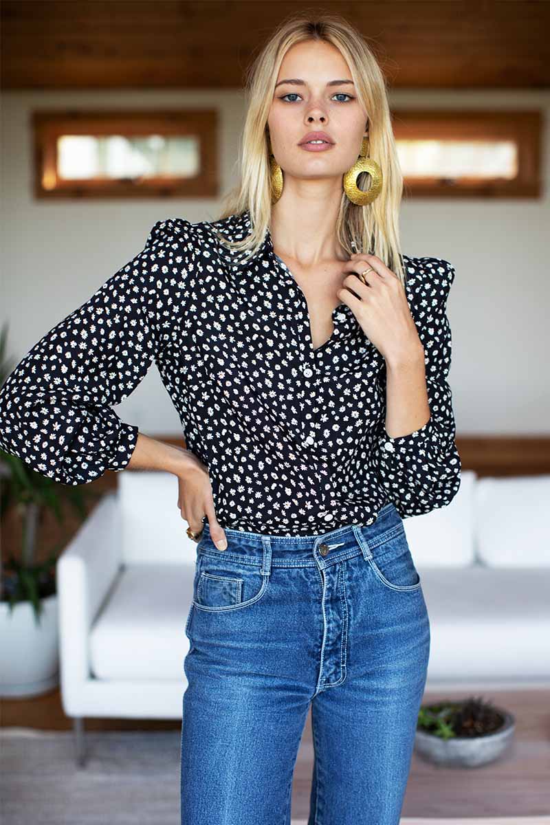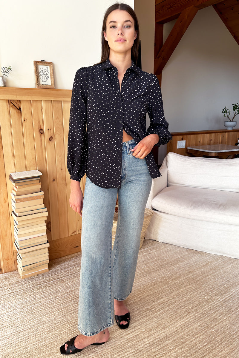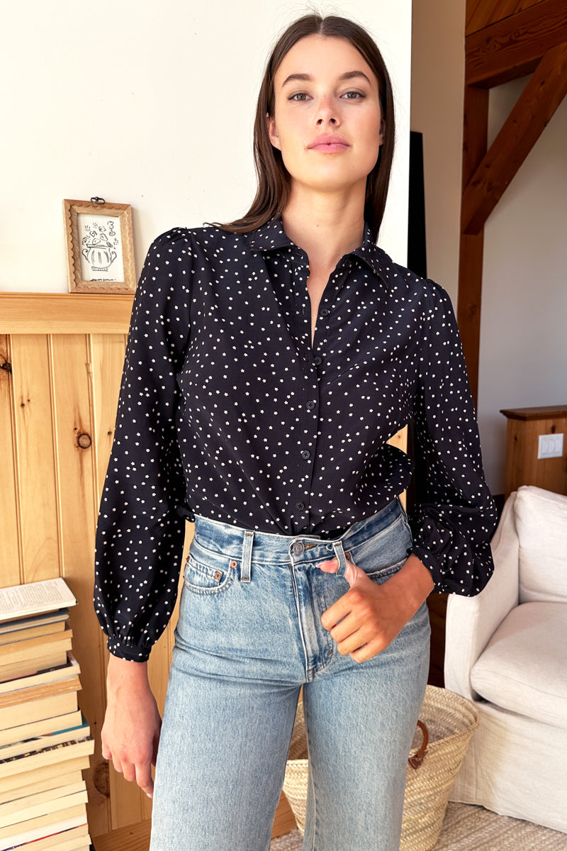 Sustainable Viscose Set in puff shoulder Full button front closure Full length sleeves with button closure at wrist Model is wearing a size small Made in NYC Size XXS: Bust 35.5”,...