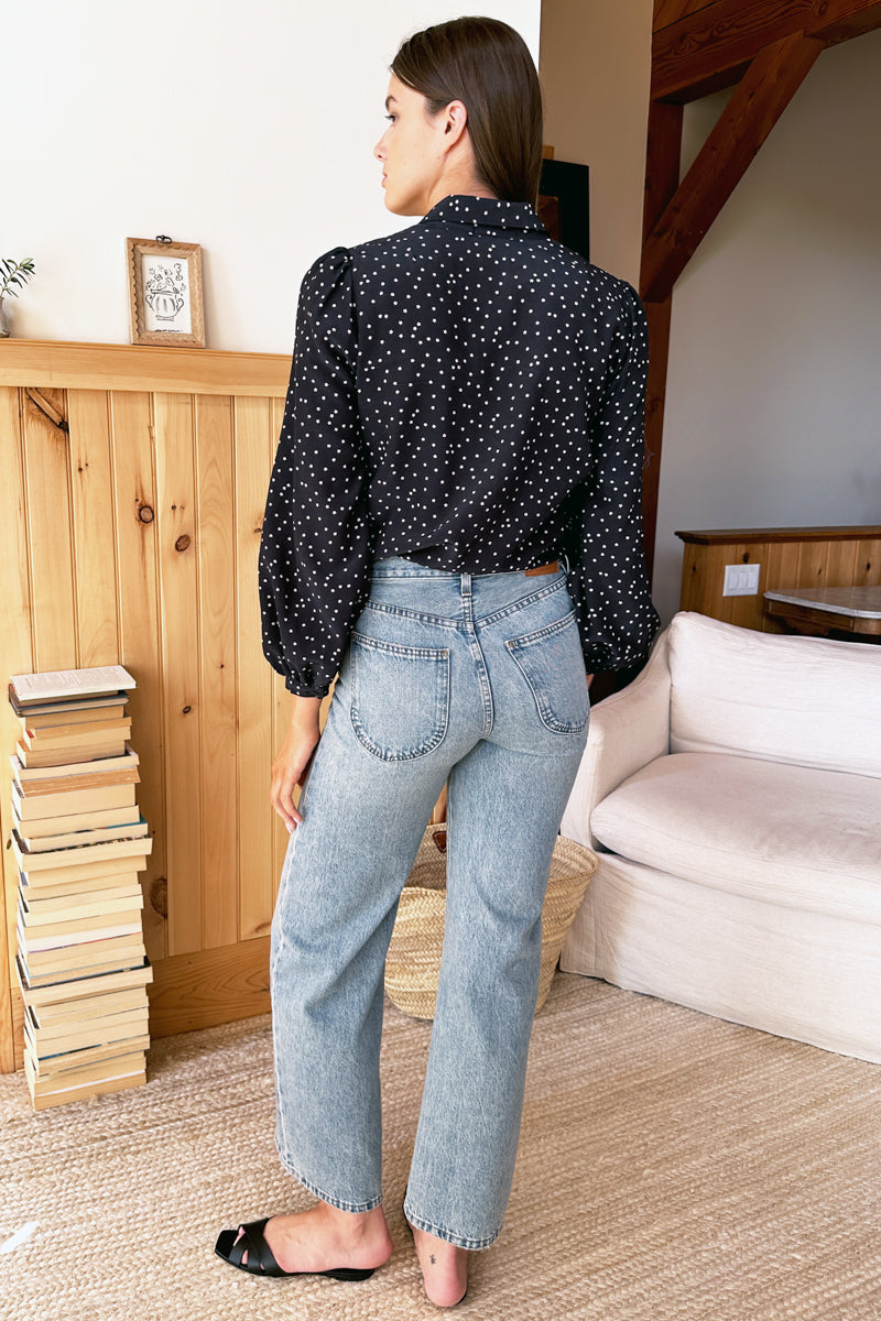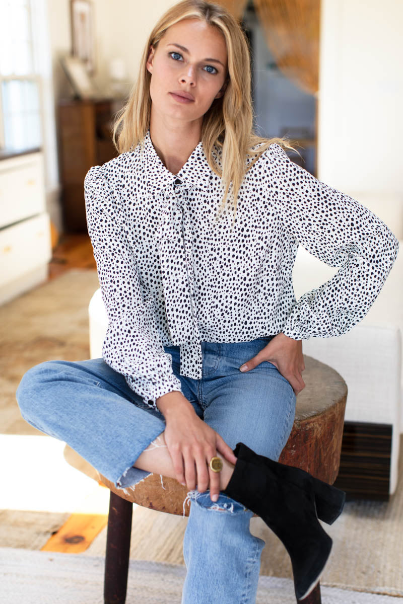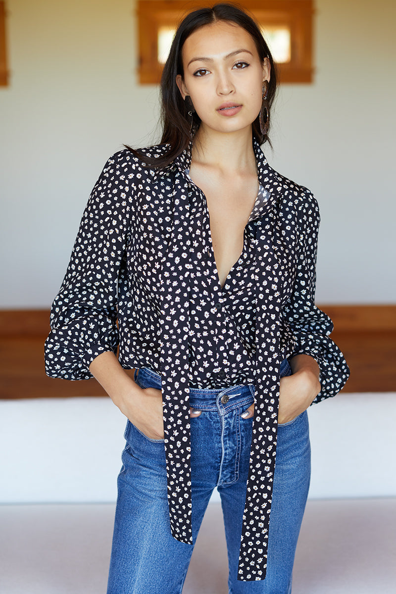 Sustainable Viscose Removable tie sash Set in puff shoulder Full button front closure Full length sleeves with button closure at wrist Model is wearing a size small Made in NYC...