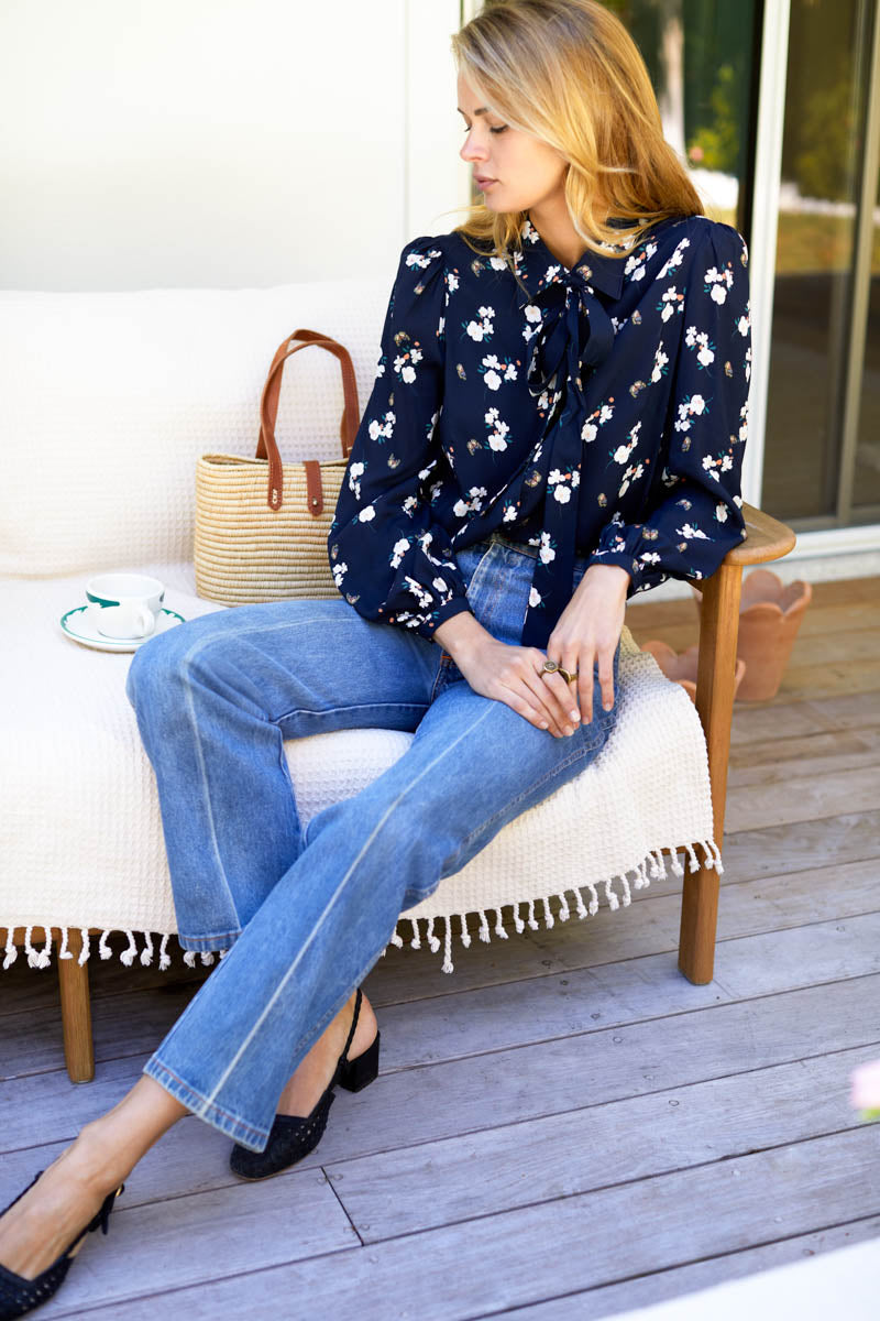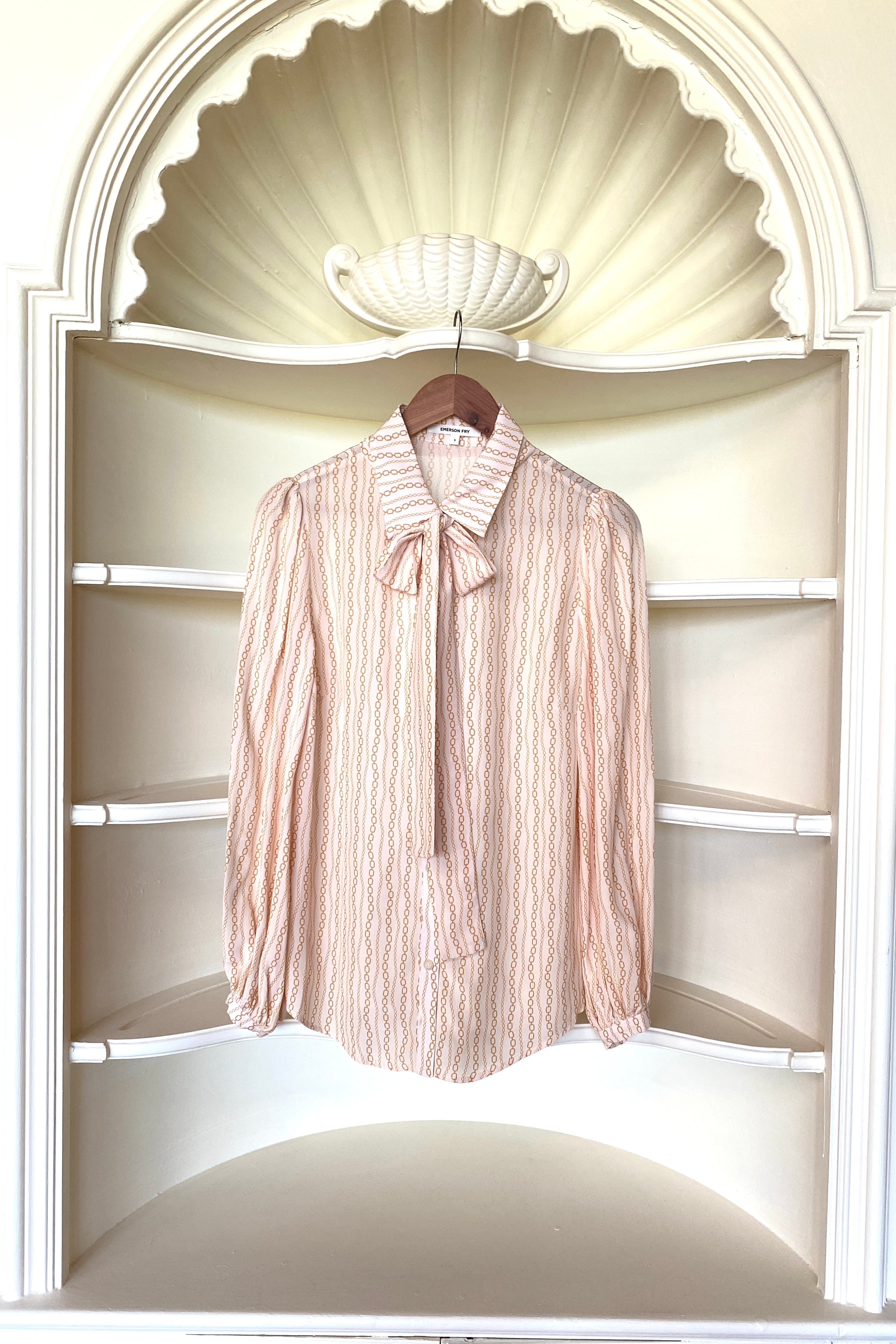 100% Silk Removable tie sash Set in puff shoulder Full button front closure Full length sleeves with button closure at wrist Model is wearing a size small Dry clean Made...