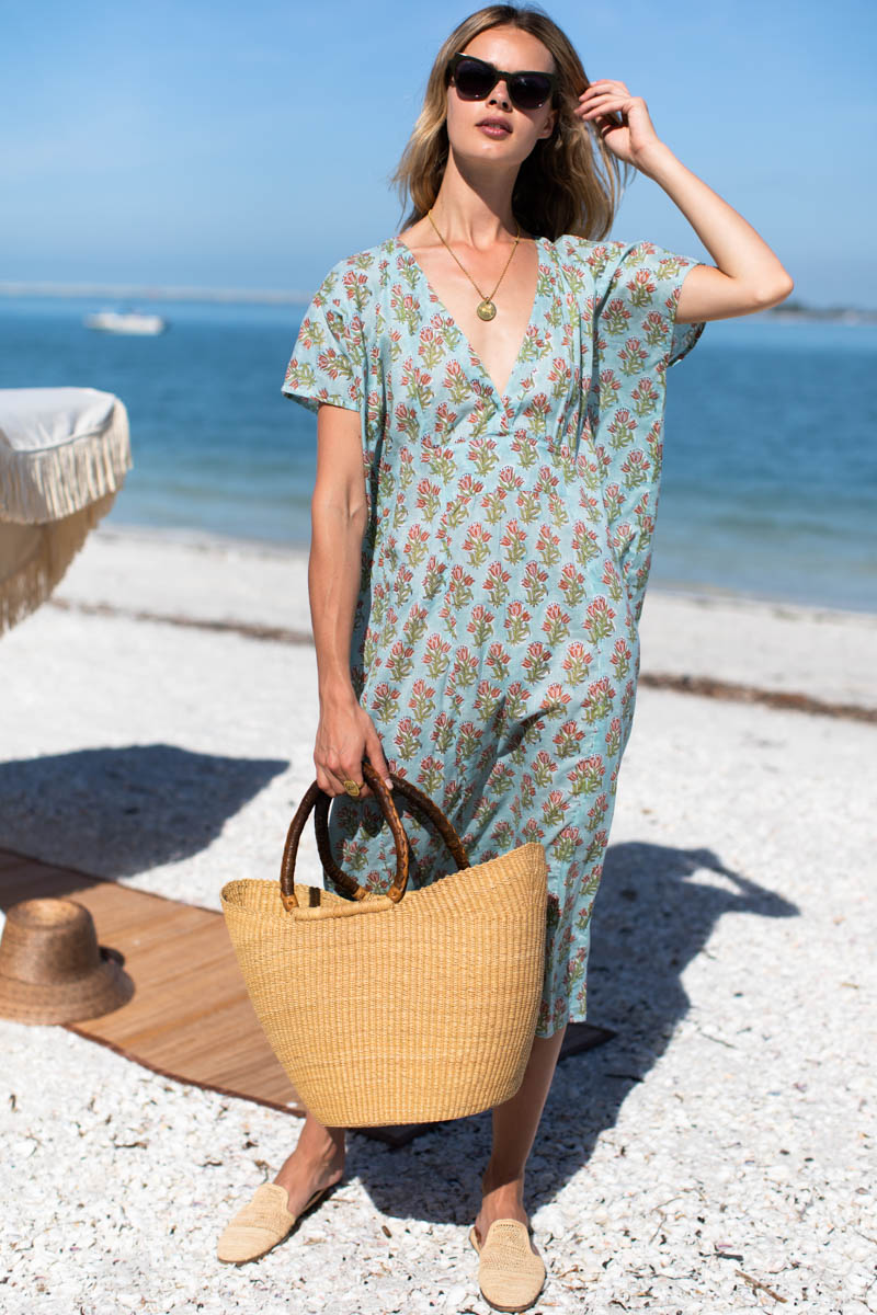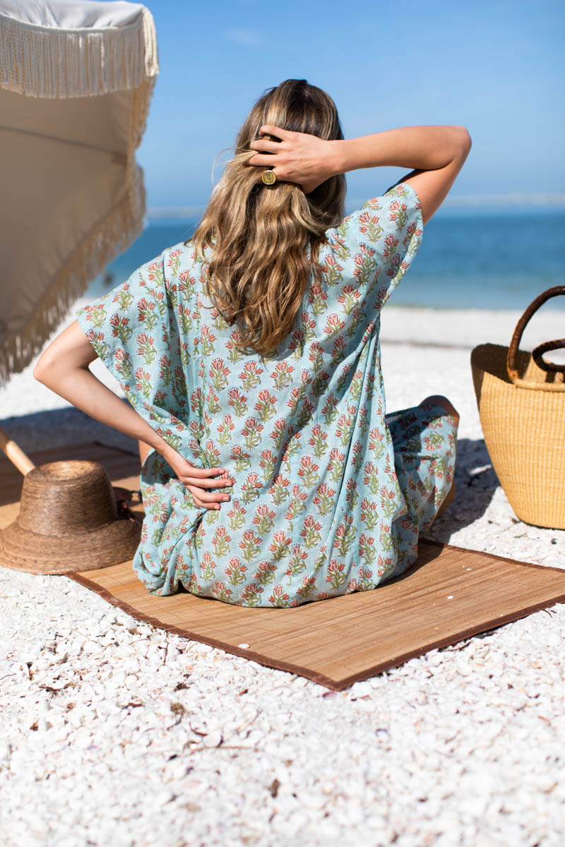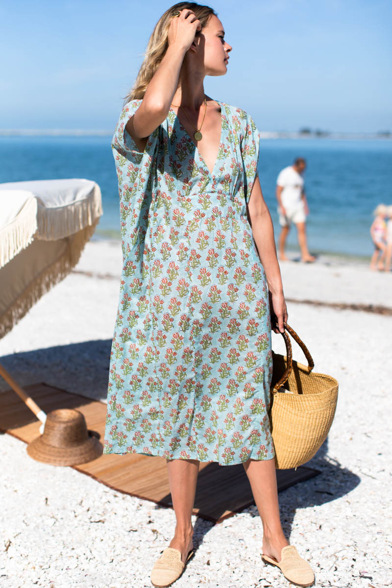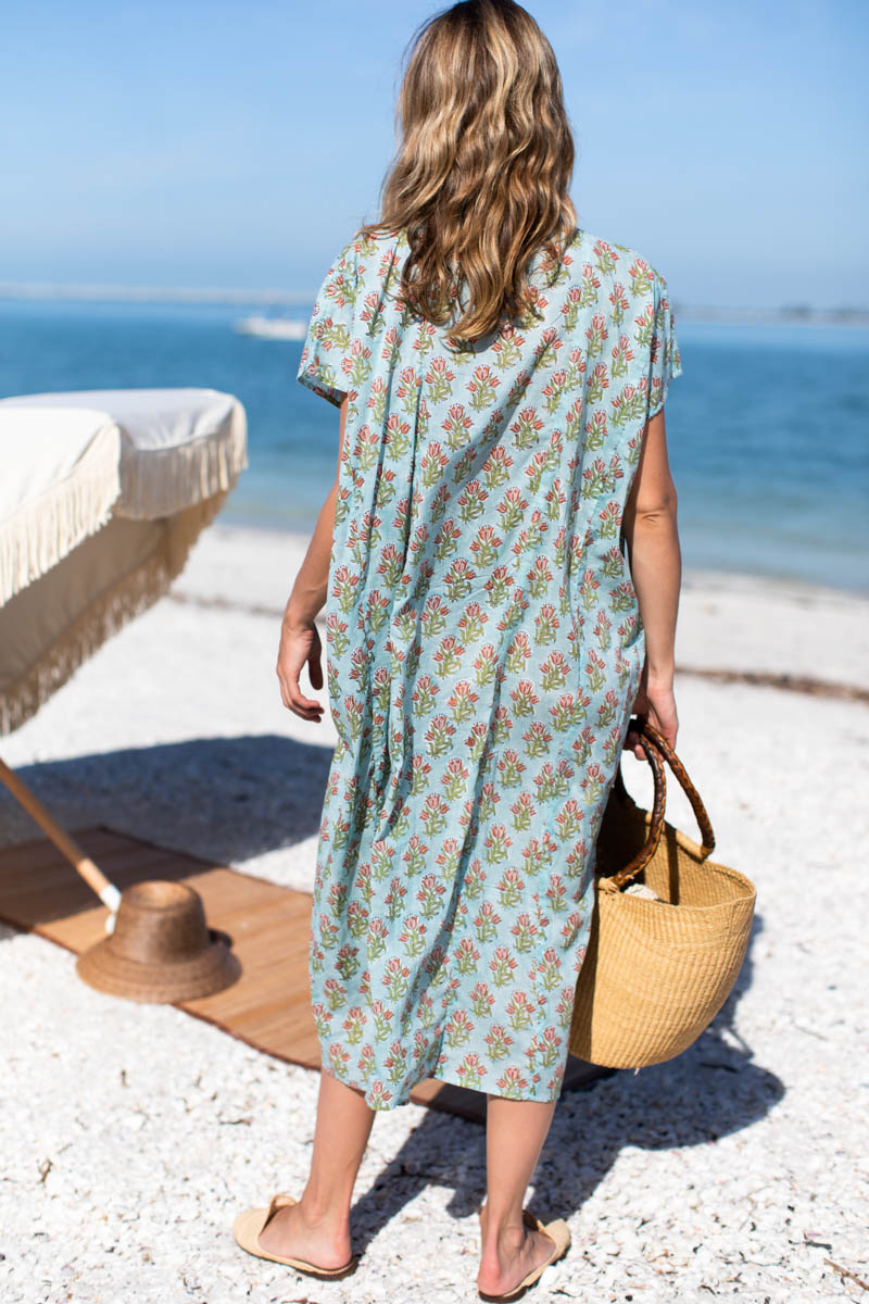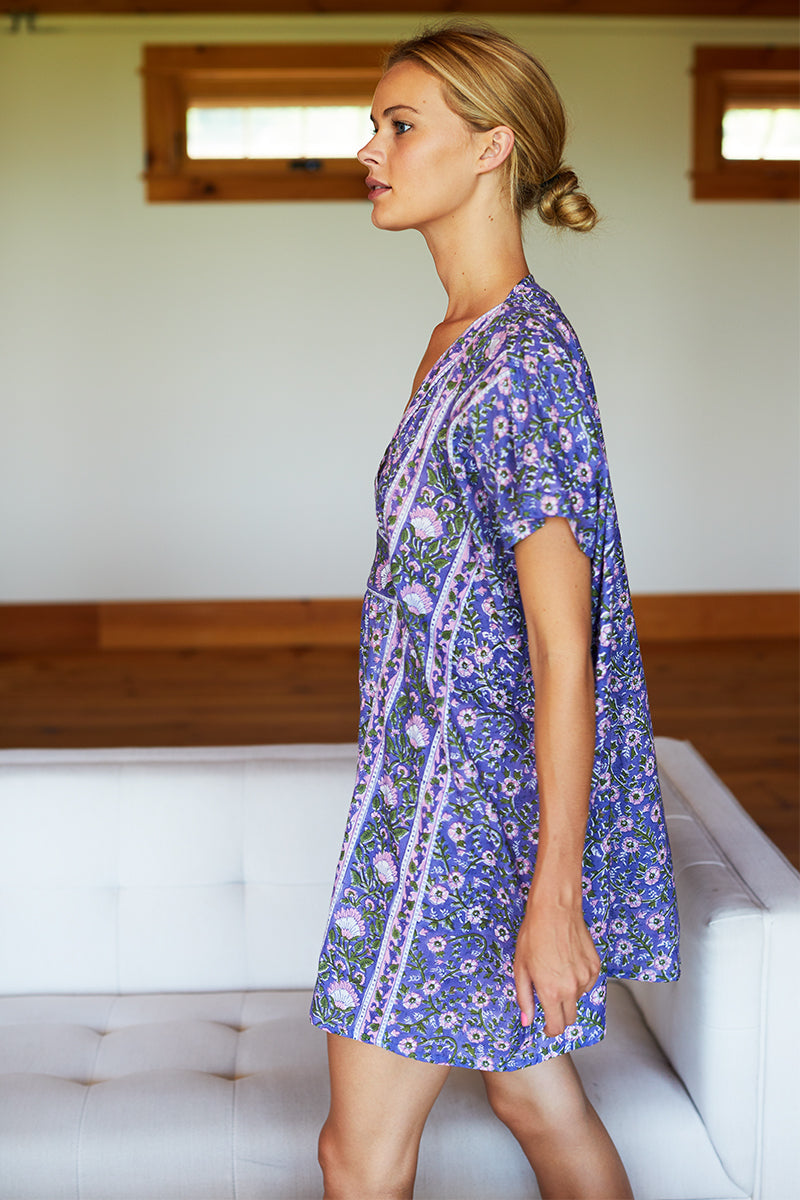 100% Organic cotton Hand block printed w/ low impact dye 11" Neckline opening w/ hook + eye closure Hidden interior waist tie for a more fitted look One size Center...
