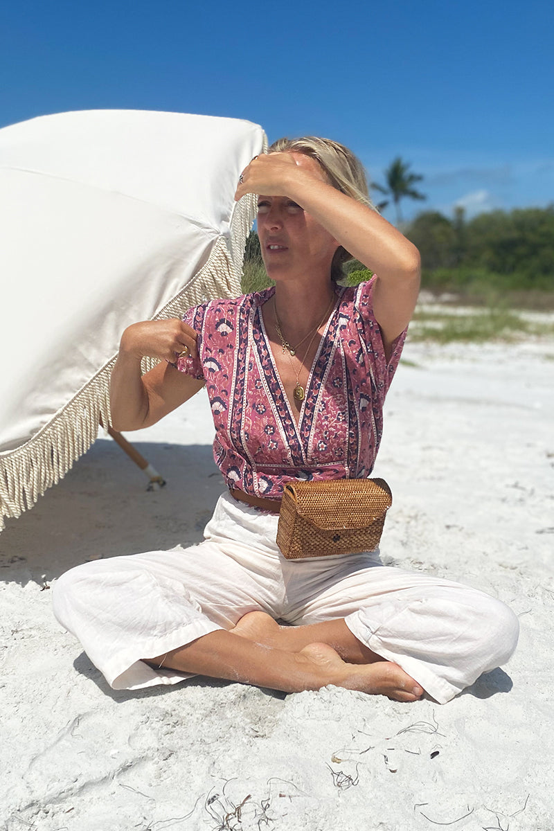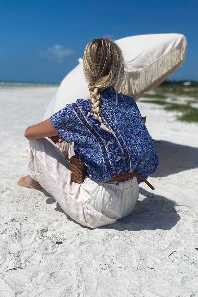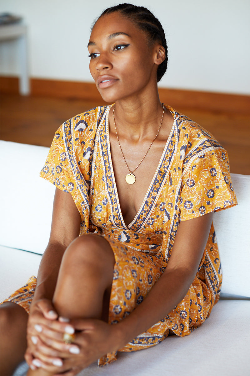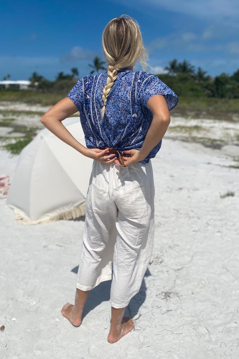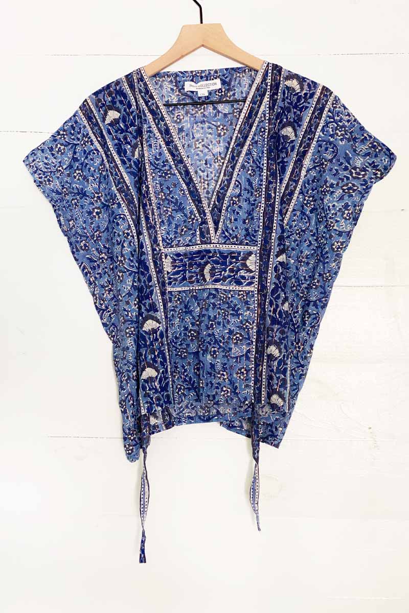 100% Organic cotton Hand block printed w/ low impact dye 11" Neckline opening w/ hook + eye closure Hidden interior waist tie for a more fitted look One size Center...