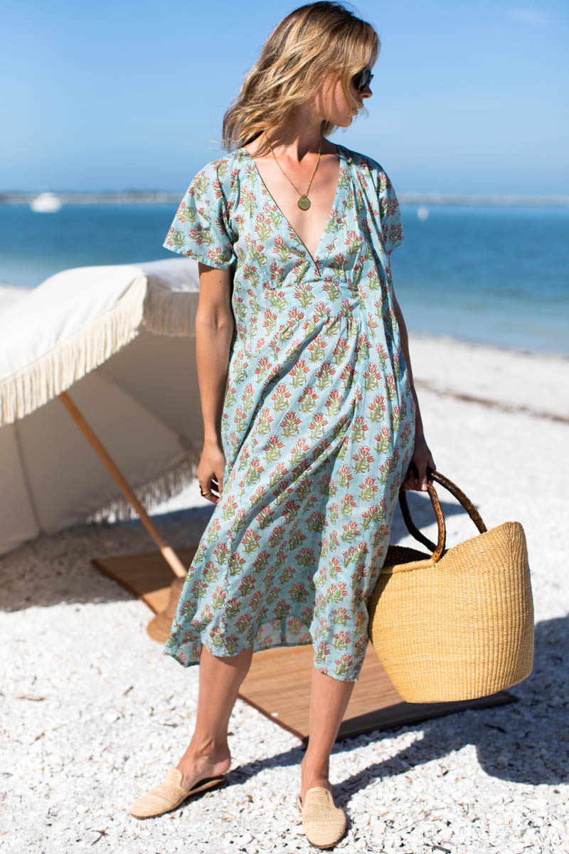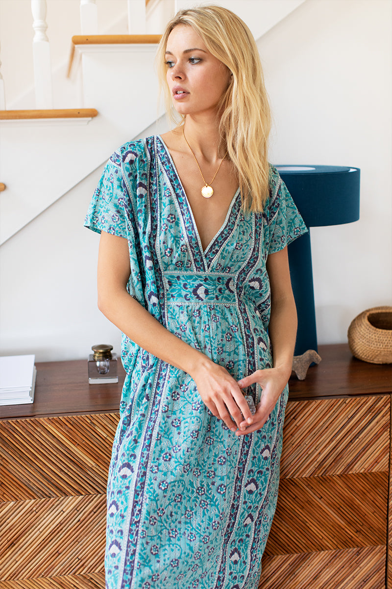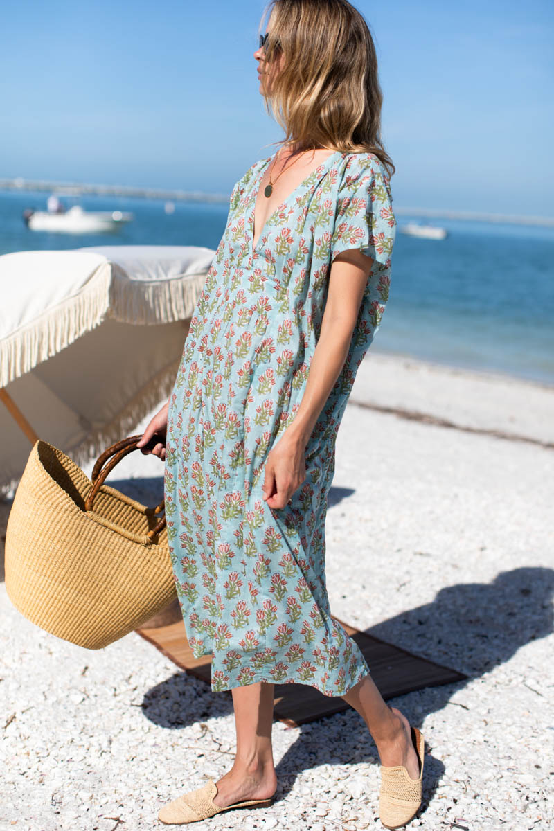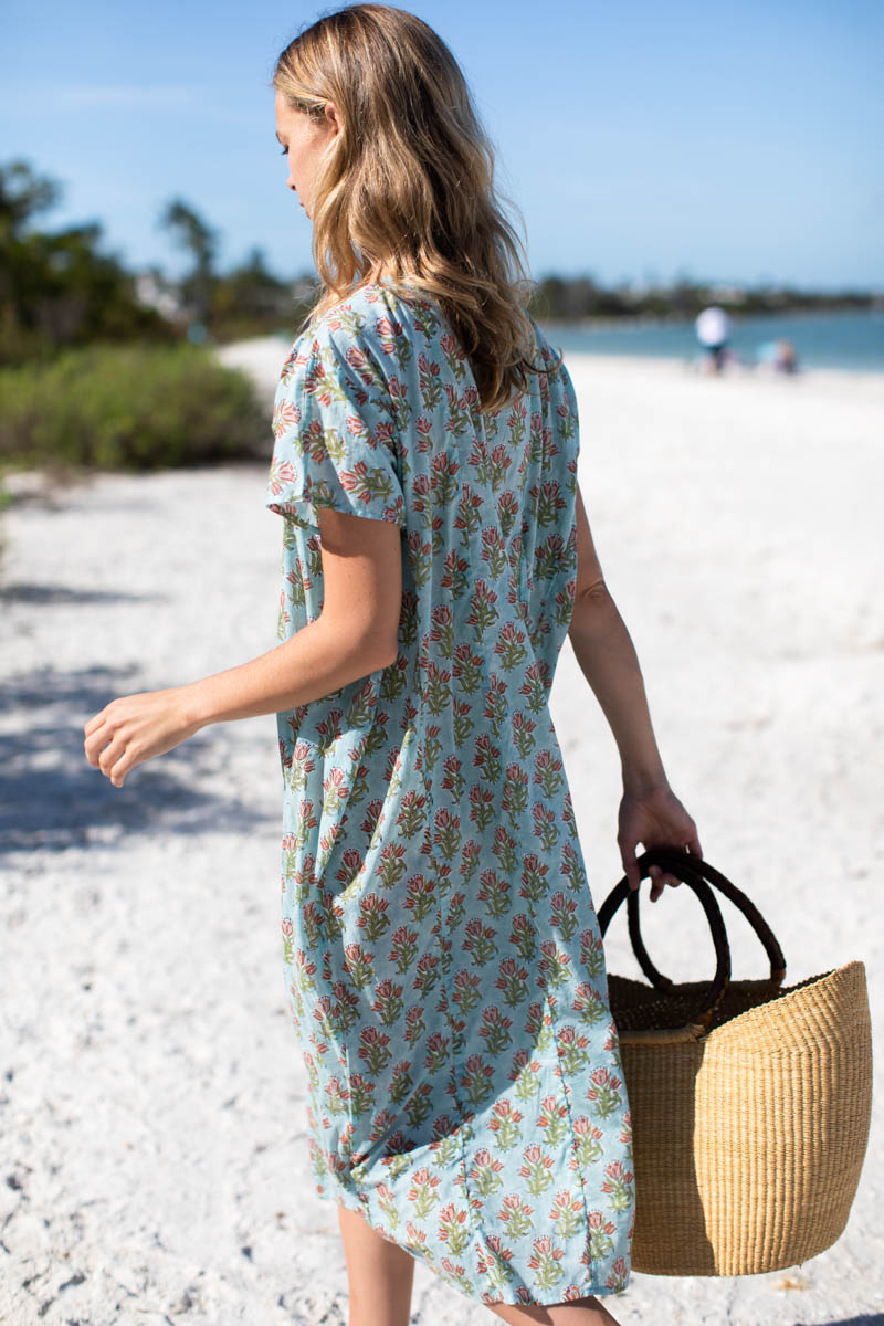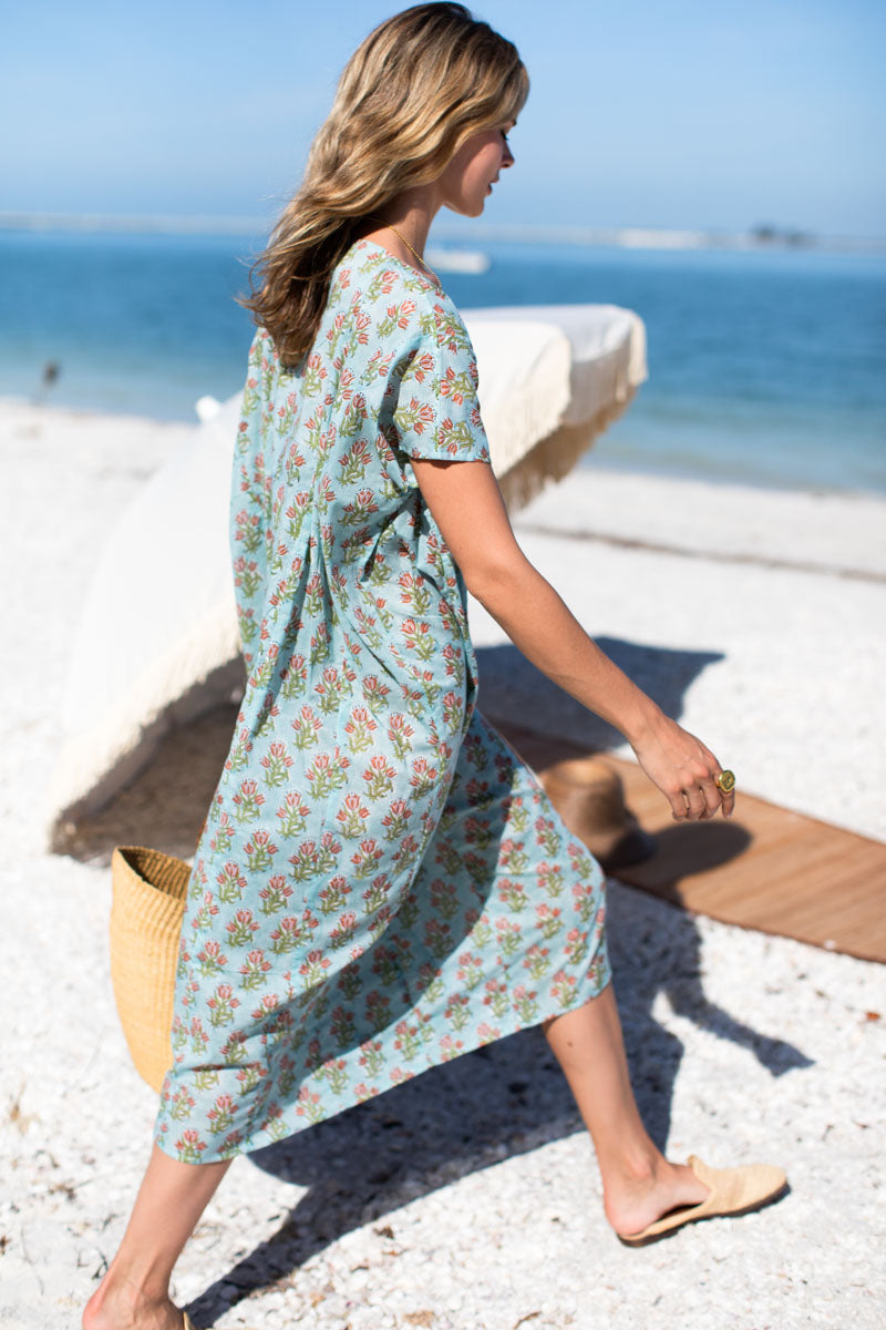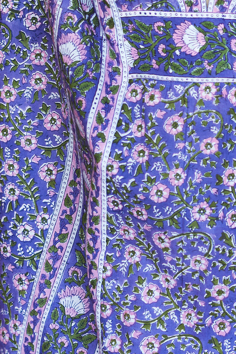 Made with 100% Organic cotton Hand block printed w/ low impact dye 11" Neckline opening w/ hook + eye closures Hidden interior waist tie for a more fitted look One...