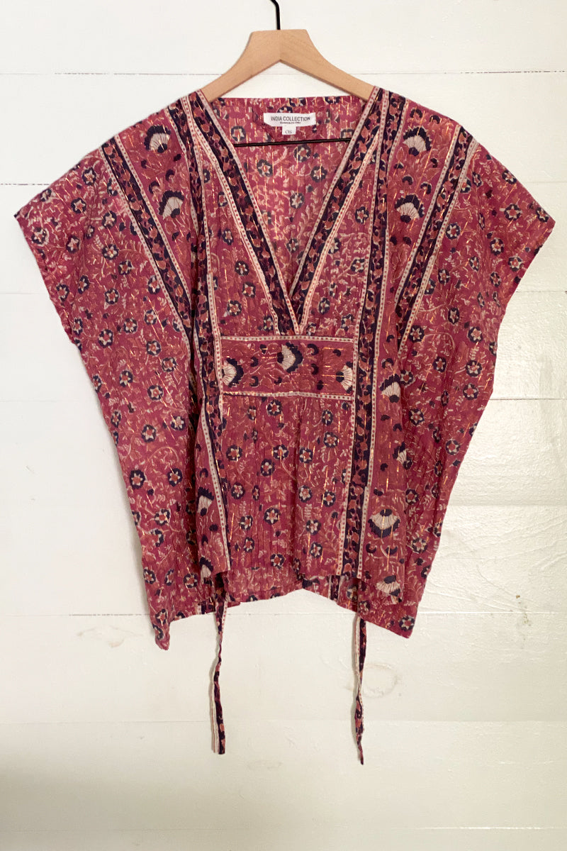 100% cotton with gold lurex stripes Hand block printed w/ low impact dye 11" Neckline opening w/ hook + eye closures Hidden interior bust tie for a more fitted look...