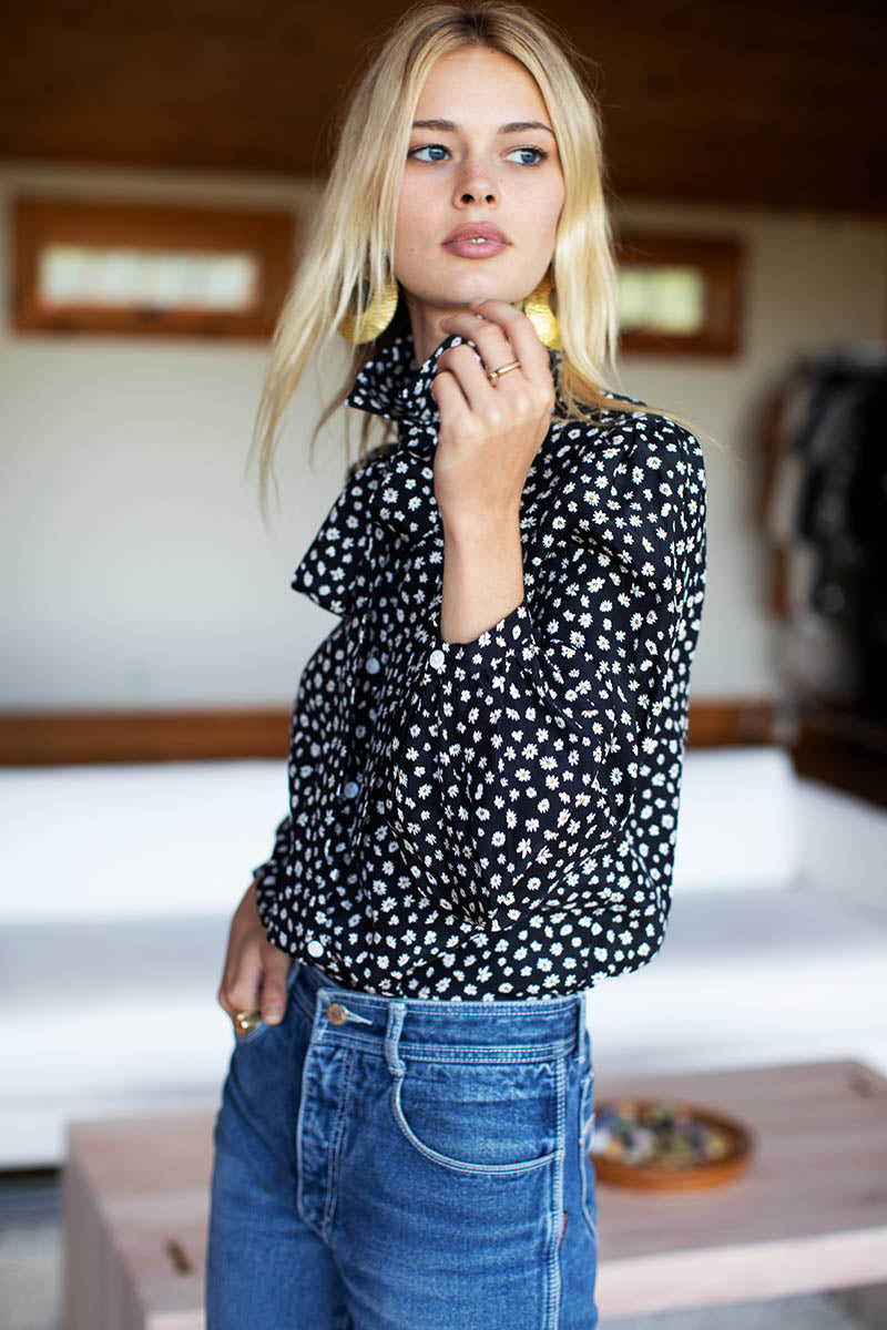 Sustainable Viscose Tie sash Set in puff shoulder Full button front closure Full length sleeves with button closure at wrist Model is wearing a size small Made in NYC Size...