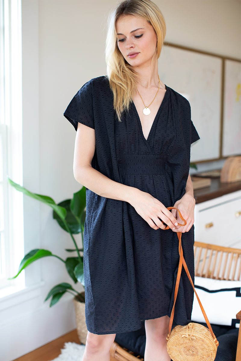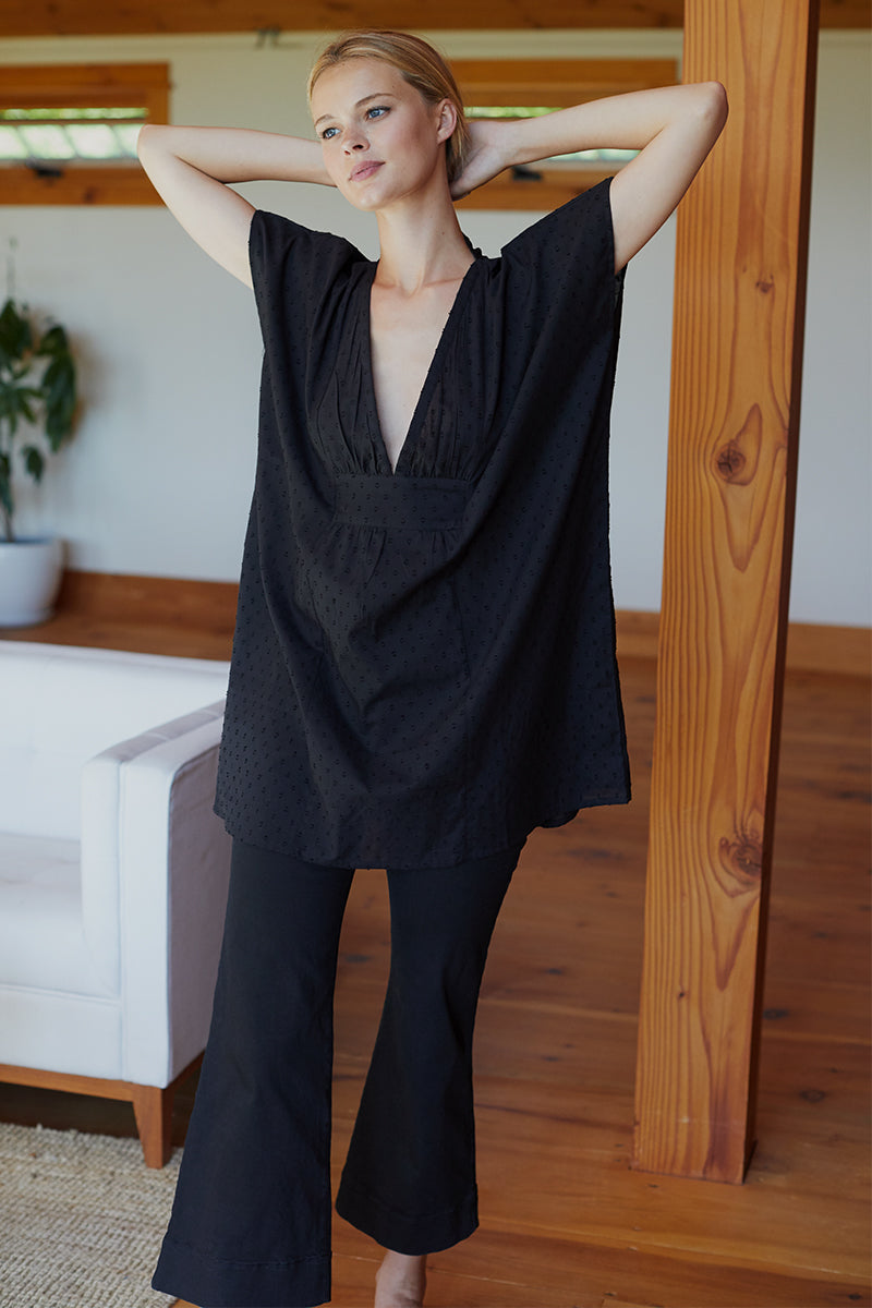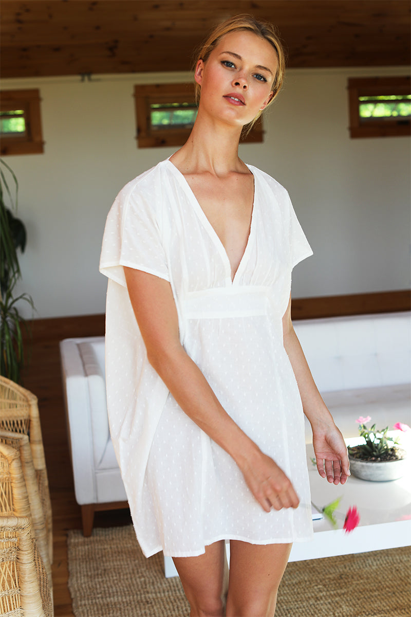 Francina Tunic is a littler caftan - scaled down proportions, light + breezy Embroidered Cotton - swiss dots Slightly sheer, easy/breezy fit Hidden interior waist tie for a more...