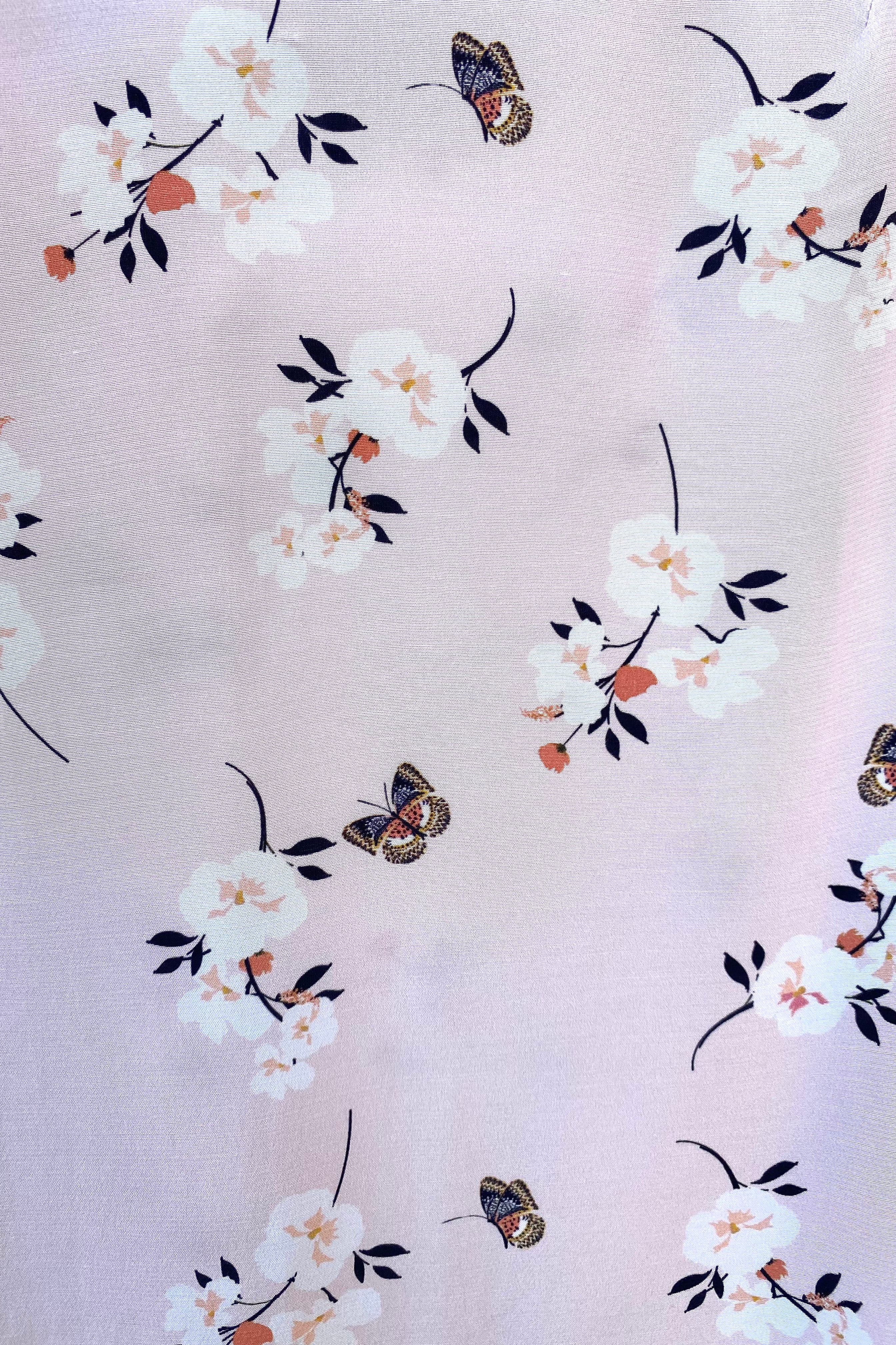 Viscose rayon/crepe Removable tie sash Set in puff shoulder Full button front closure Full length sleeves with button closure at wrist Model is wearing a size small Dry clean Made...