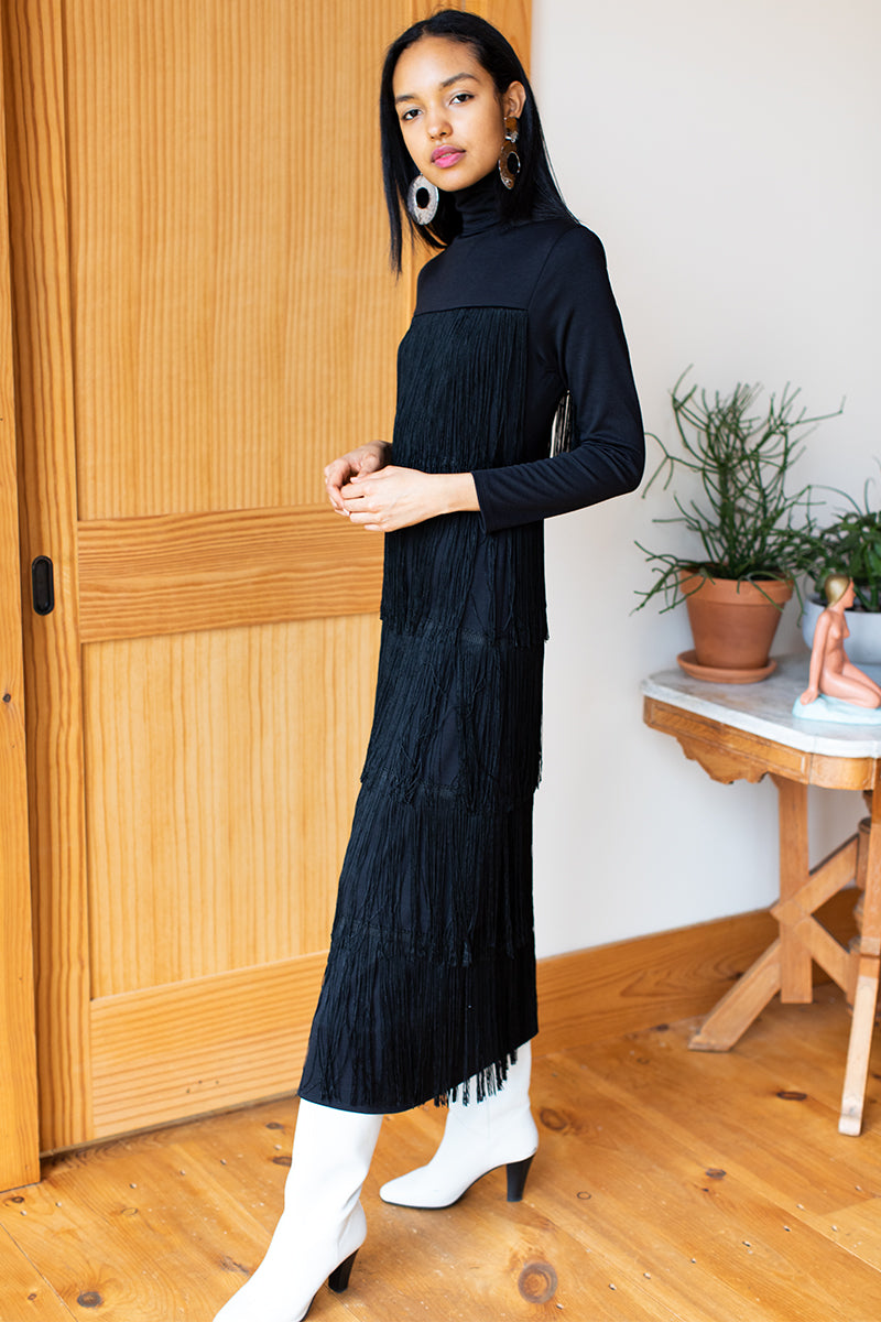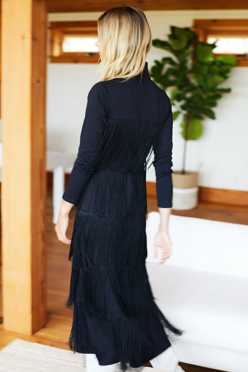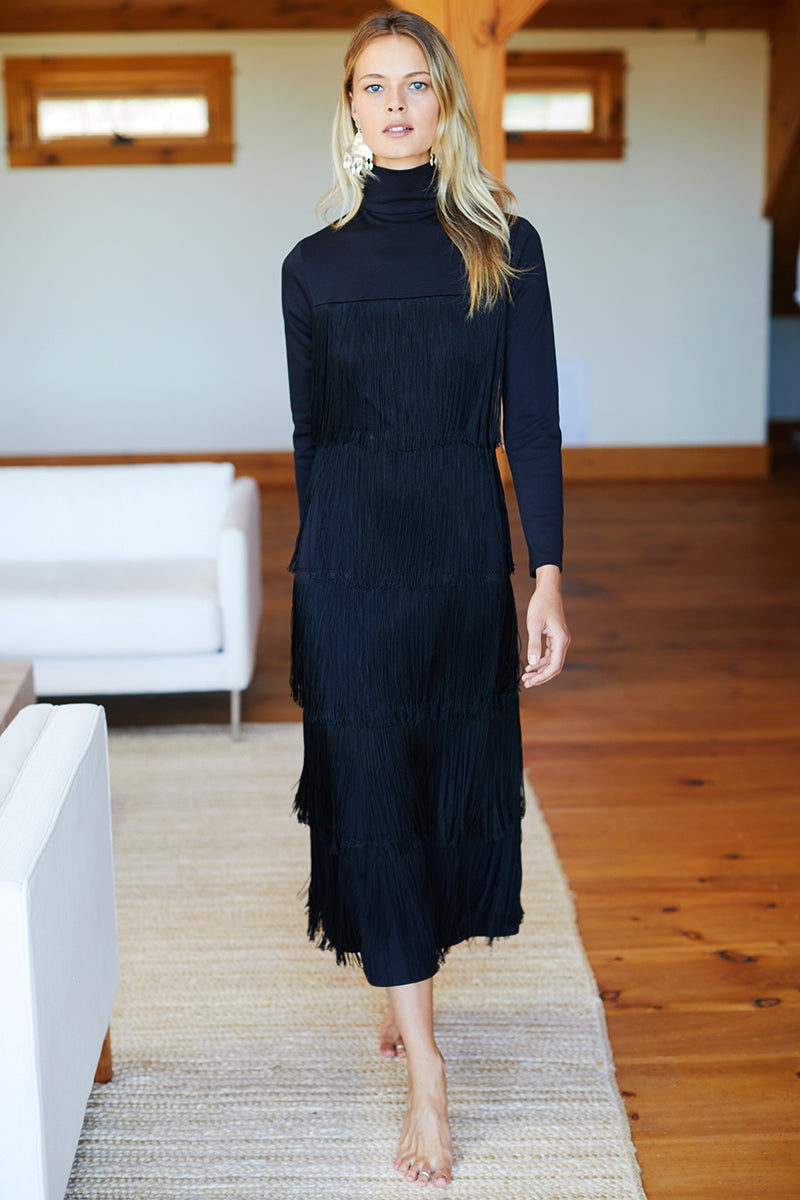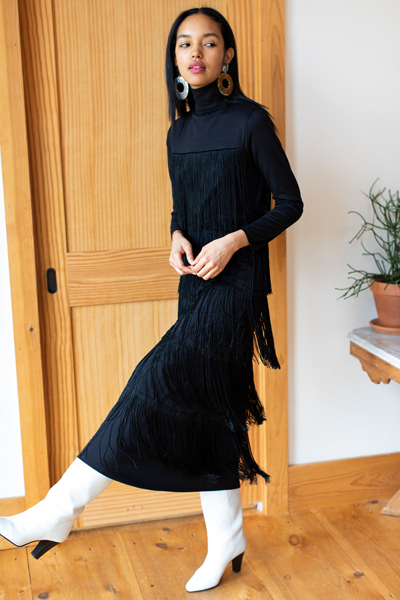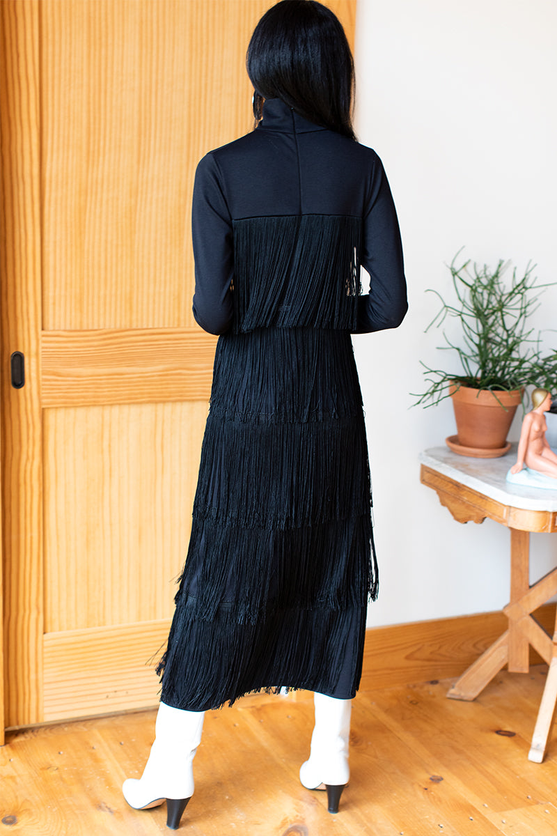 Sleek turtleneck dress - great to have an unforgettable black dress in wardrobe comfortable + danceable for all the parties + special things! Ponte body w/ 10 inch fringe Turtleneck ...