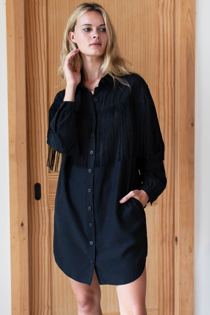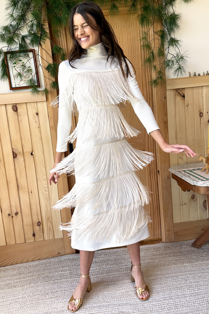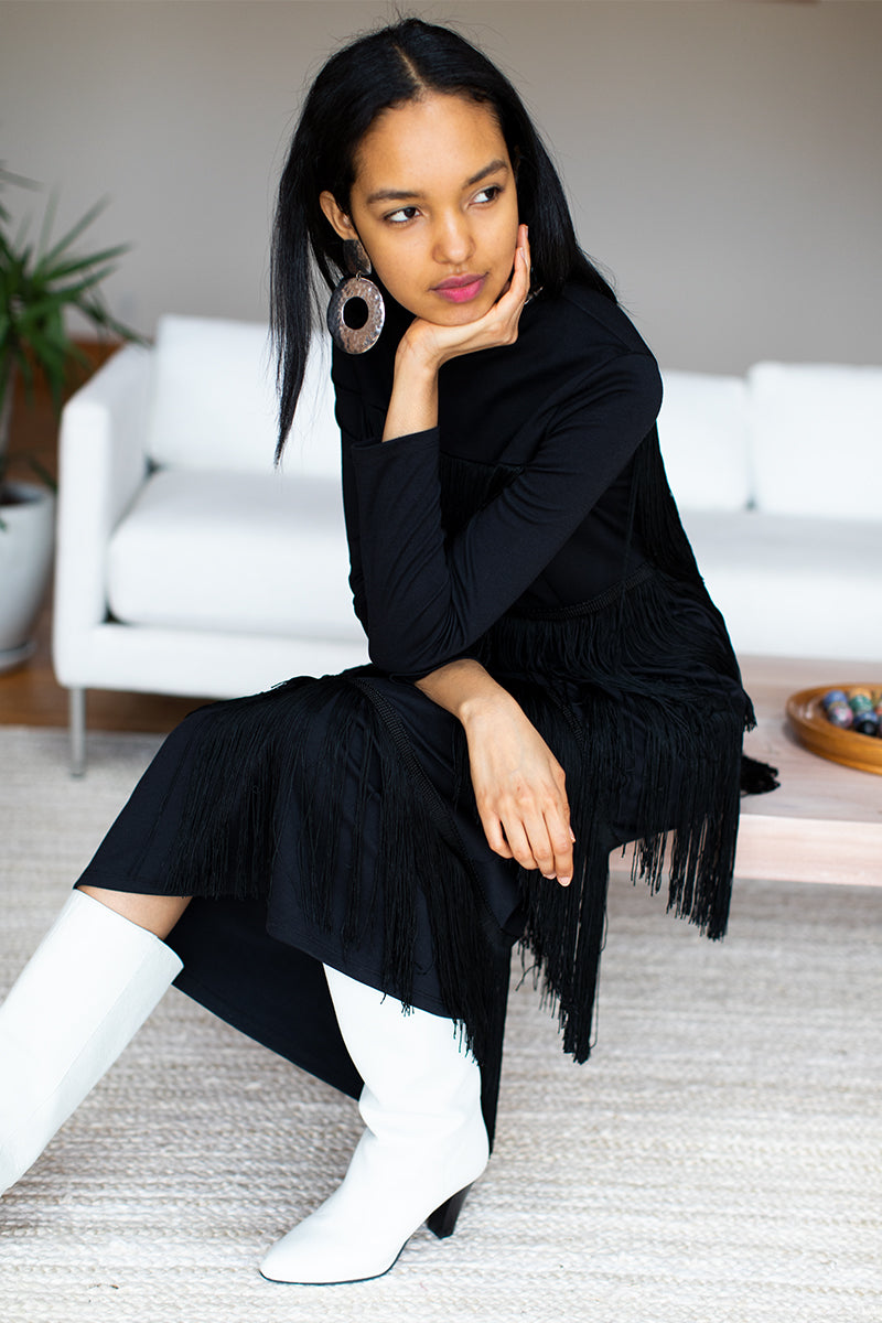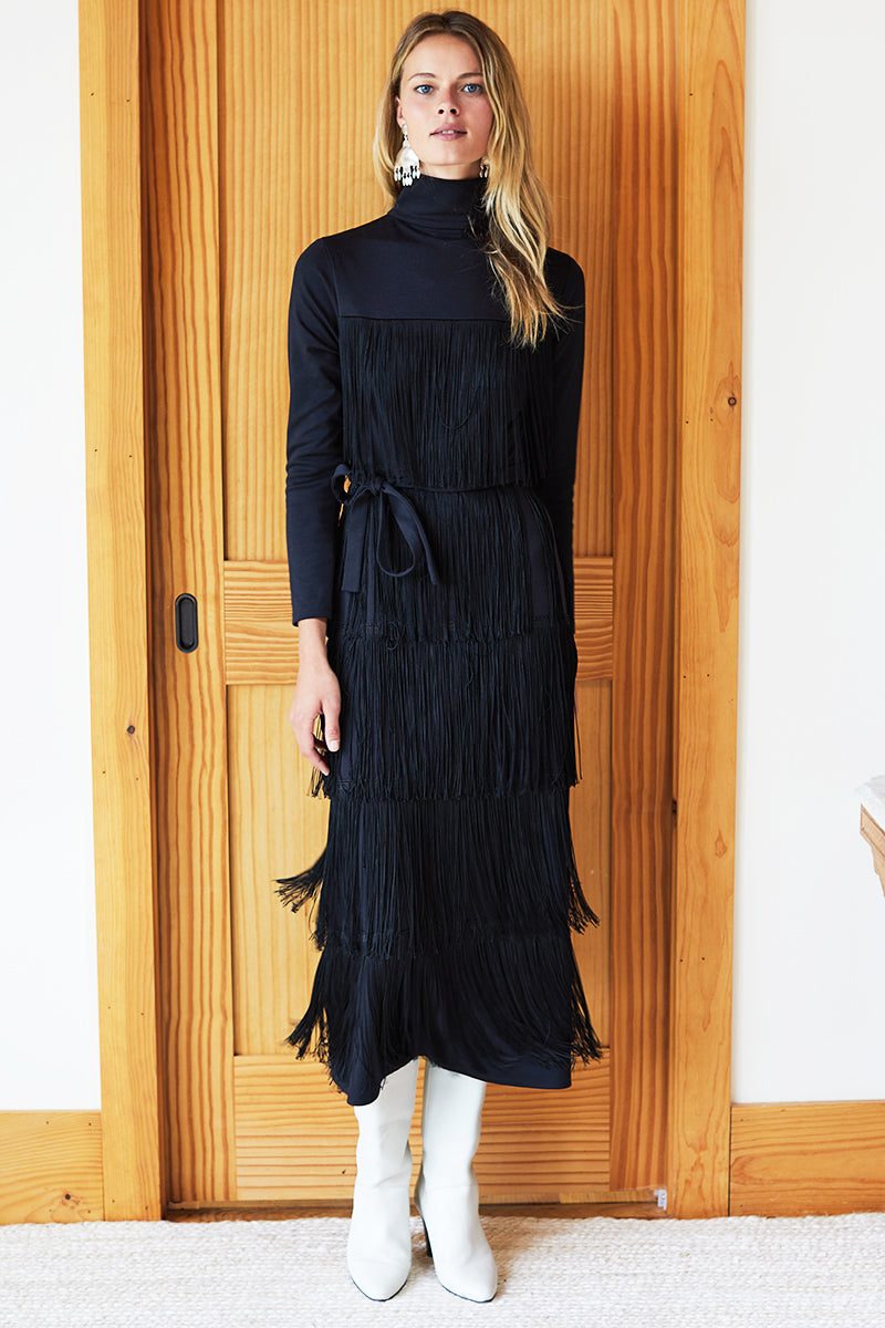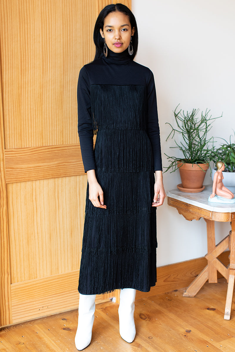 Sleek turtleneck dress - great to have an unforgettable black dress in wardrobe comfortable + danceable for all the parties + special things! Ponte body w/ 10 inch fringe Turtleneck ...