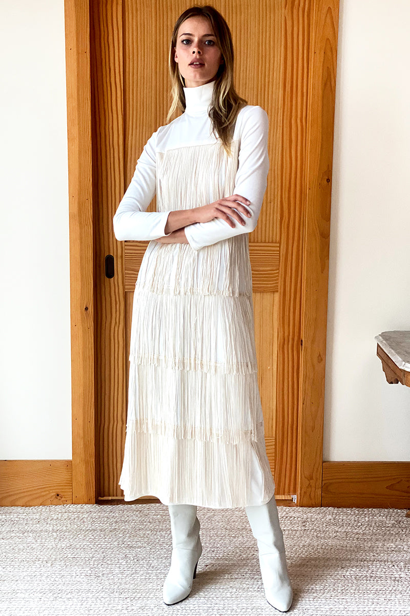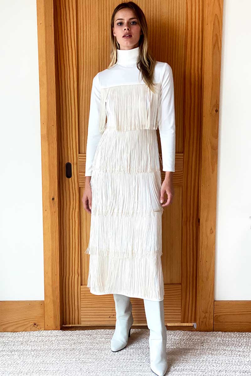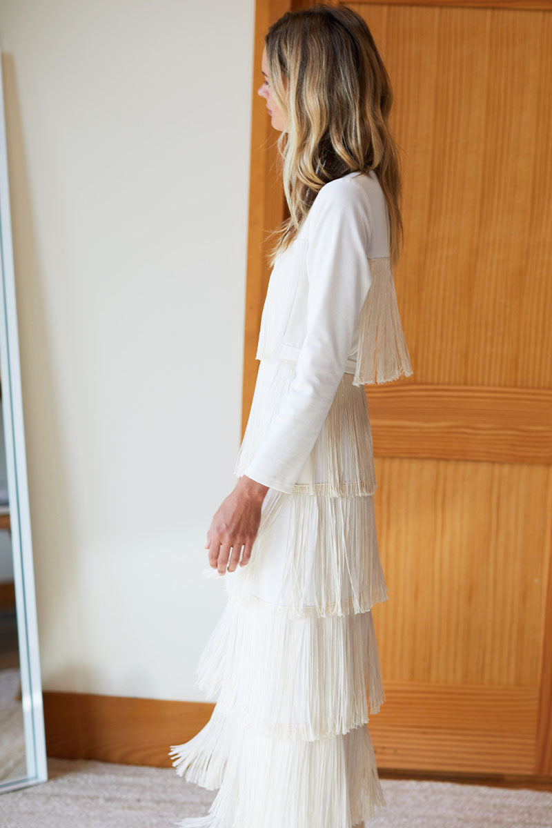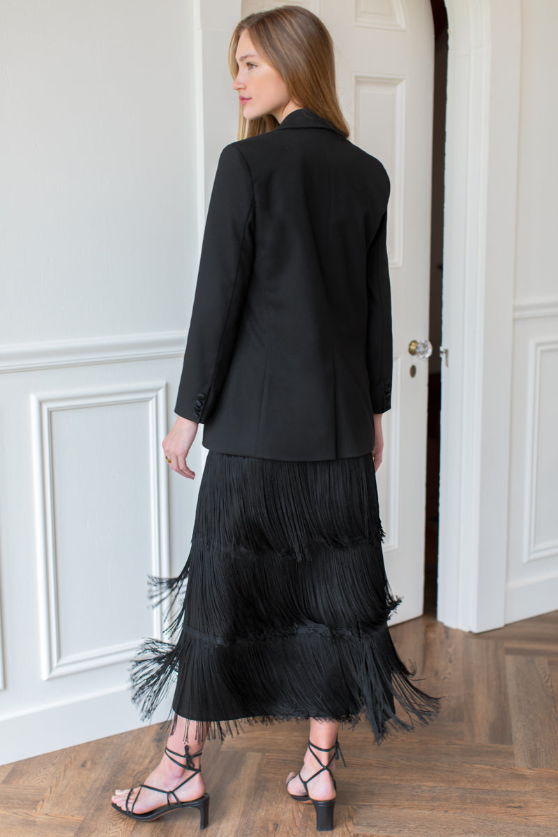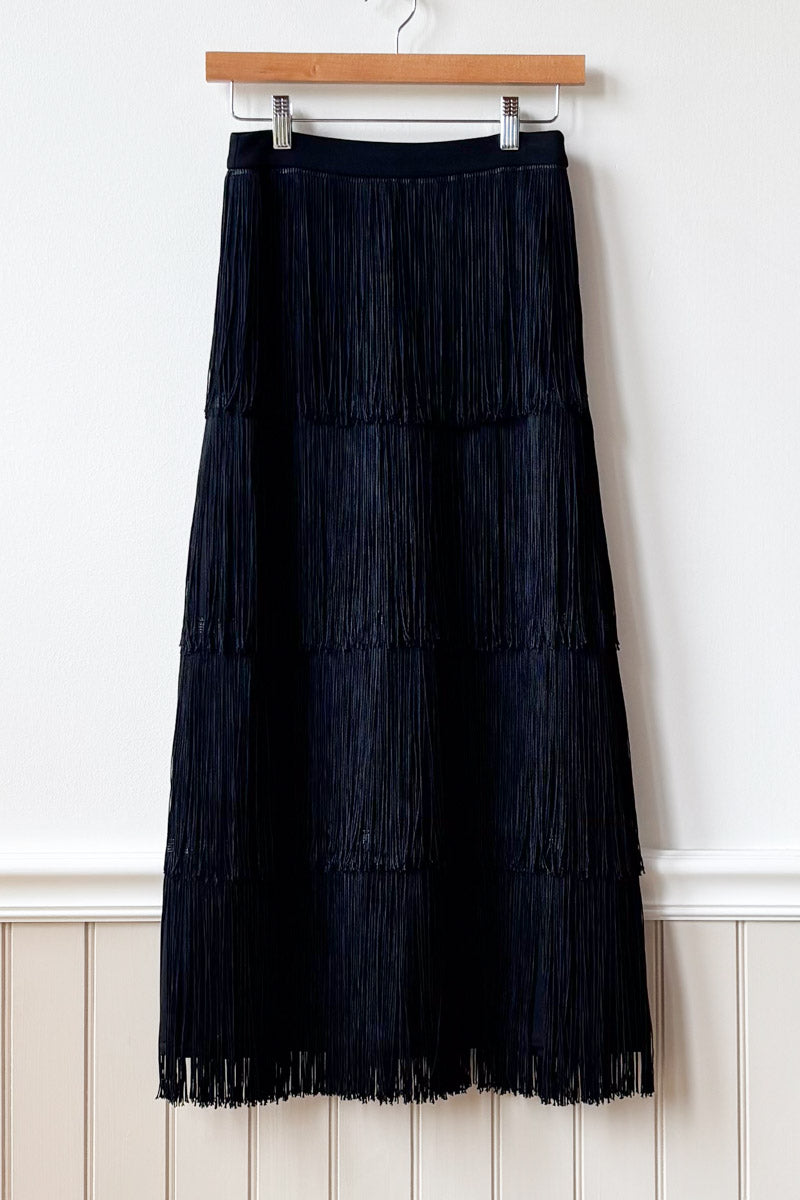 Ponte body w/ 10 inch fringe Back zipper with double hook & eye closure Structured ponte Back vent Unlined Made in NYC XXS: Waist 24", Hip 34 3/4", Length 32...