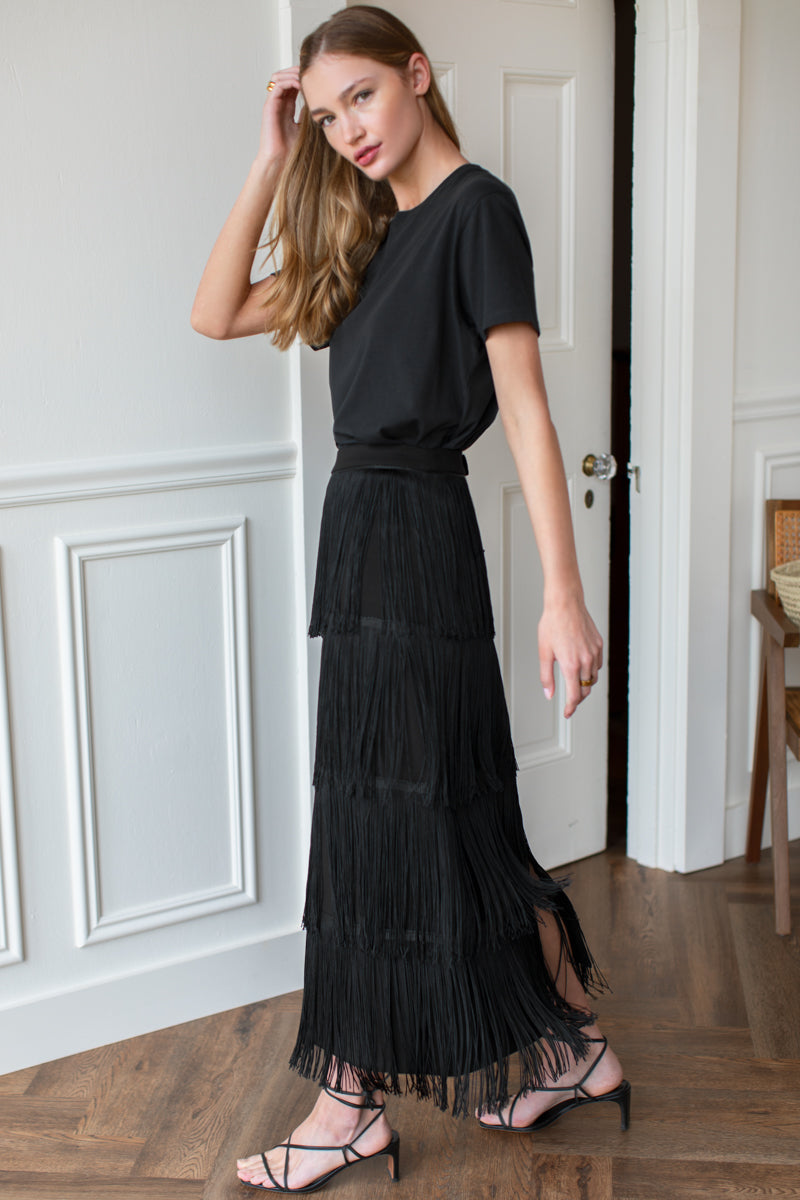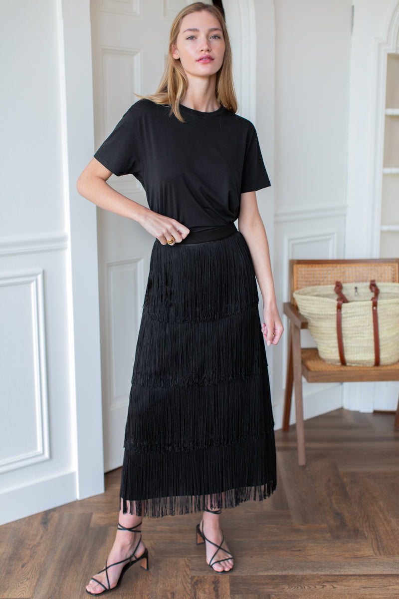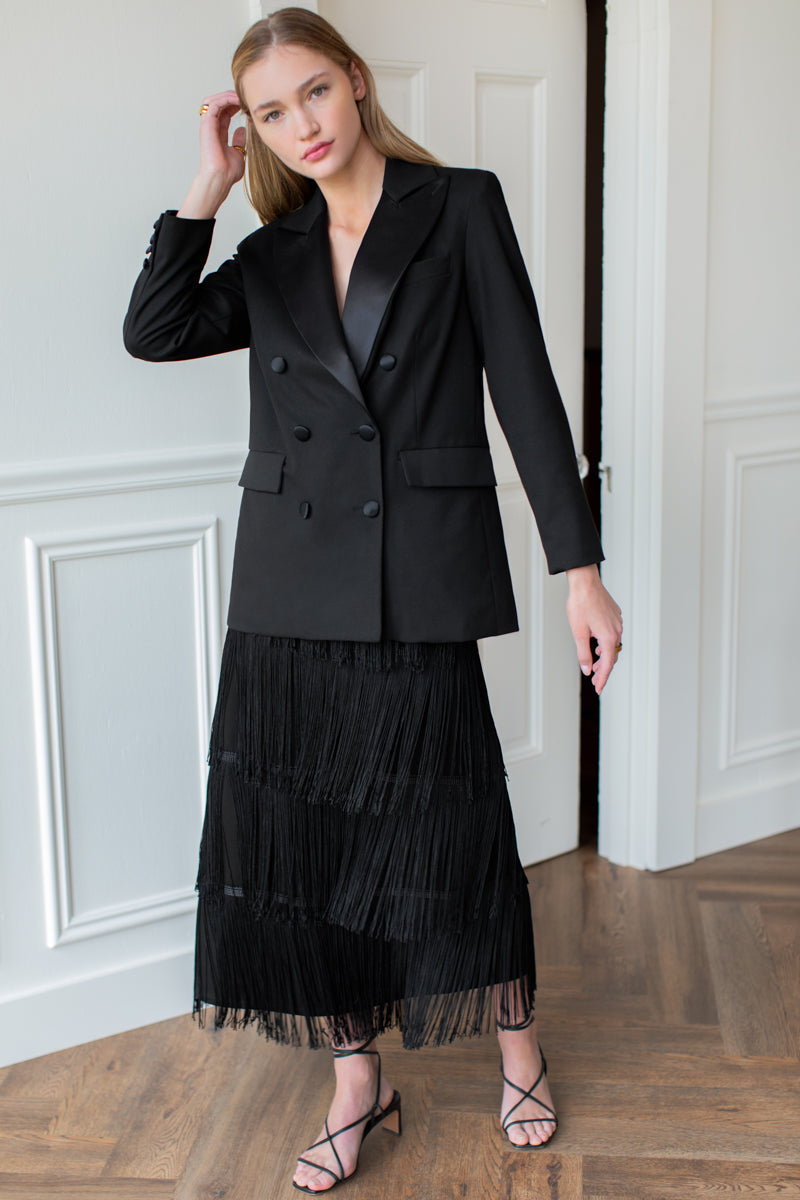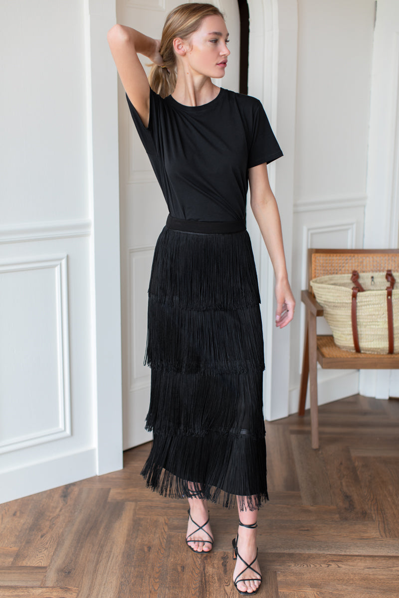 Ponte body w/ 10 inch fringe Back zipper with double hook & eye closure Structured ponte Back vent Unlined Made in NYC XXS: Waist 24", Hip 34 3/4", Length 32...