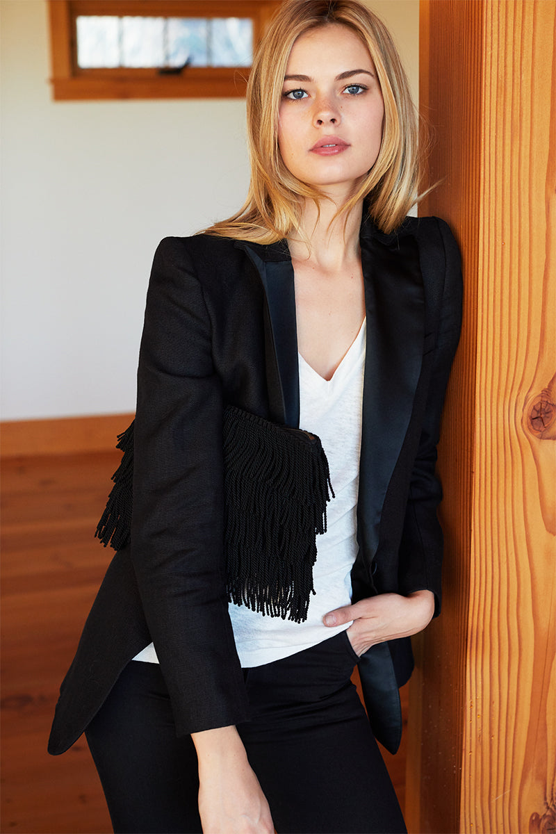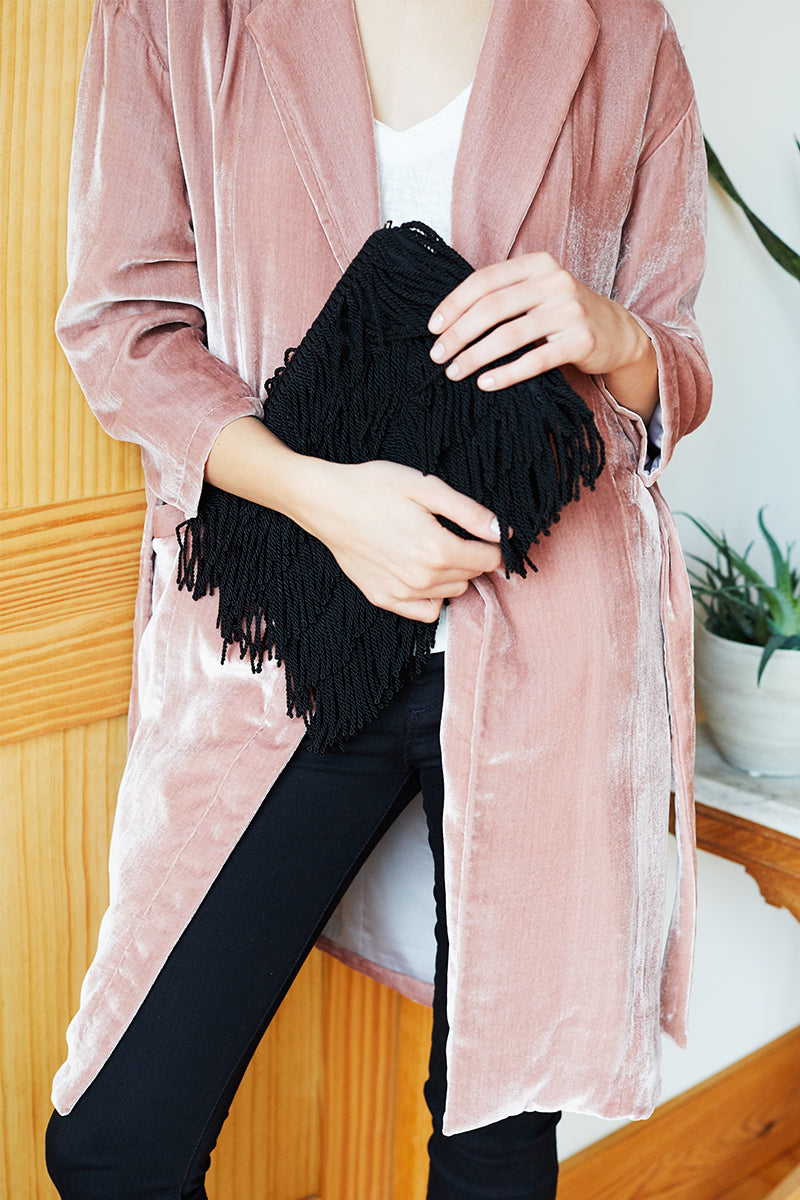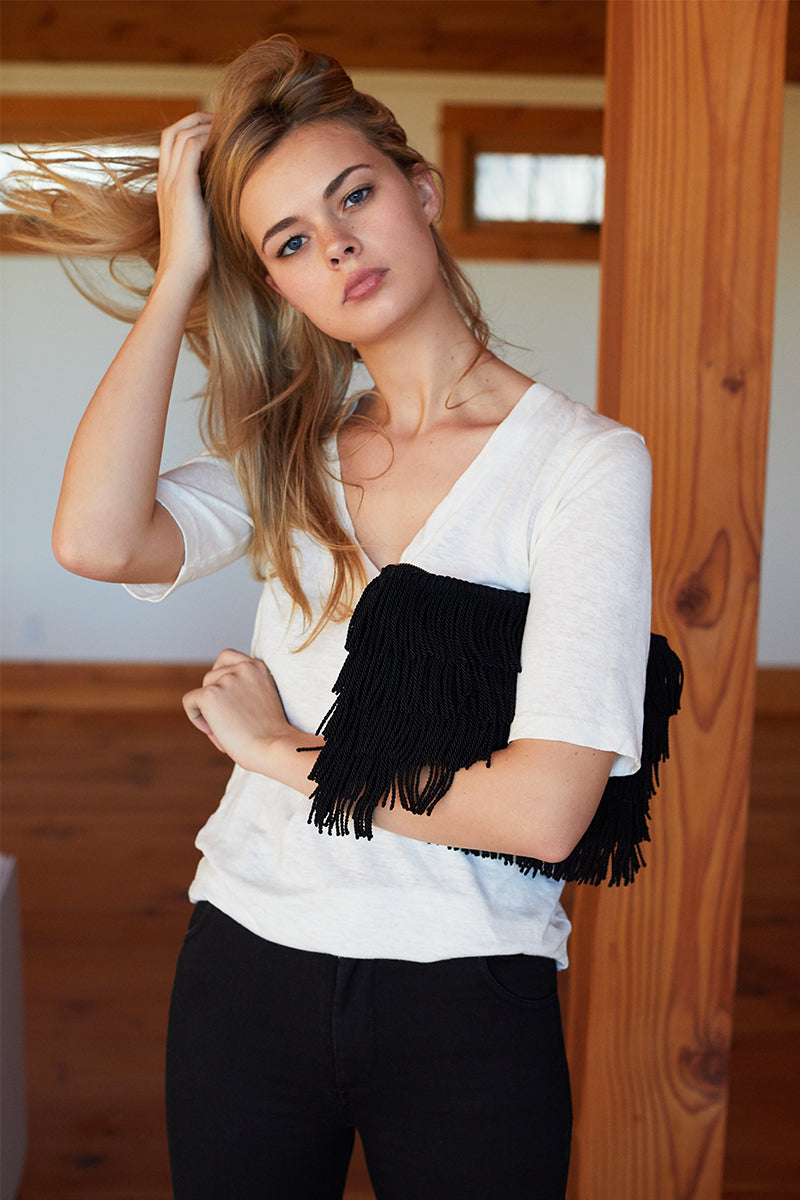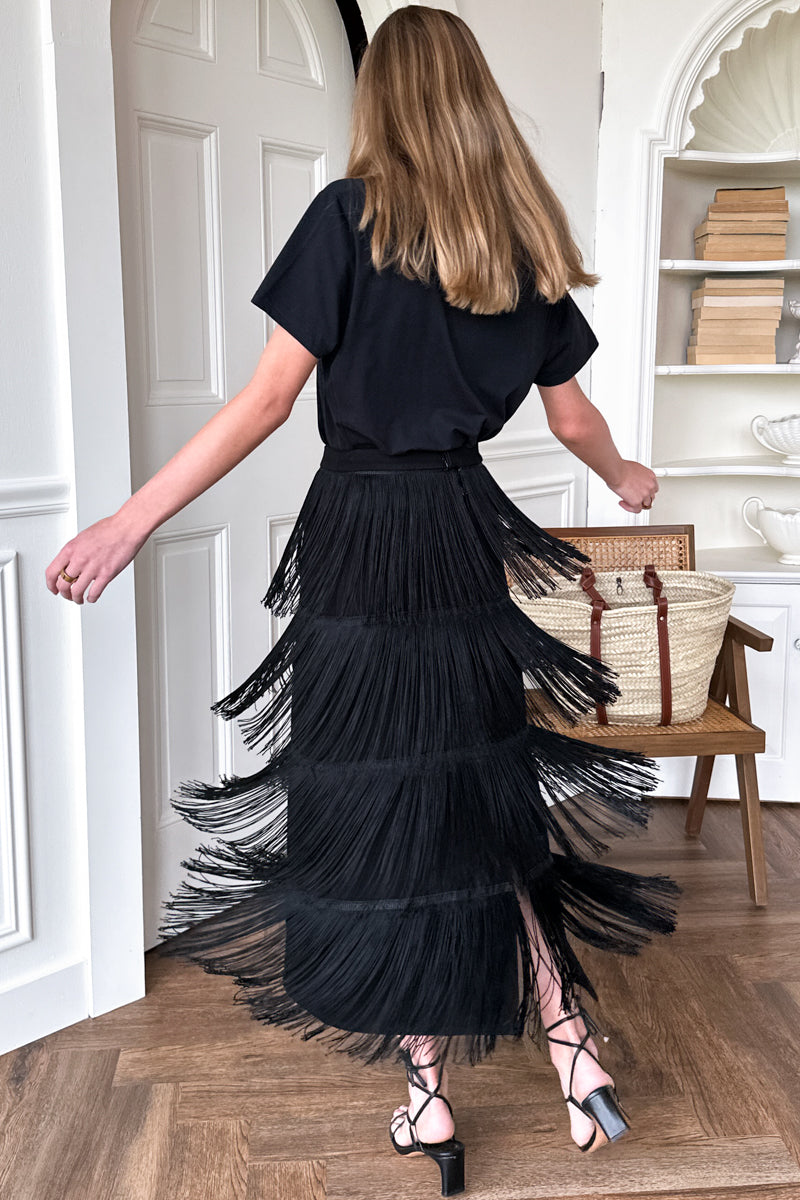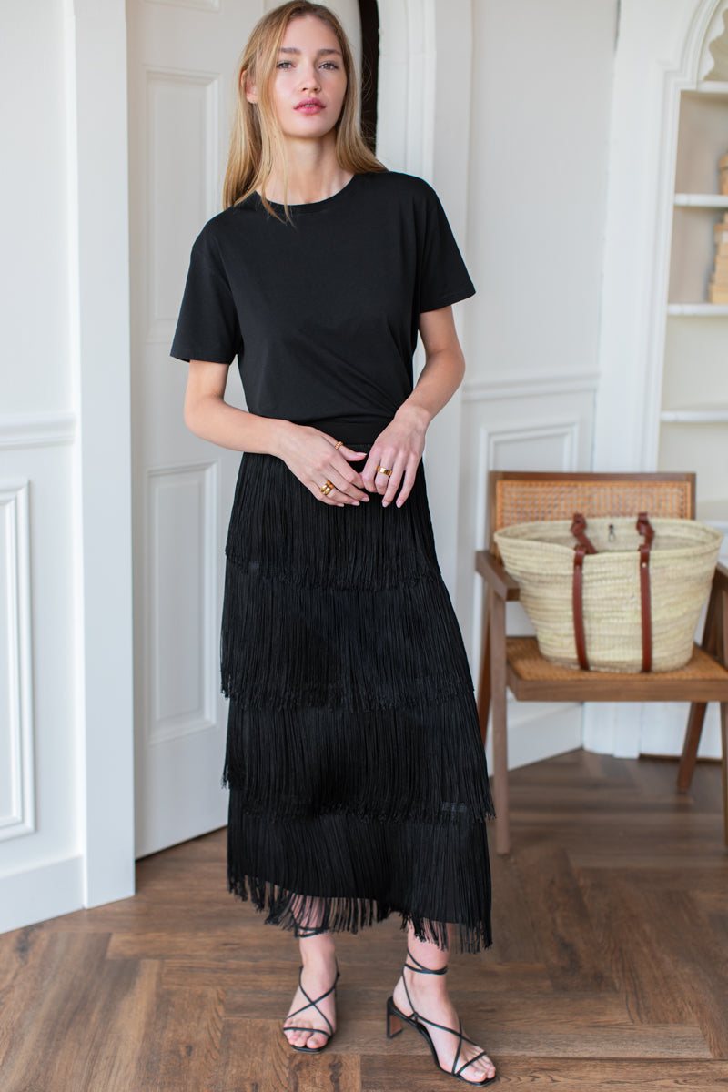 Ponte body w/ 10 inch fringe Back zipper with double hook & eye closure Structured ponte Back vent Unlined Made in NYC XXS: Waist 24", Hip 34 3/4", Length 32...