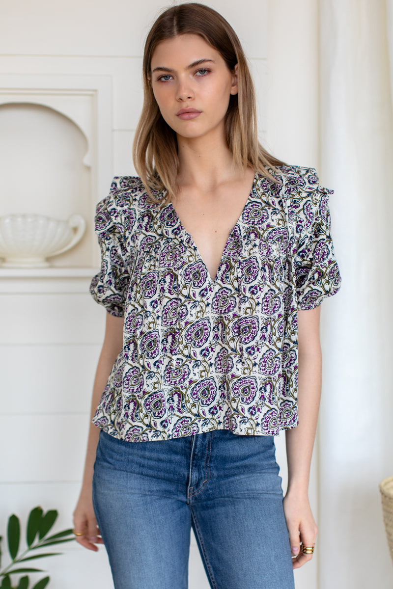 Satin Modal Hand block printed w/ low impact dye Yoked V neckline with tie Ruffle at shoulder Elastic at cuff Relaxed fit through body Unlined Made in Rajasthan, India XS/S:...