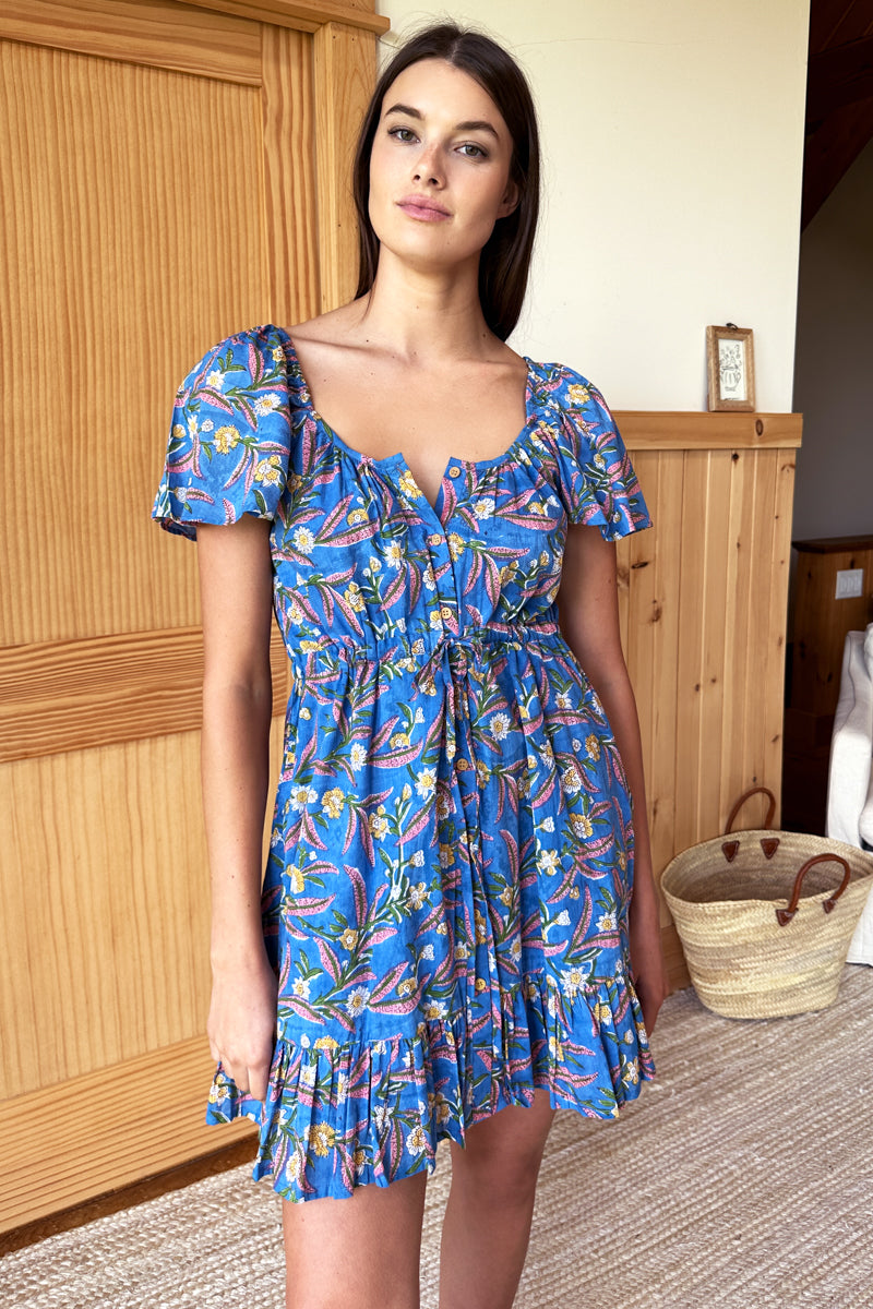 Organic Cotton Button front Ruffle at hem Angel sleeves Bound scoop neckline Adjustable drawstring waist Lined Made in Rajasthan, India