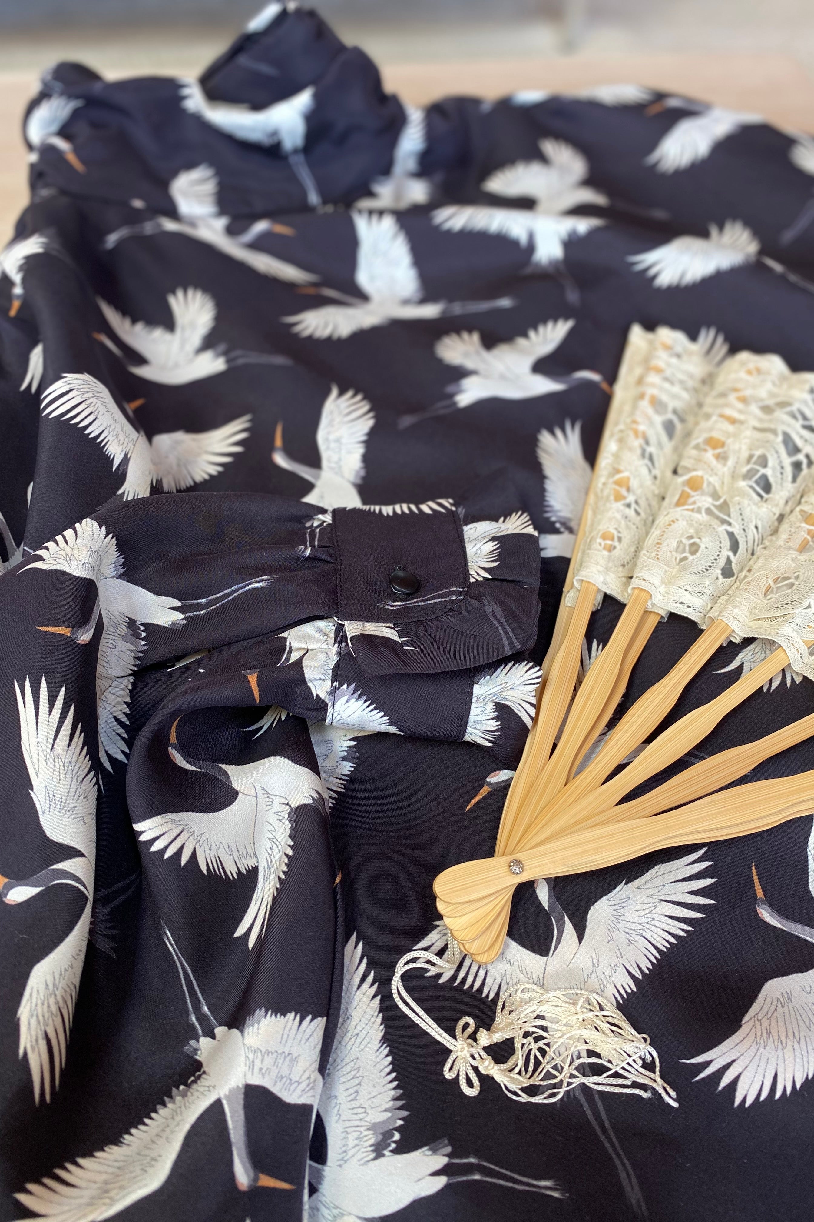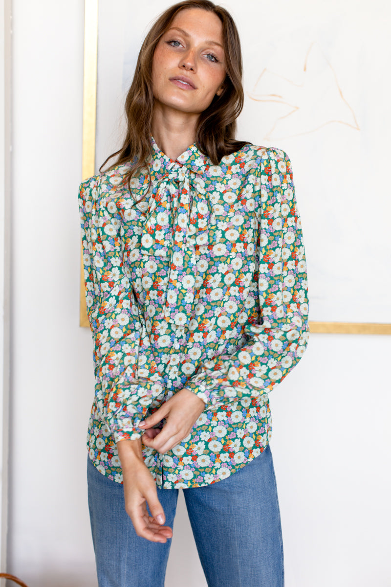 100% Silk Removable tie sash Set in puff shoulder Full button front closure Full length sleeves with button closure at wrist Model is wearing a size small Dry clean Made...