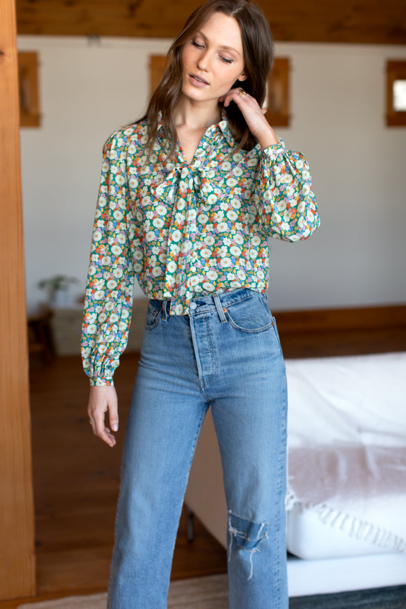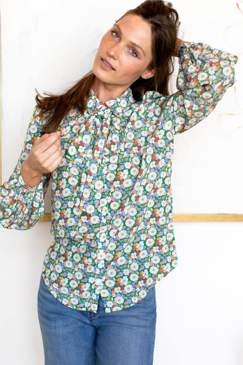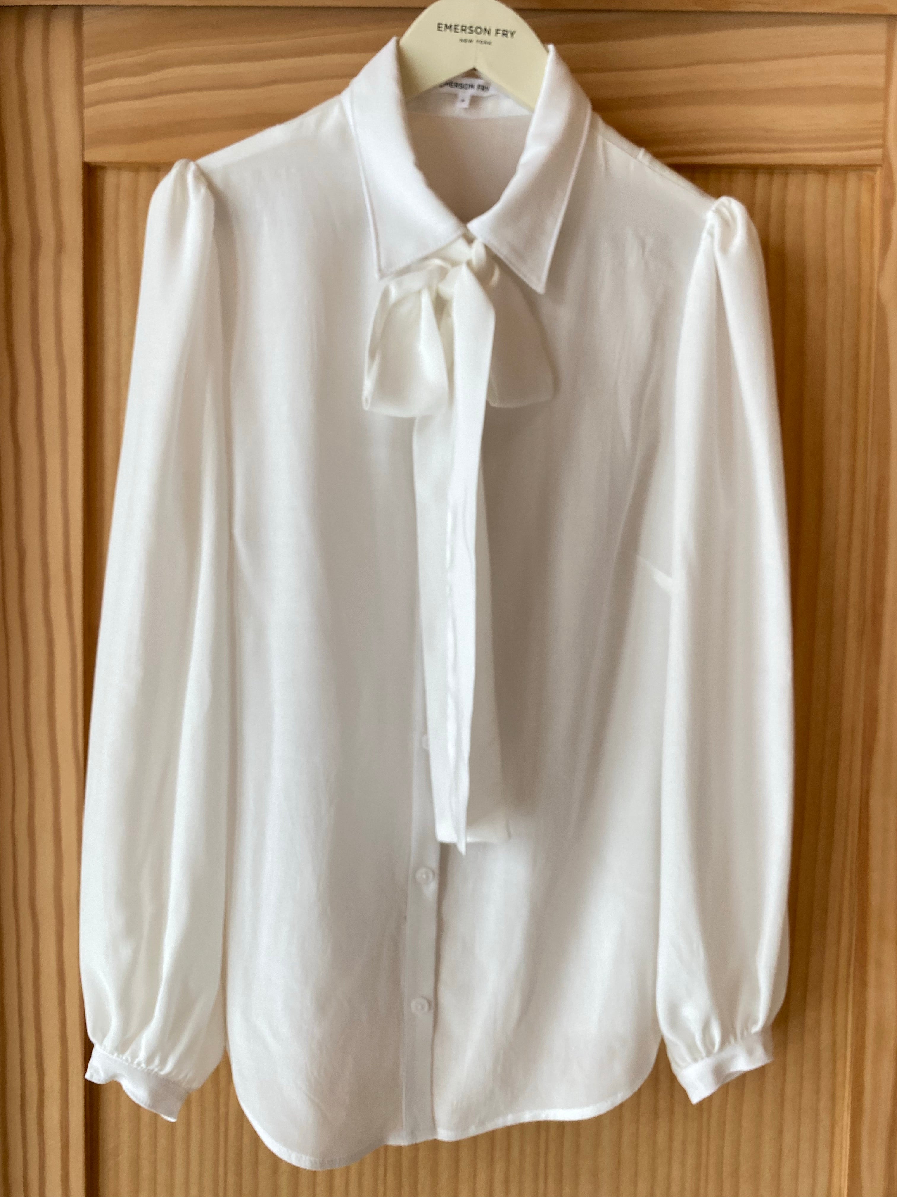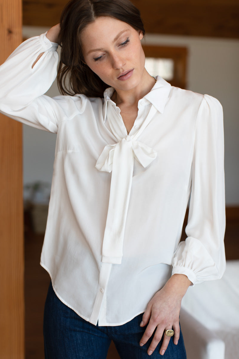 Sustainable Viscose Tie sash Set in puff shoulder Full button front closure Full length sleeves with button closure at wrist Model is wearing a size small Made in NYC Size...