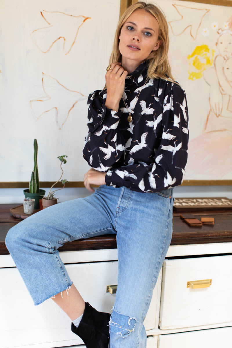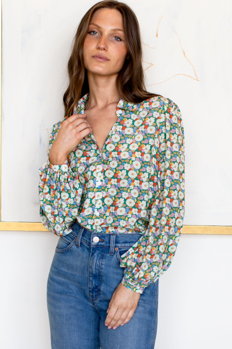 Viscose with luxe silk feel Set in puff shoulder Full button front closure Full length sleeves with button closure at wrist Model is wearing a size small Made in NYC...