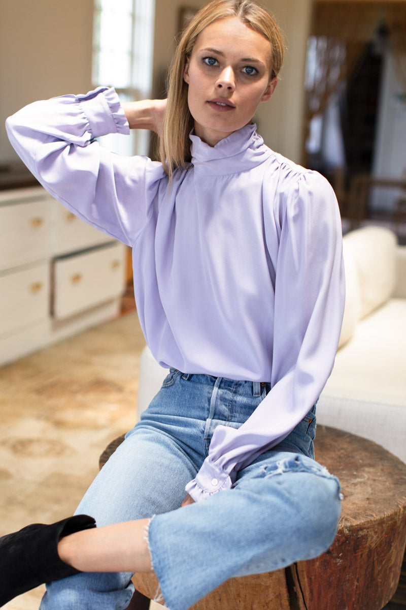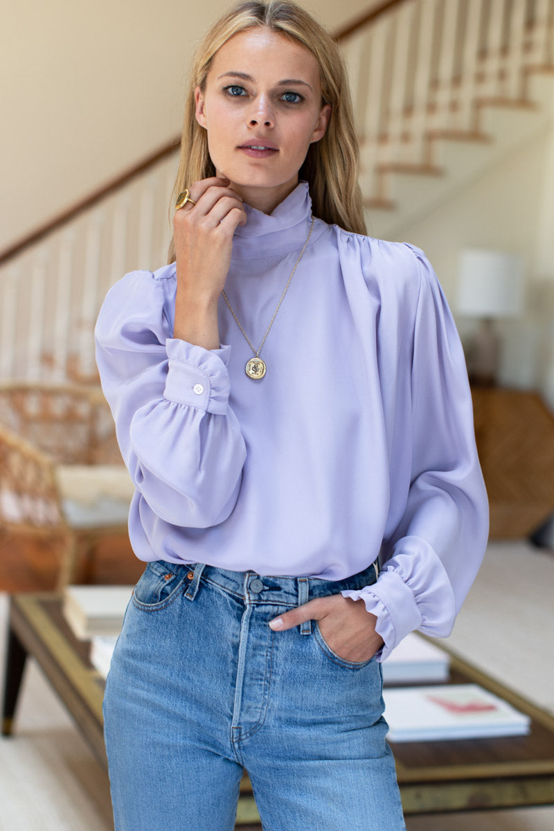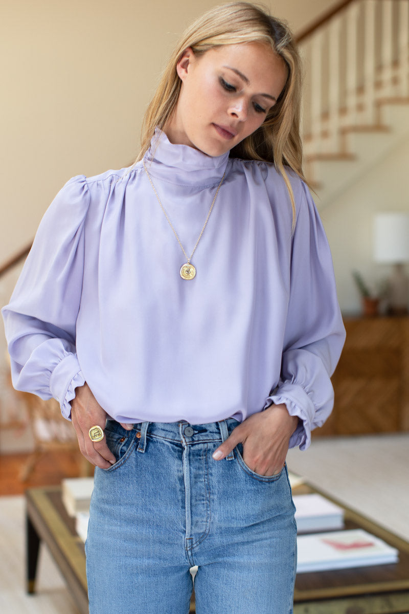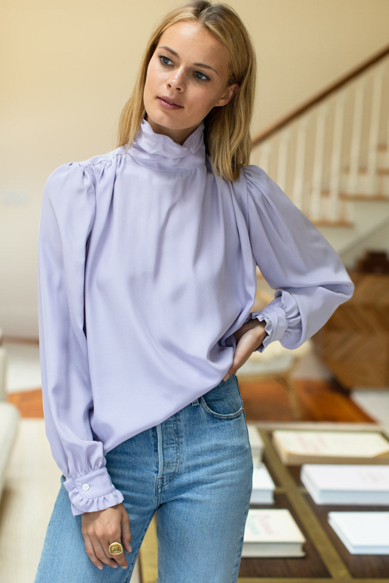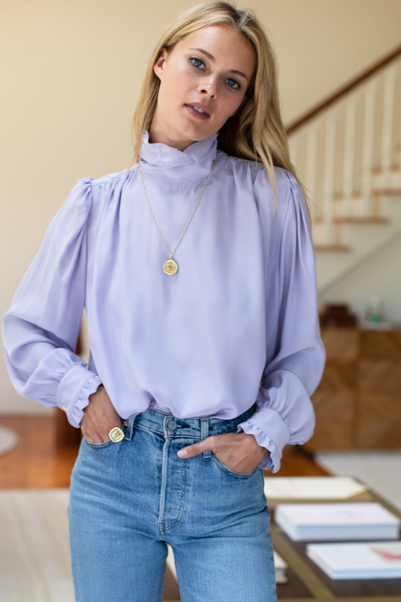 Made from 100% Charmeuse Silk Yoked shirred shoulder High collar with button closure in back Blouson sleeve with button closure and petite ruffle detail Removable neck tie Sizing down recommended...