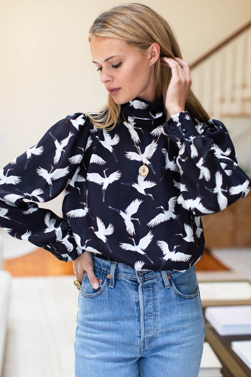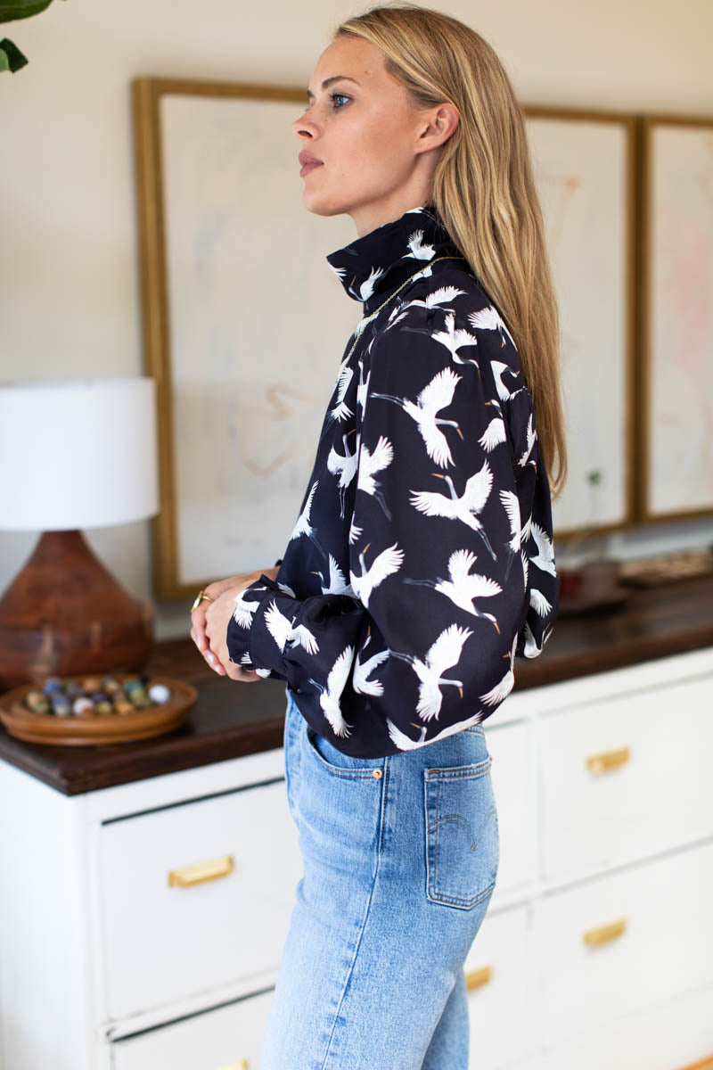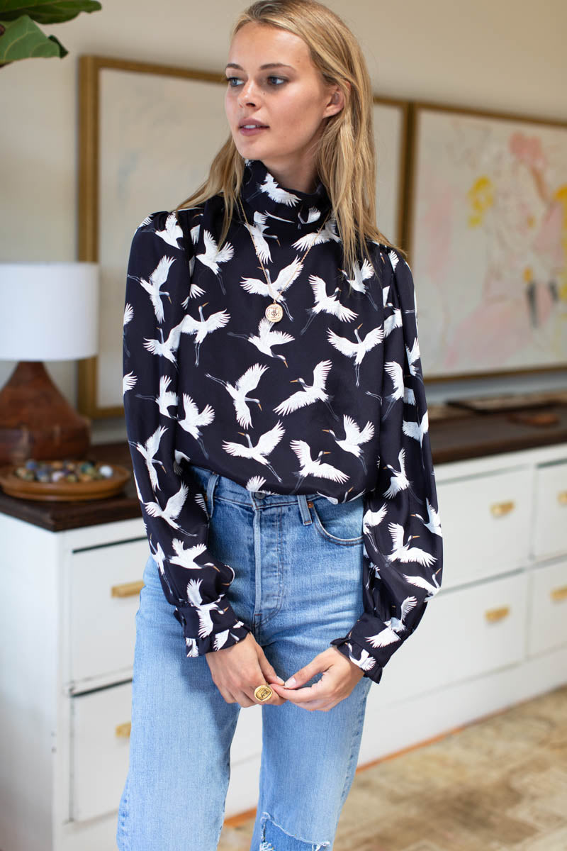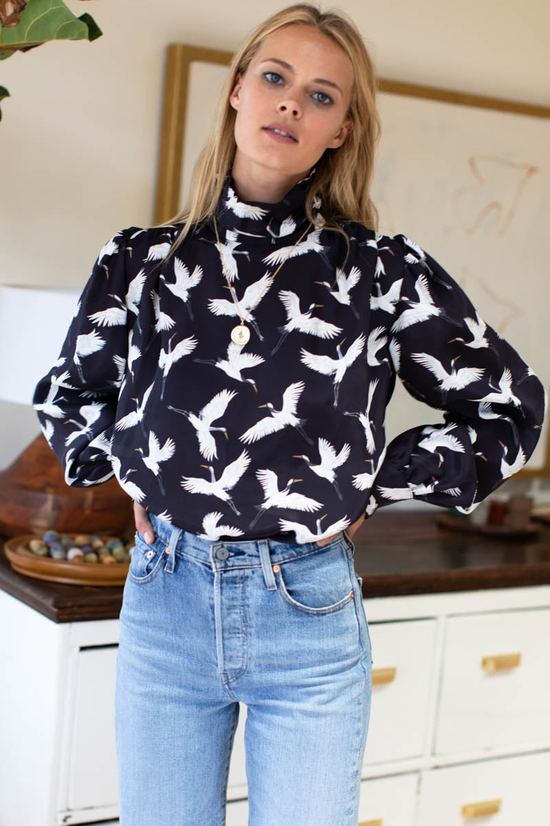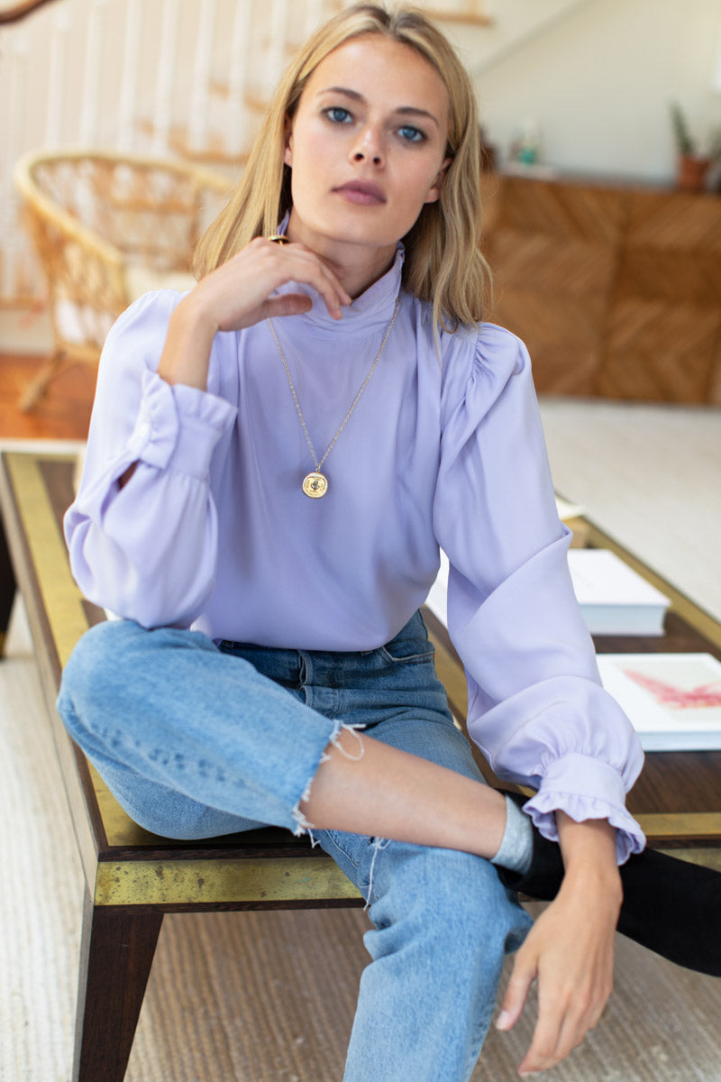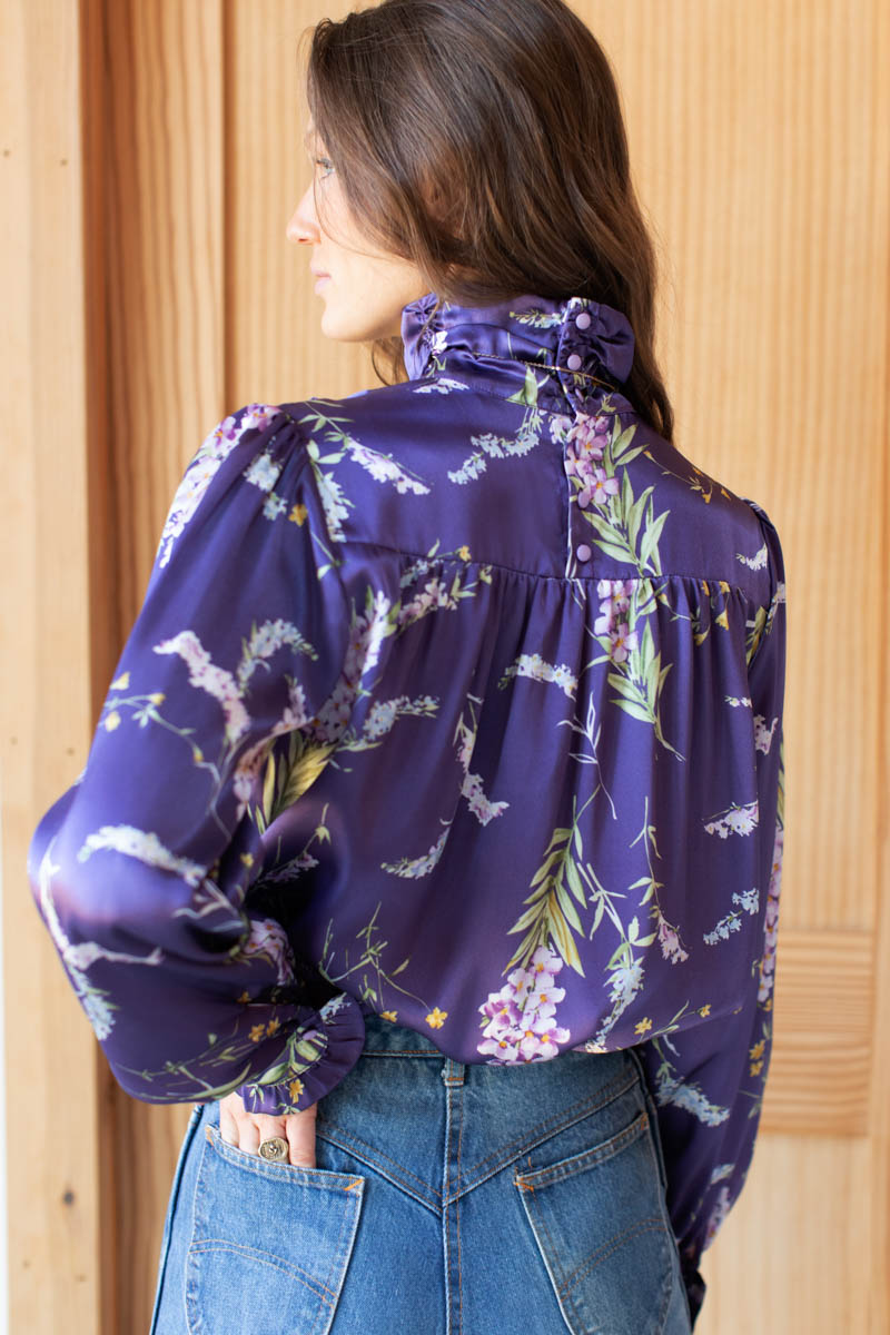 Made from 100% Charmeuse Silk Yoked shirred shoulder High collar with button closure in back Blouson sleeve with button closure and petite ruffle detail Removable neck tie Sizing down recommended...