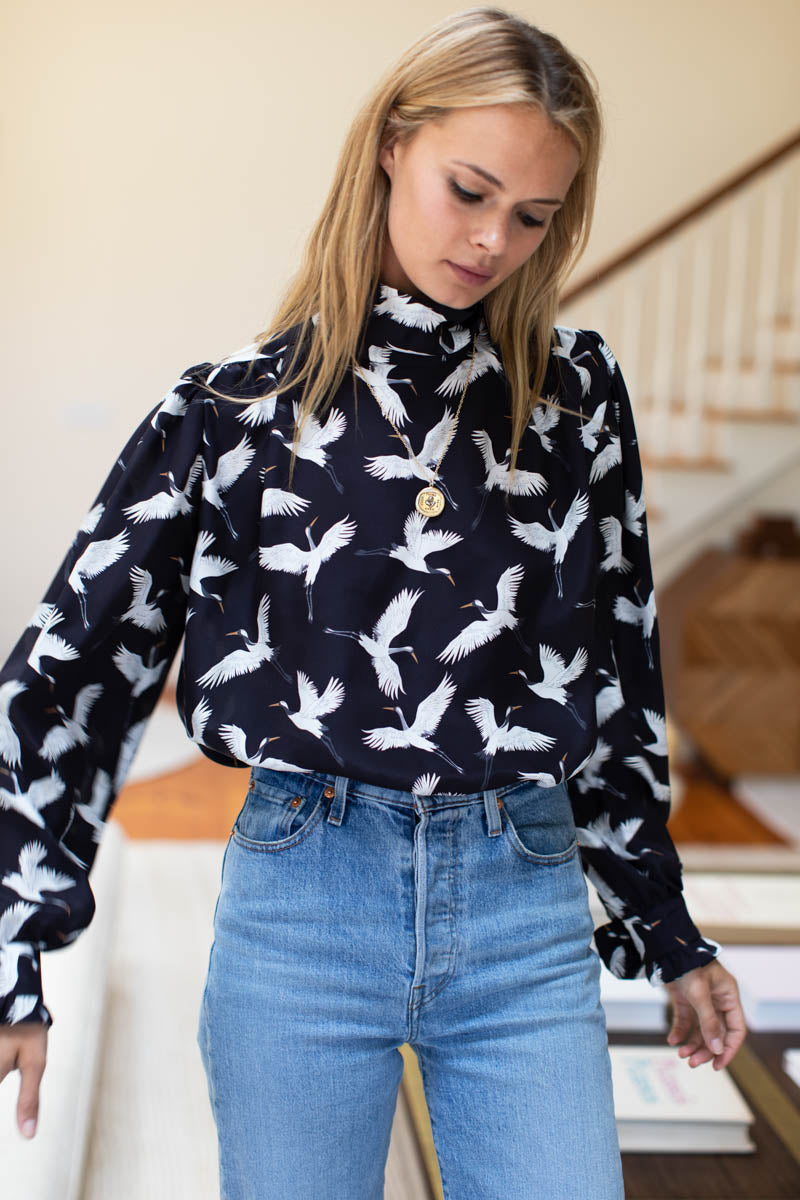 Sustainable Viscose Set in puff shoulder Full button front closure Full length sleeves with button closure at wrist Model is wearing a size small Made in NYC Size XXS: Bust 35.5”,...