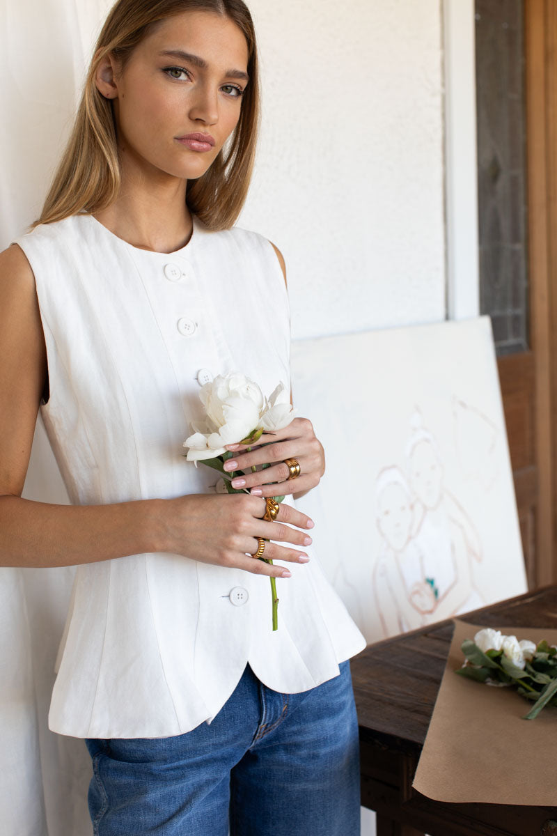 100% Washed Linen Button front Scoop neckline with elastic at shoulder Shirred waist with attached tie Button closure and ruffle detail at cuff Lined Made in NYC