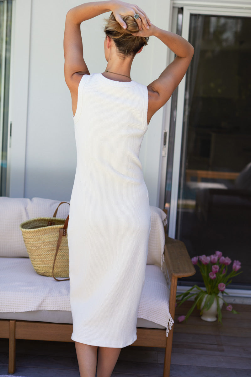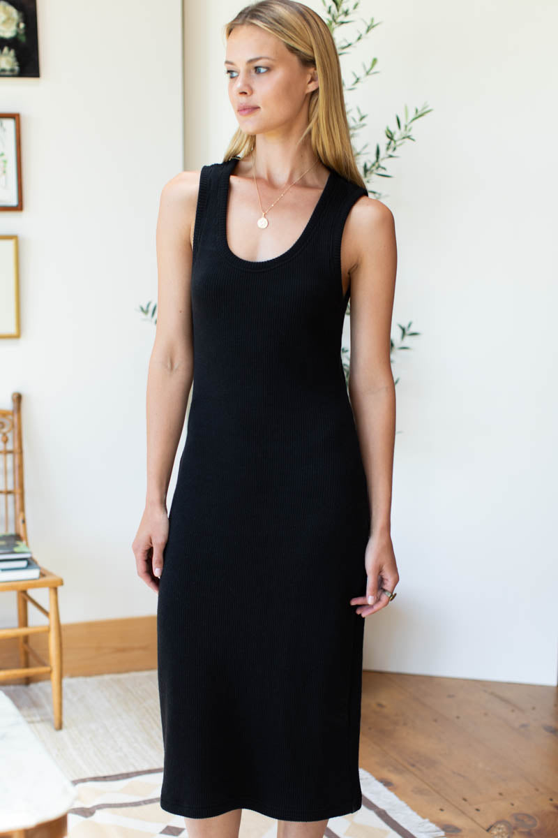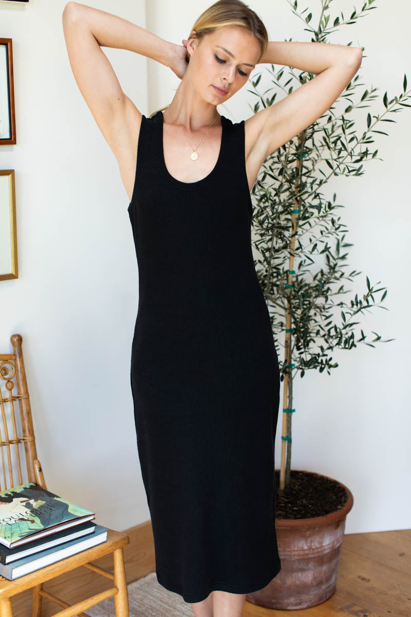 Cotton Spandex rib knit Beautiful texture and soft hand feel Great layering dress under sweaters in fall/winter Classic scoop neck Midi length Unlined Cozy layering All season dress Measurements taken unstretched...