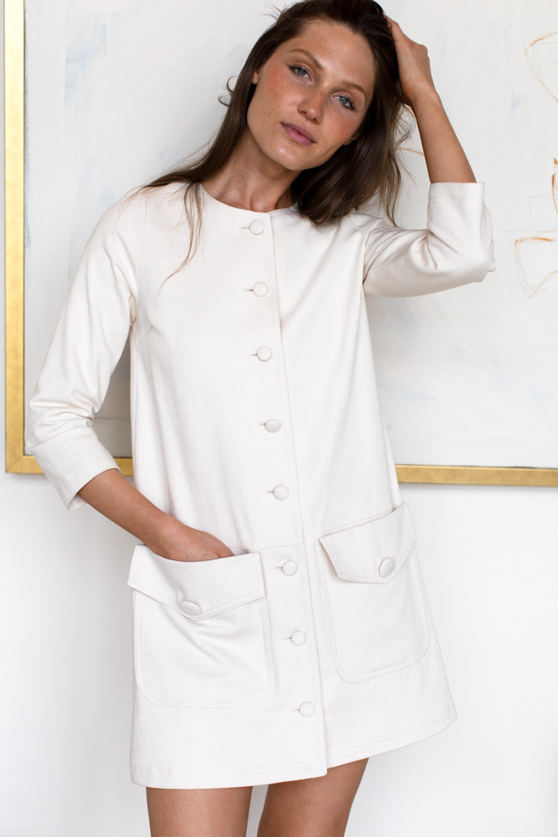 Cotton twill 60s inspired Covered buttons down front A line Large patch pockets with flap + button detail Cropped length sleeves Lined Made in NYC XXS: 32" Bust, 35" Hip,...