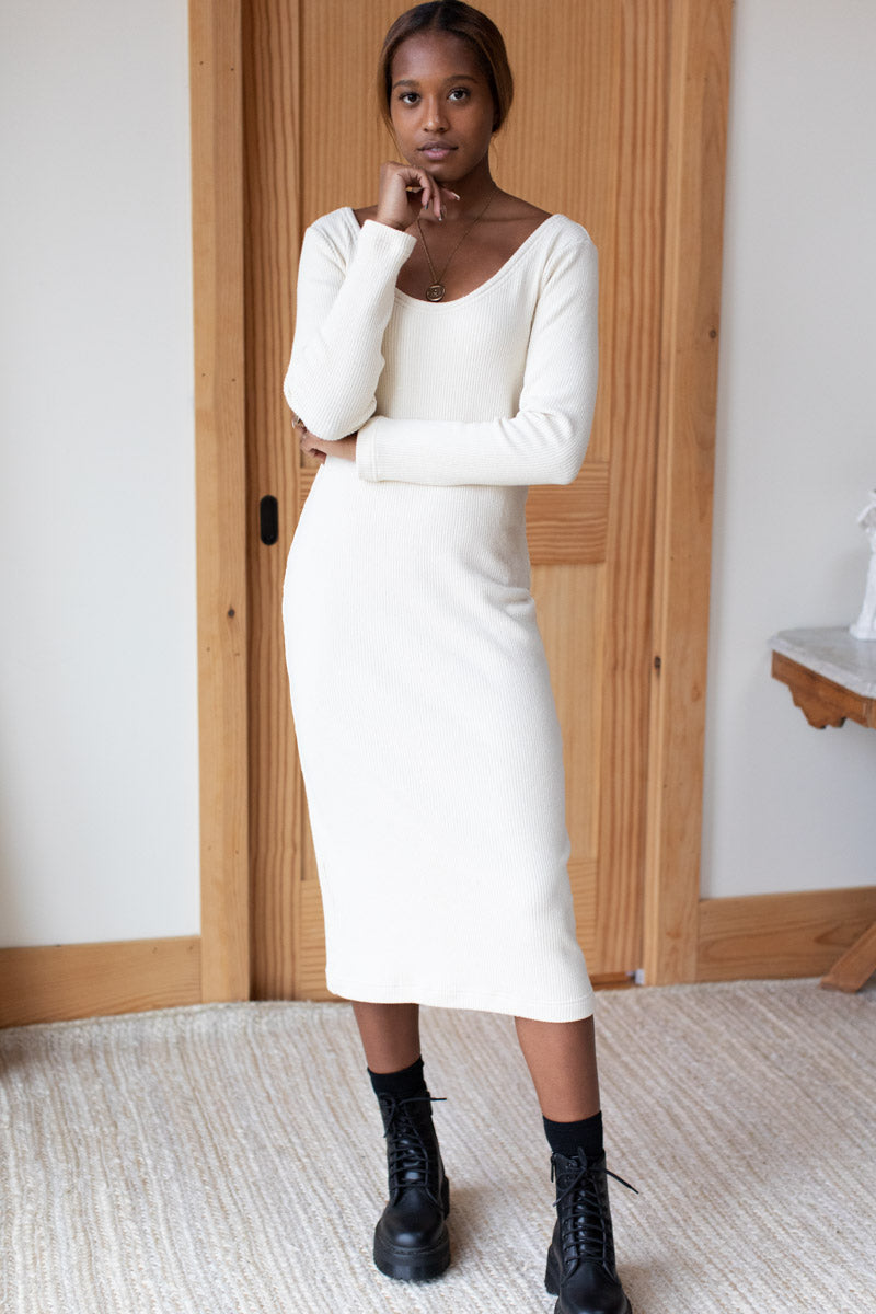 Soft Tencel Cashmere rib knit Sleek, minimalist sweater dress Midi length silhouette Half length sleeves Made in USA