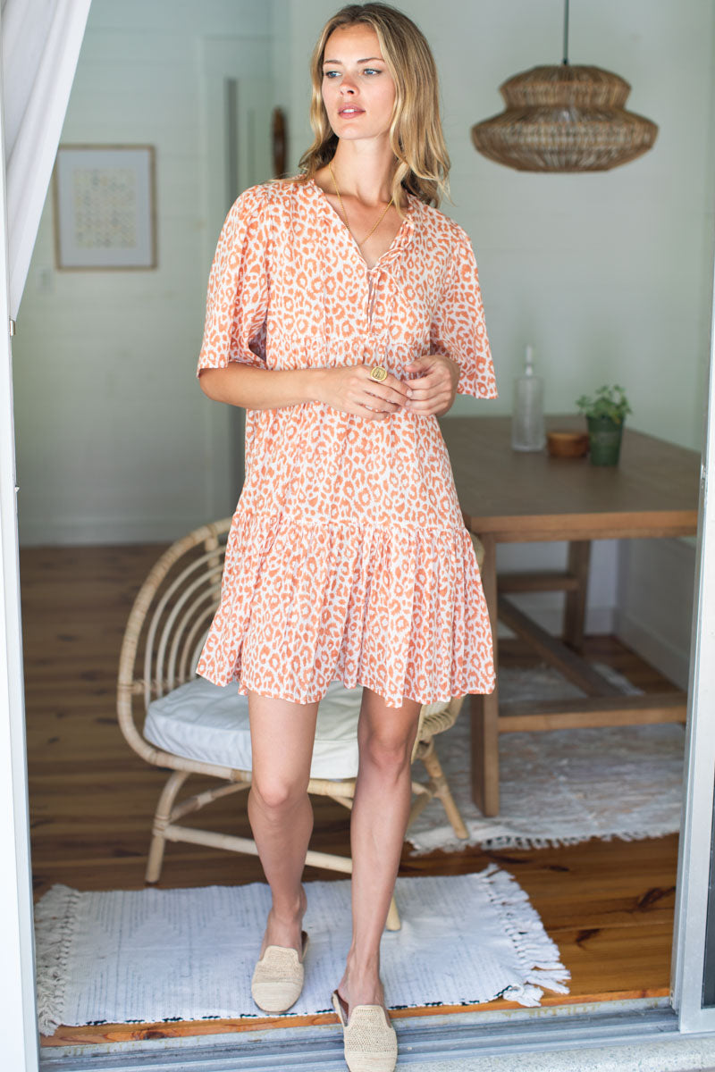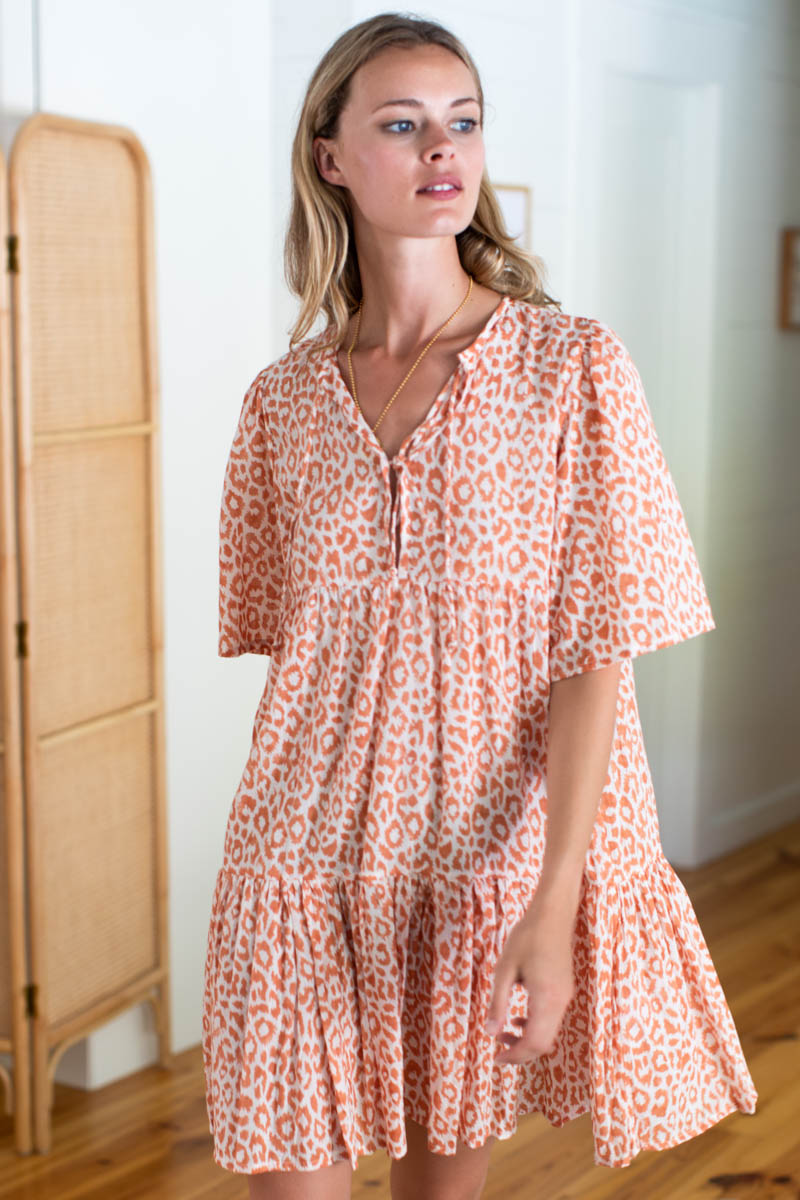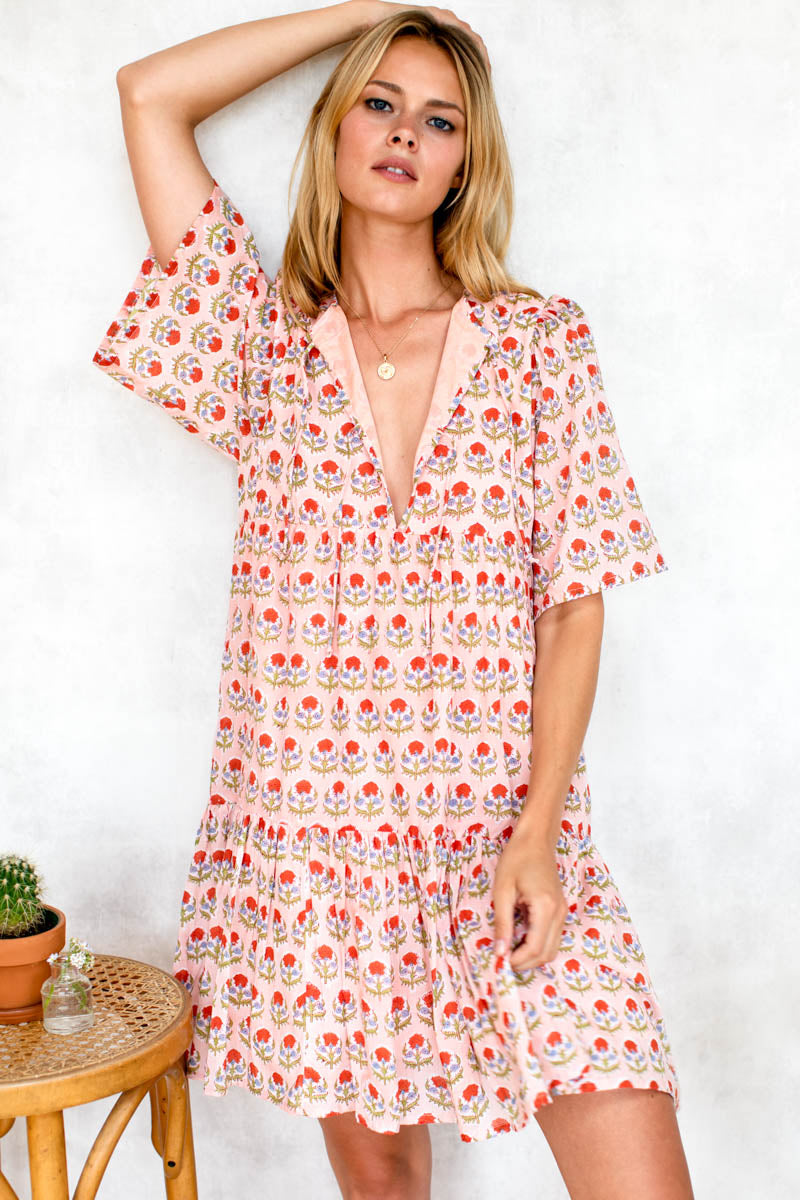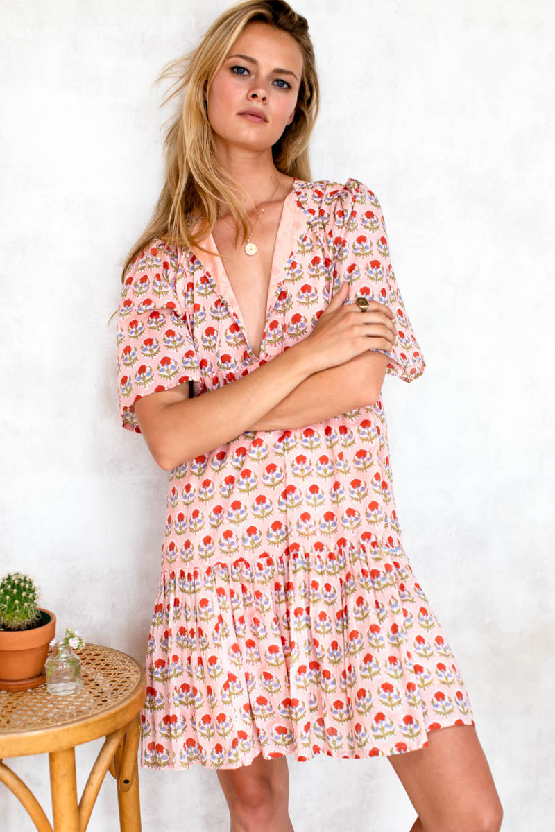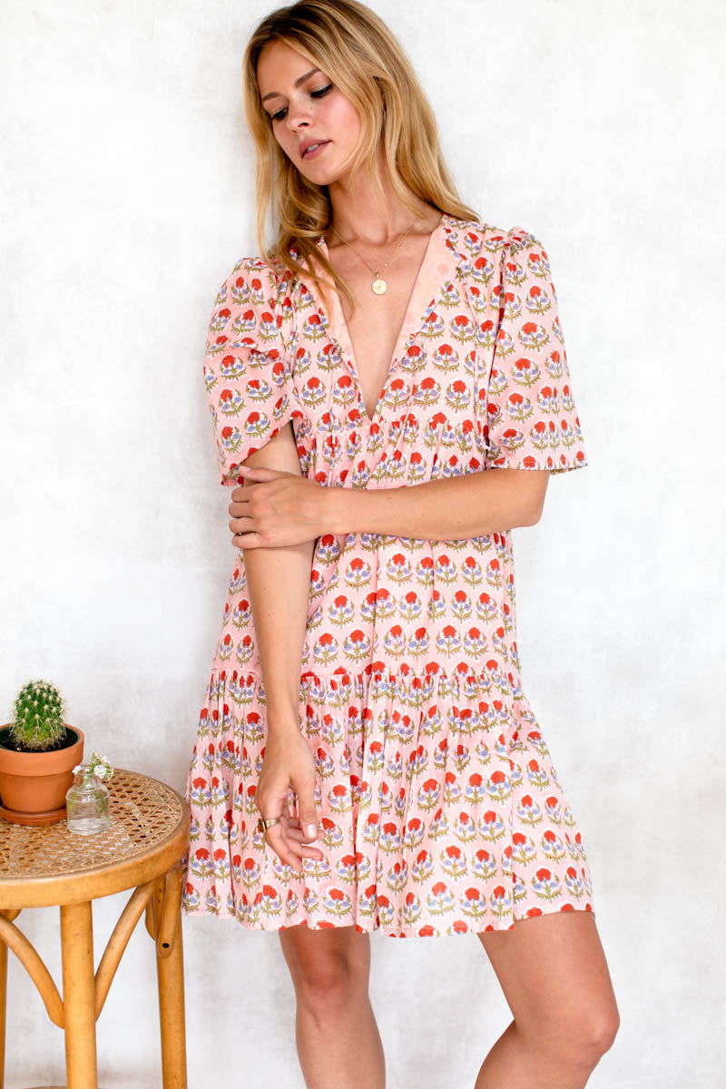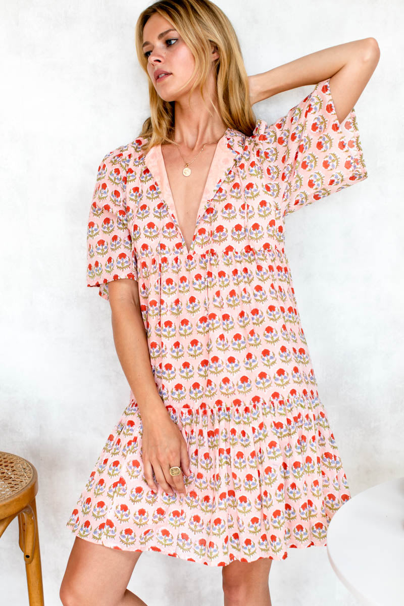 Good to have a little dress that’s airy + special + festive. Organic cotton Hand block printed w/ low impact dye Easy/breezy fit Lined Model is 5'9" and wearing size...
