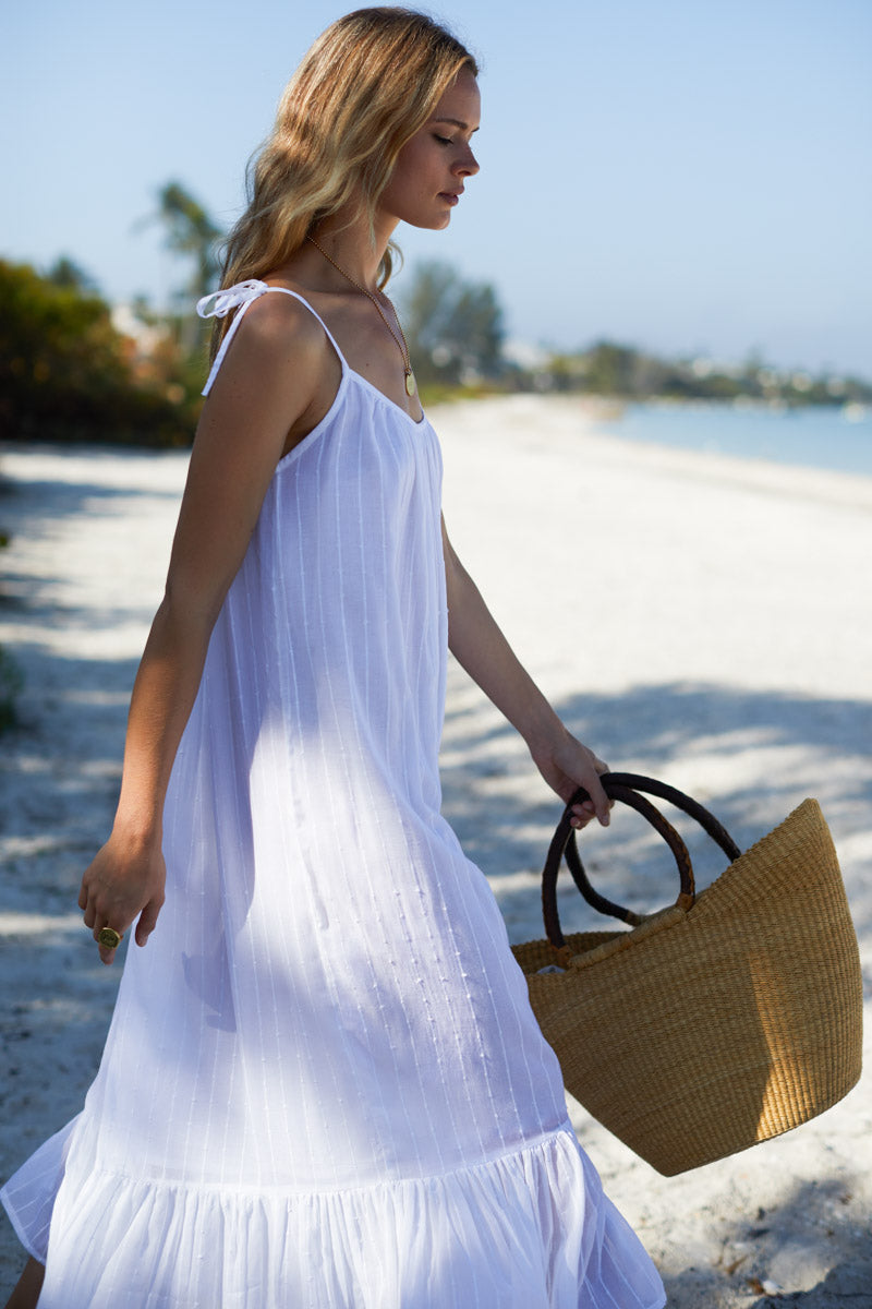 Organic Swiss dot stripe cotton Low impact + ecological dyes Adjustable tie shoulder straps allows for a higher or lower neckline Lined Relaxed breezy fit Beach to Dinner throw on...
