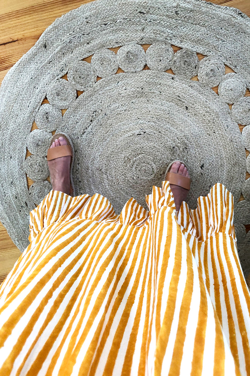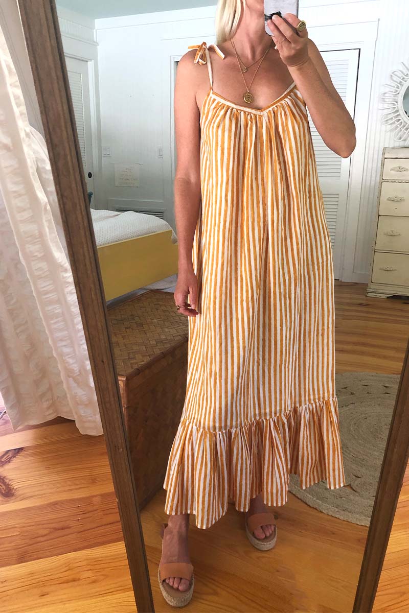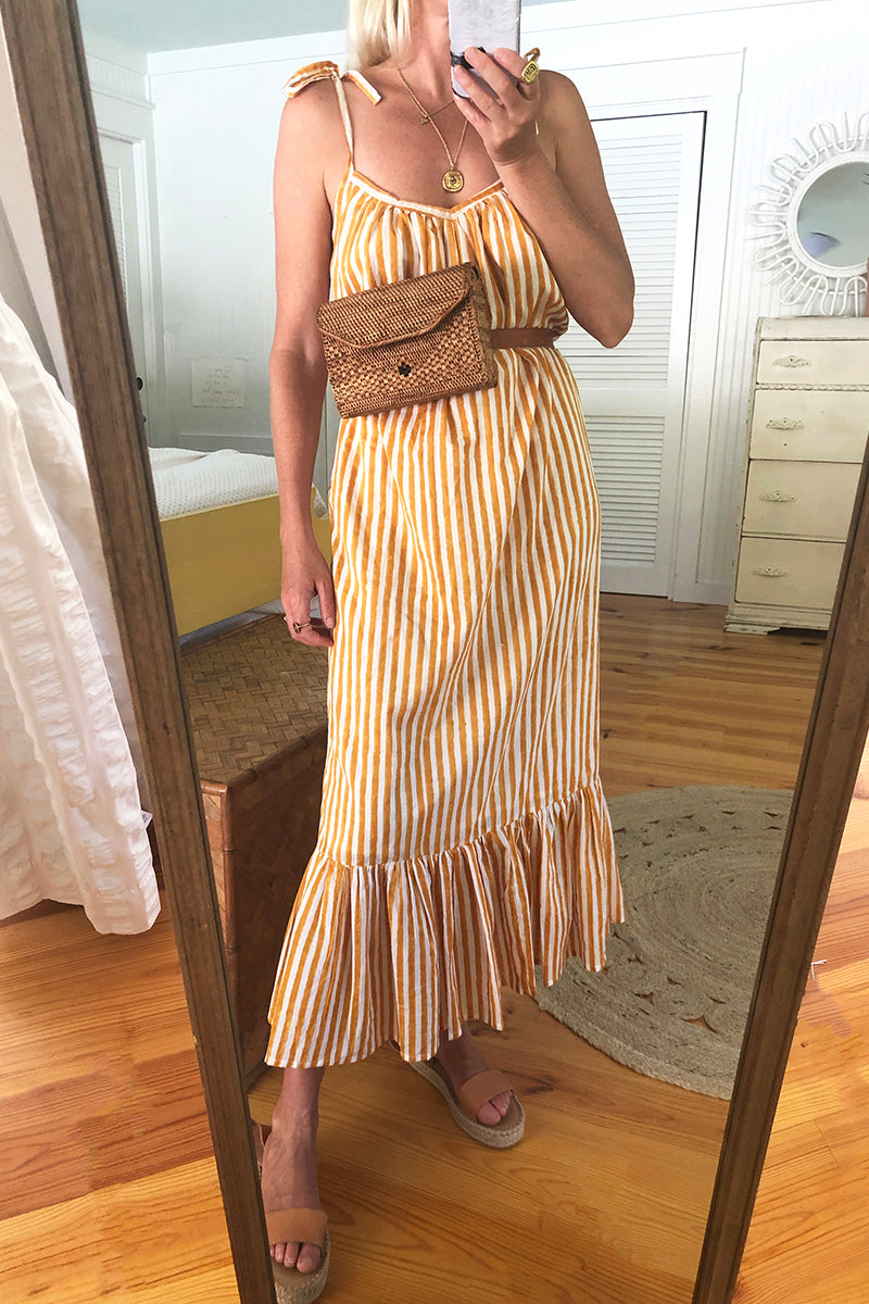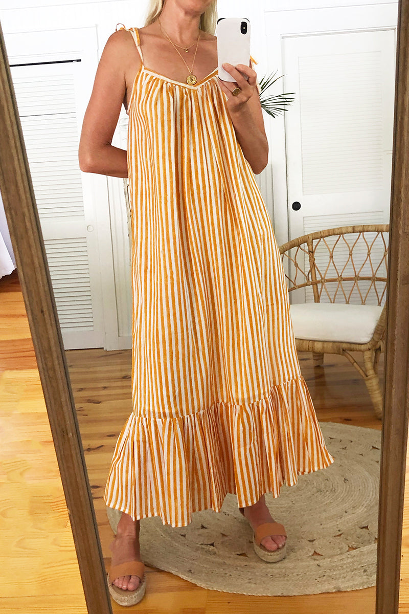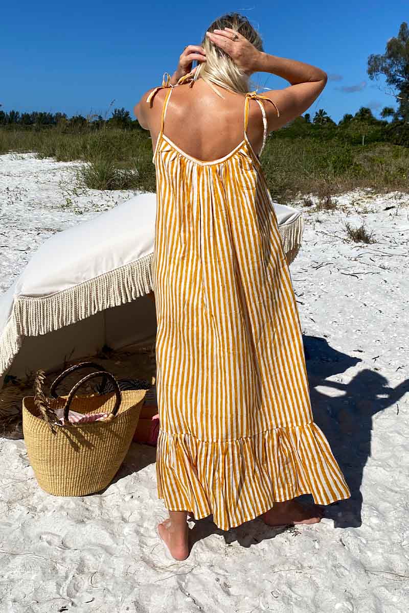 Organic Swiss dot stripe cotton Adjustable tie shoulder straps allows for a higher or lower neckline Lined Model is 5'9" and wearing size xs/s Made in Rajasthan, India Hand wash...