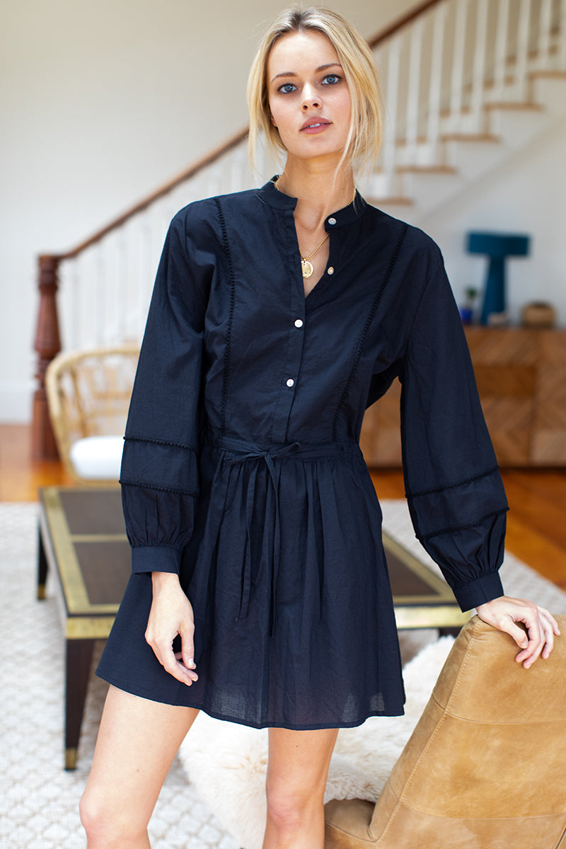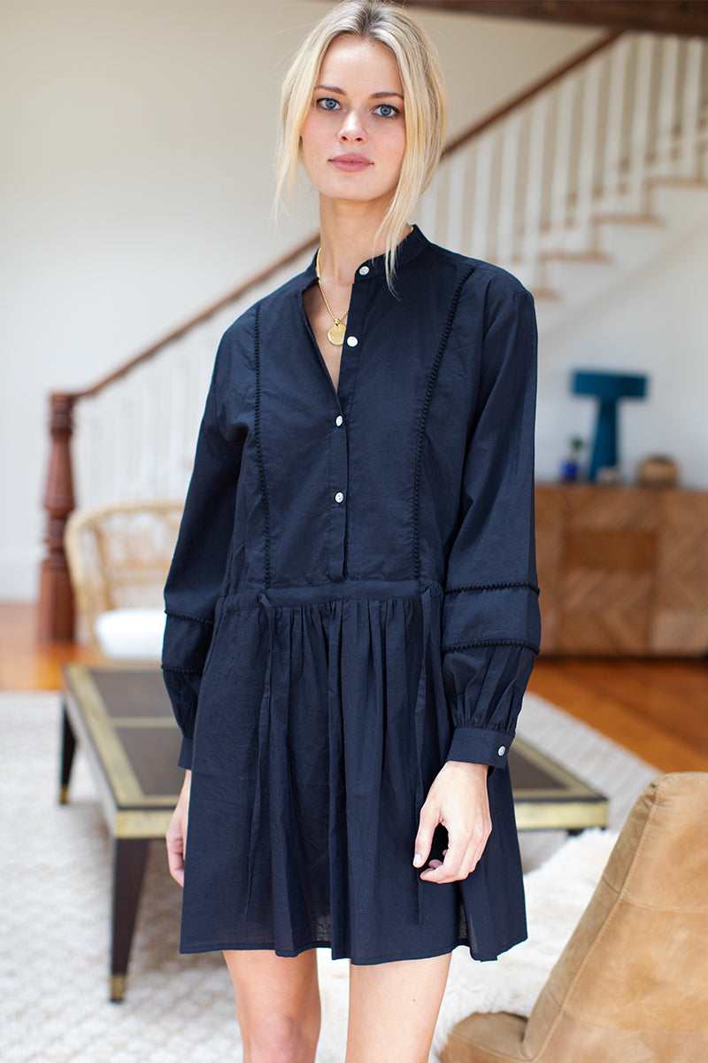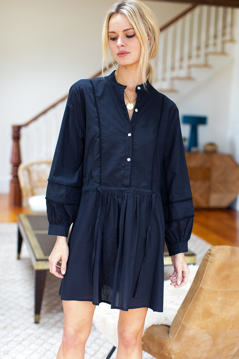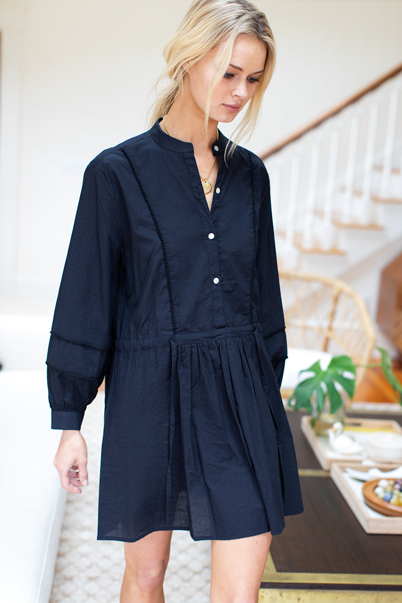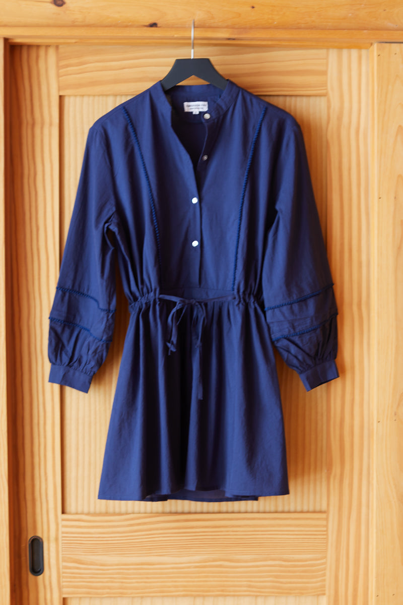 Light weight organic cotton shirting Shirtdress Button front neckline Bracelet length sleeves w/ button closure Standing Mandarin collar Drawstring waist, can be worn cinched or uncinched for a boxy look...