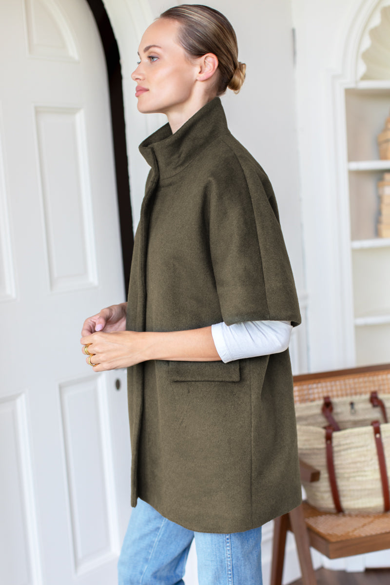 Wool Blend Fully lined - liner 55% poly 35% cotton Snap front closure Front welt pockets Dry Clean Made in NYC Model is wearing a size small Runs slightly oversized....