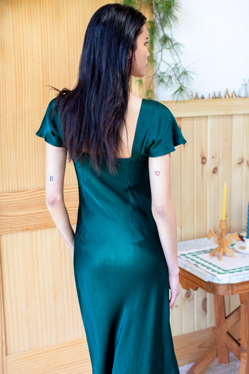 Silk Bias cut V neckline with knot detail at bust Flutter sleeve Lined Midi Length Hidden side seam zipper Made in NYC