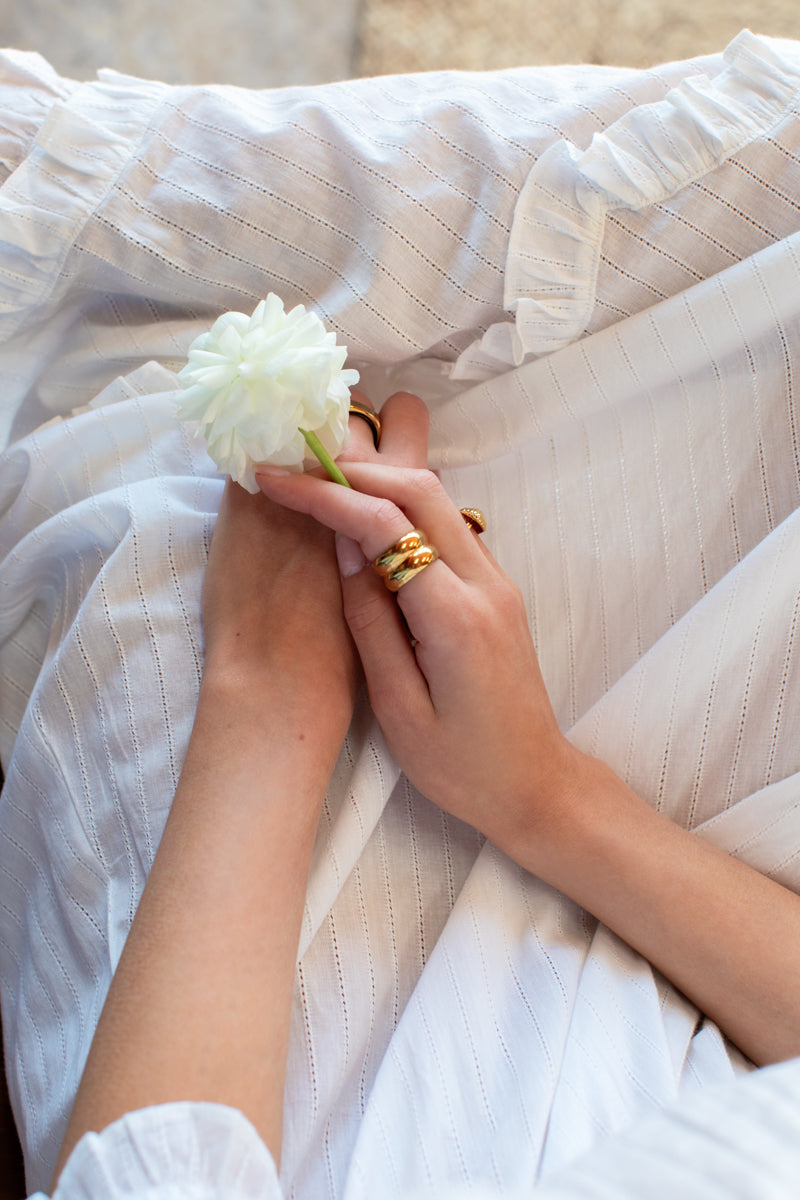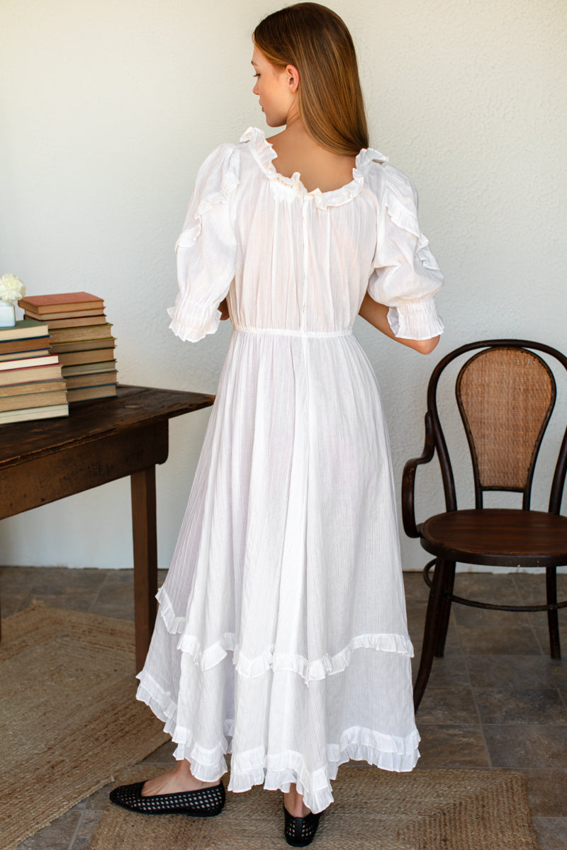 Cotton Scoop bias bound neckline Short set-in sleeves w/ gathering at shoulder Button front closures to skirt tier Back yoke w/ pleat Ladder lace detailing at shoulder, sleeve, back yoke...