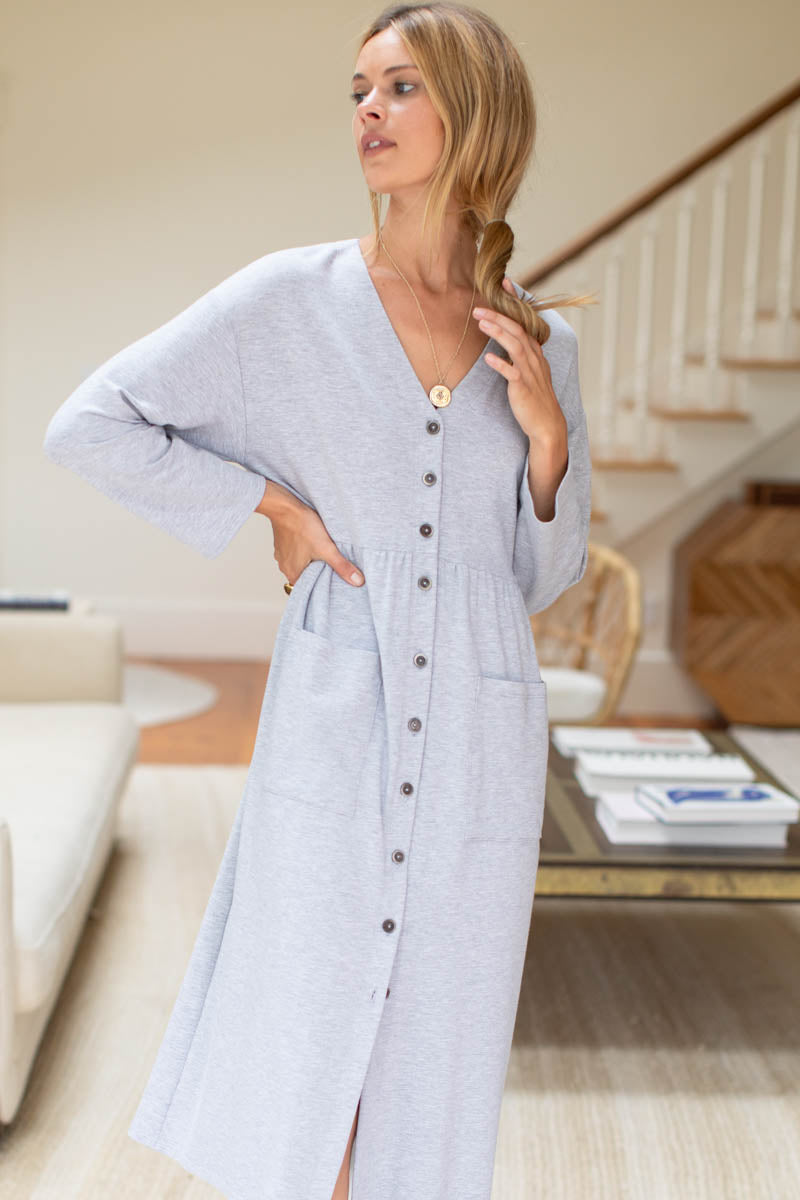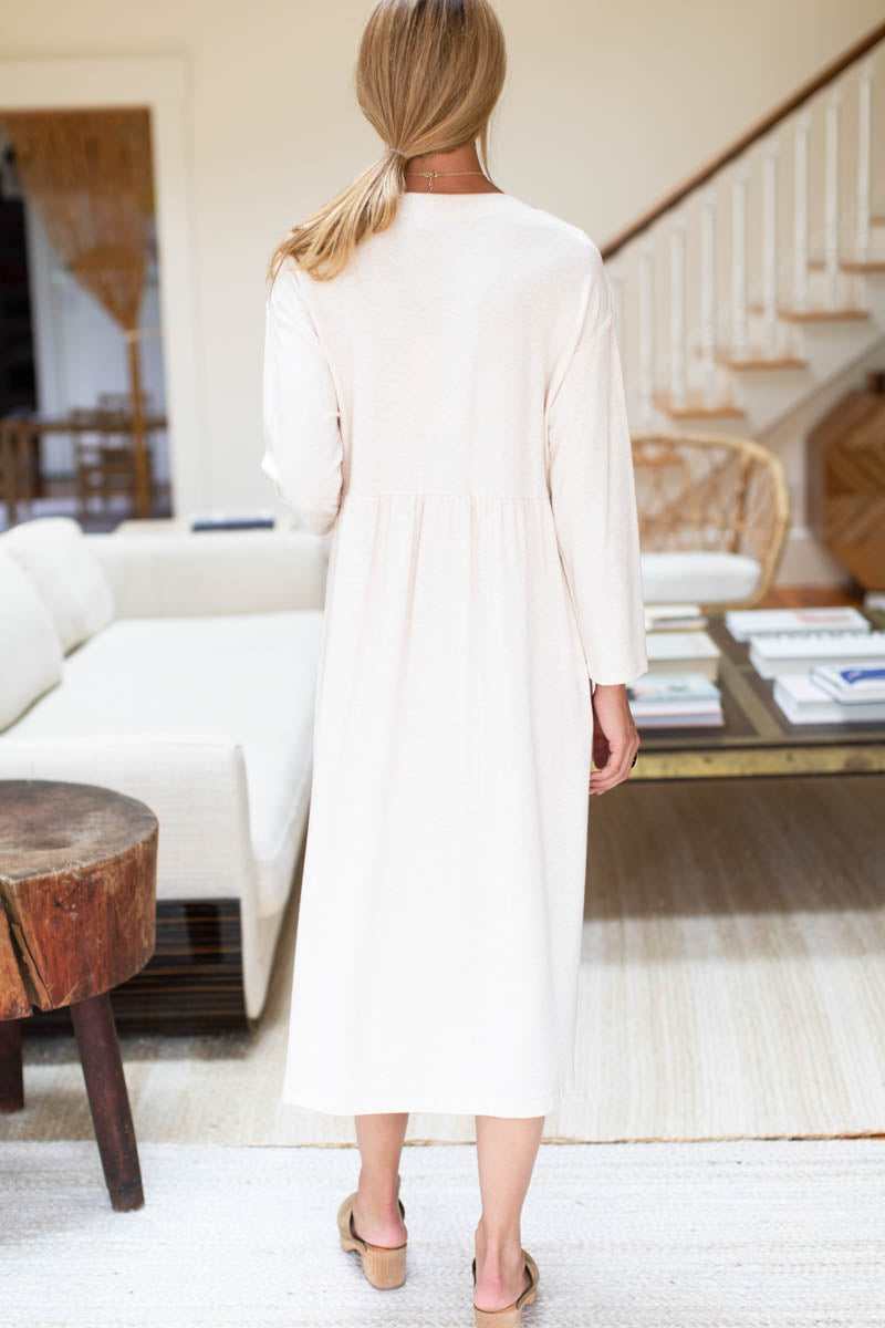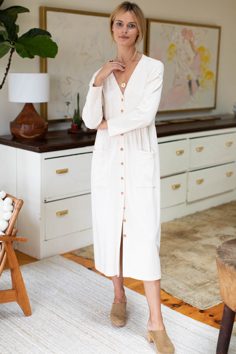 Organic Tencel Cotton Terry with soft hand feel Full button front Dropped shoulder V neckline Bracelet length sleeves Patch pockets on shirred skirt Unlined Relaxed, easy everyday fit Made in...