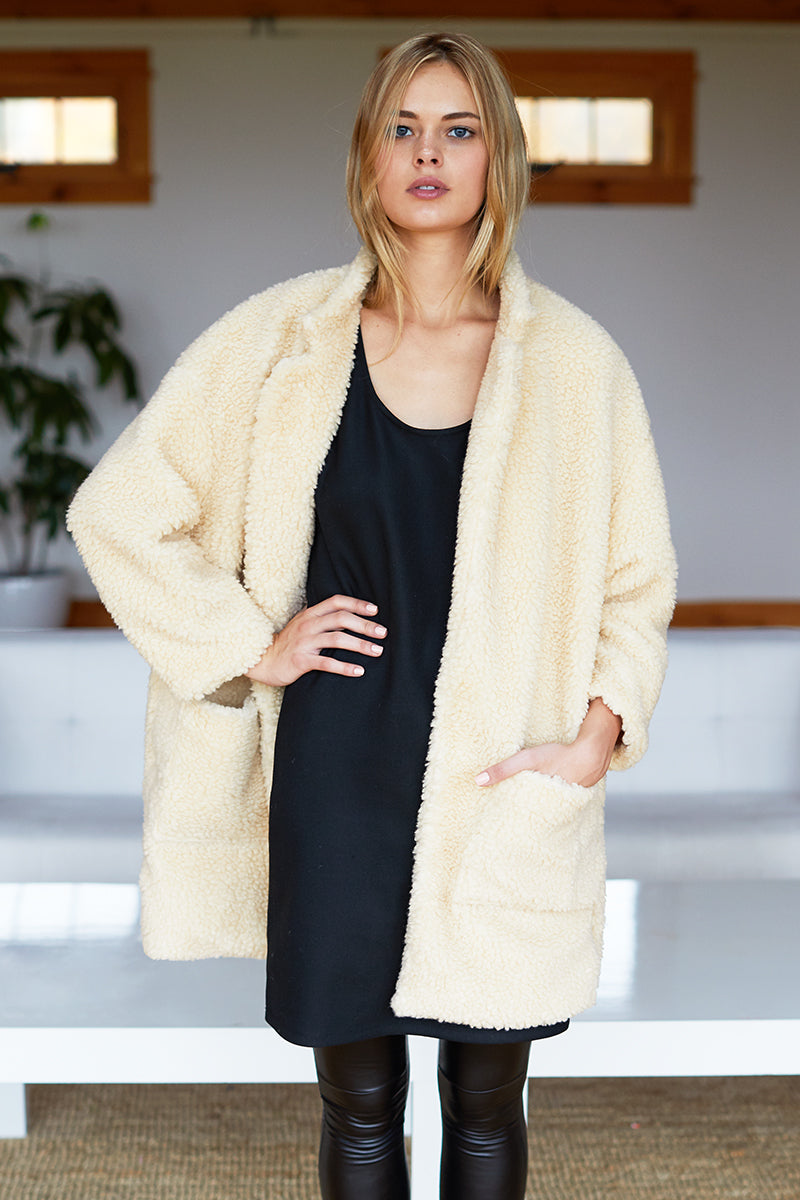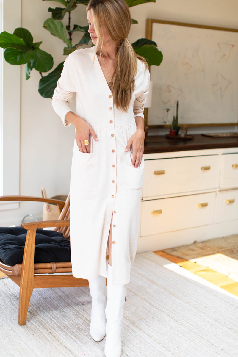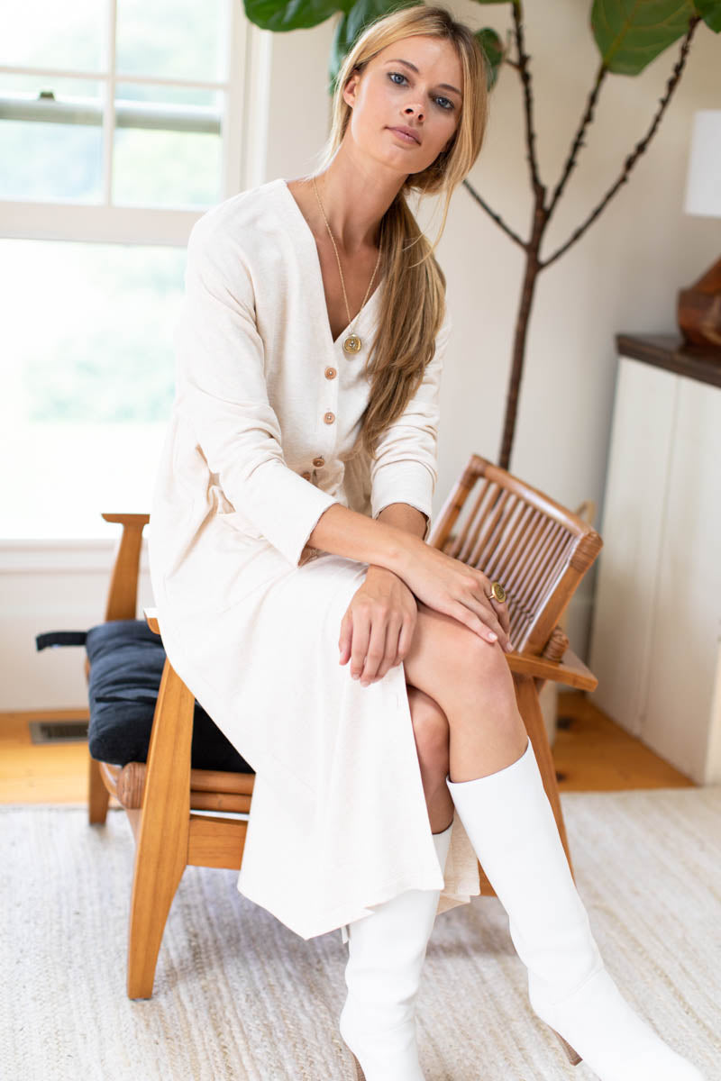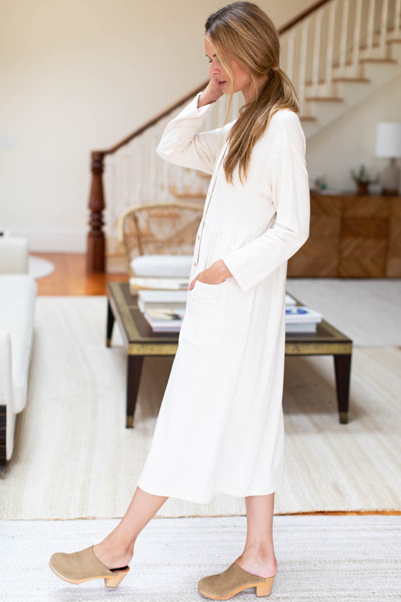 Organic Tencel Cotton Terry with soft hand feel Full button front Dropped shoulder V neckline Bracelet length sleeves Patch pockets on shirred skirt Unlined Relaxed, easy everyday fit Made in...