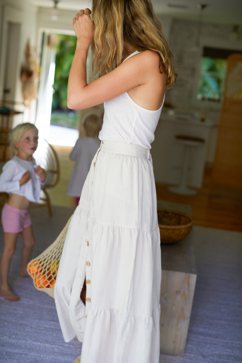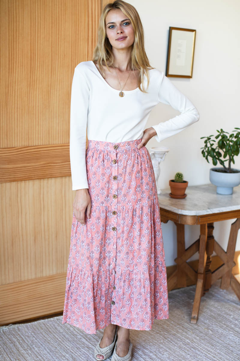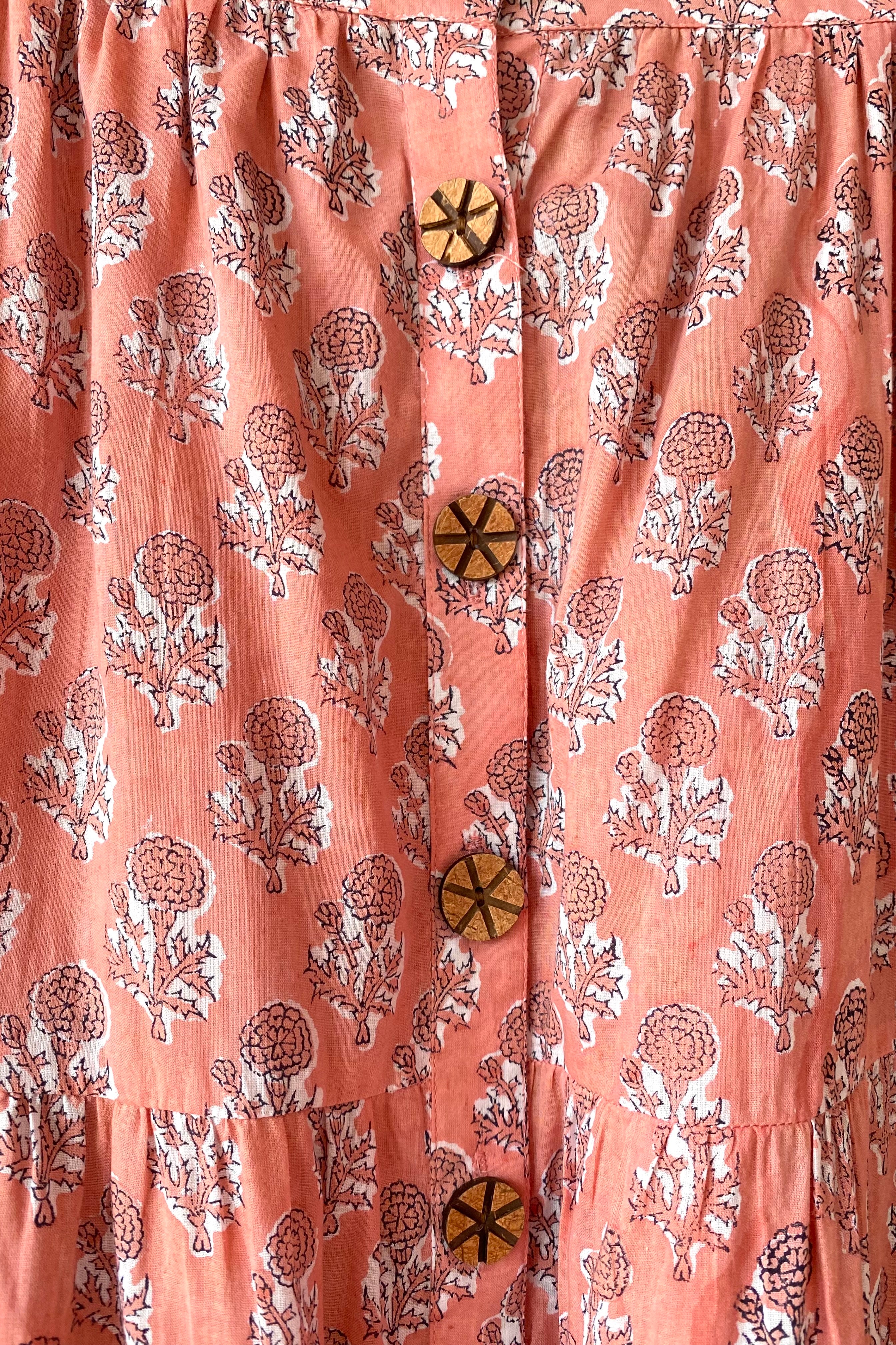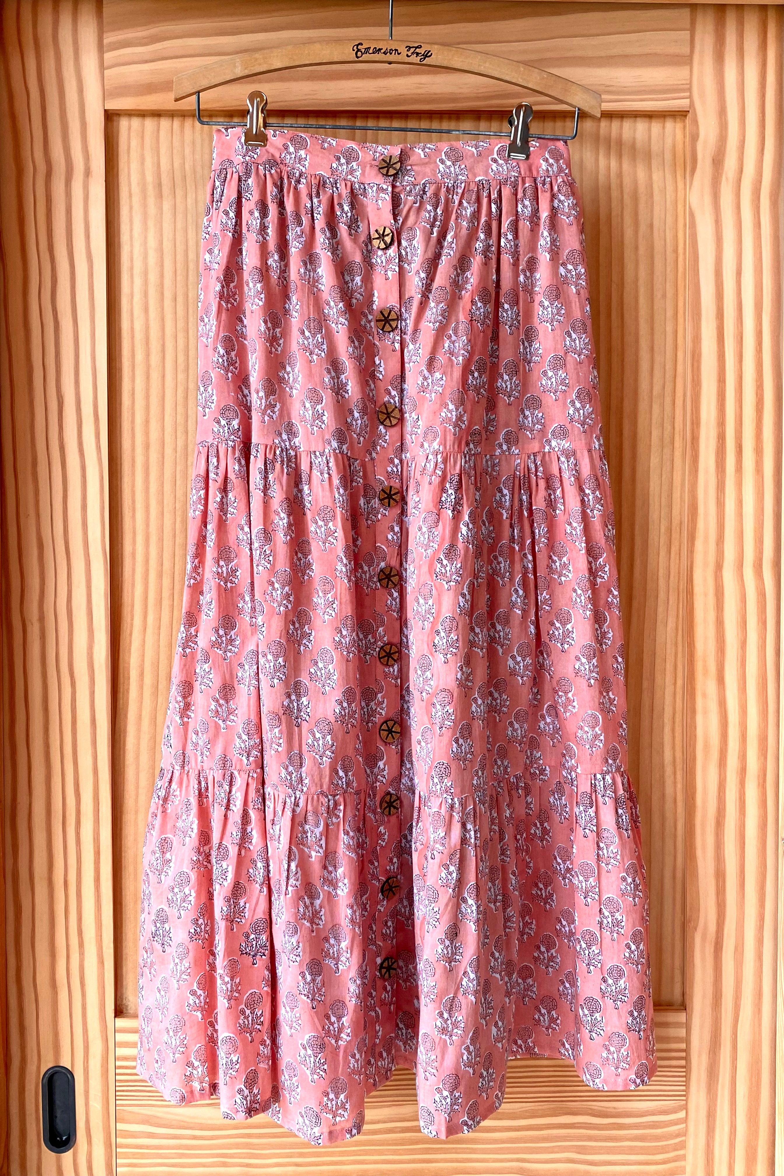 Organic cotton Hand Block printed with low impact dye Wide waist band with elastic at back Wooden button front Three-tiered gathered skirt Cotton Lined Hand wash, cold + line dry...