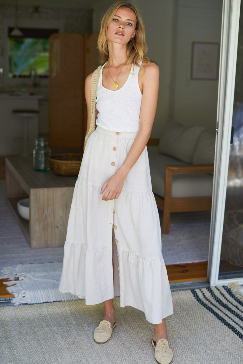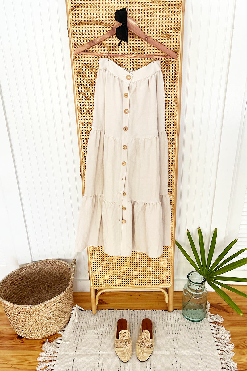 Linen/Rayon blend with beautiful drape Wide waist band with elastic at back Wooden button front Three-tiered gathered skirt Dry clean only Made in NYC XXS: Waist 22", Hip 37" XS:...