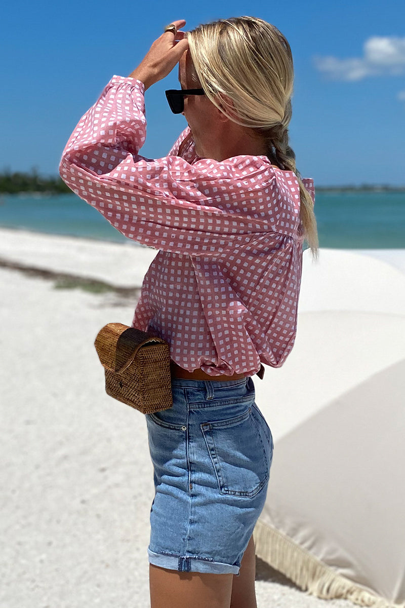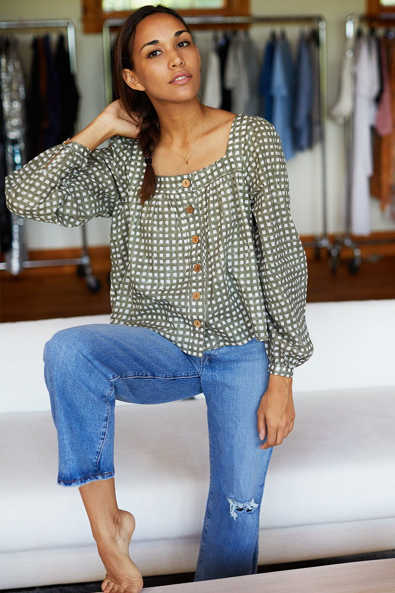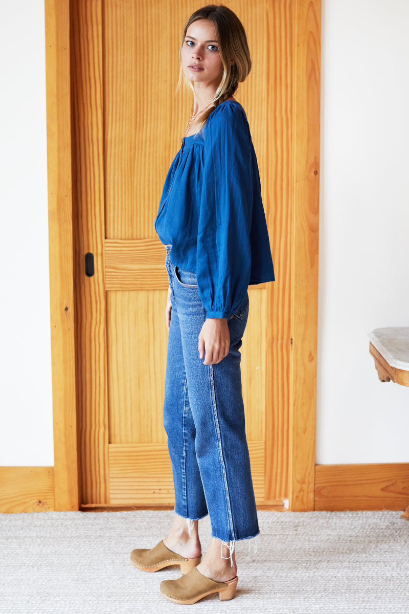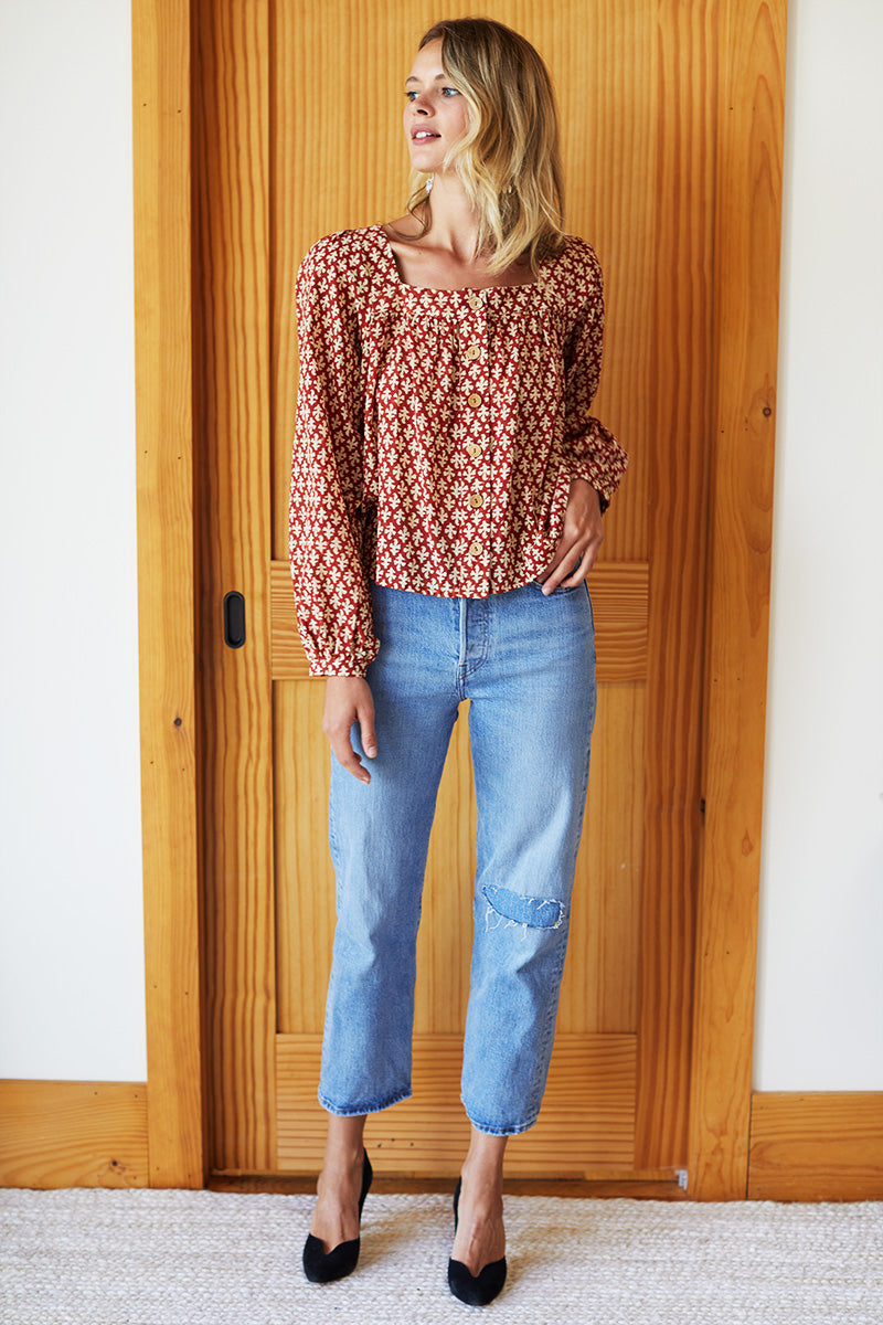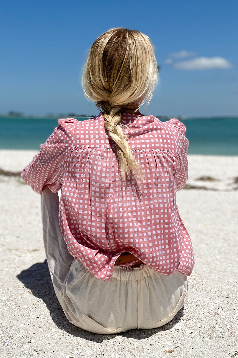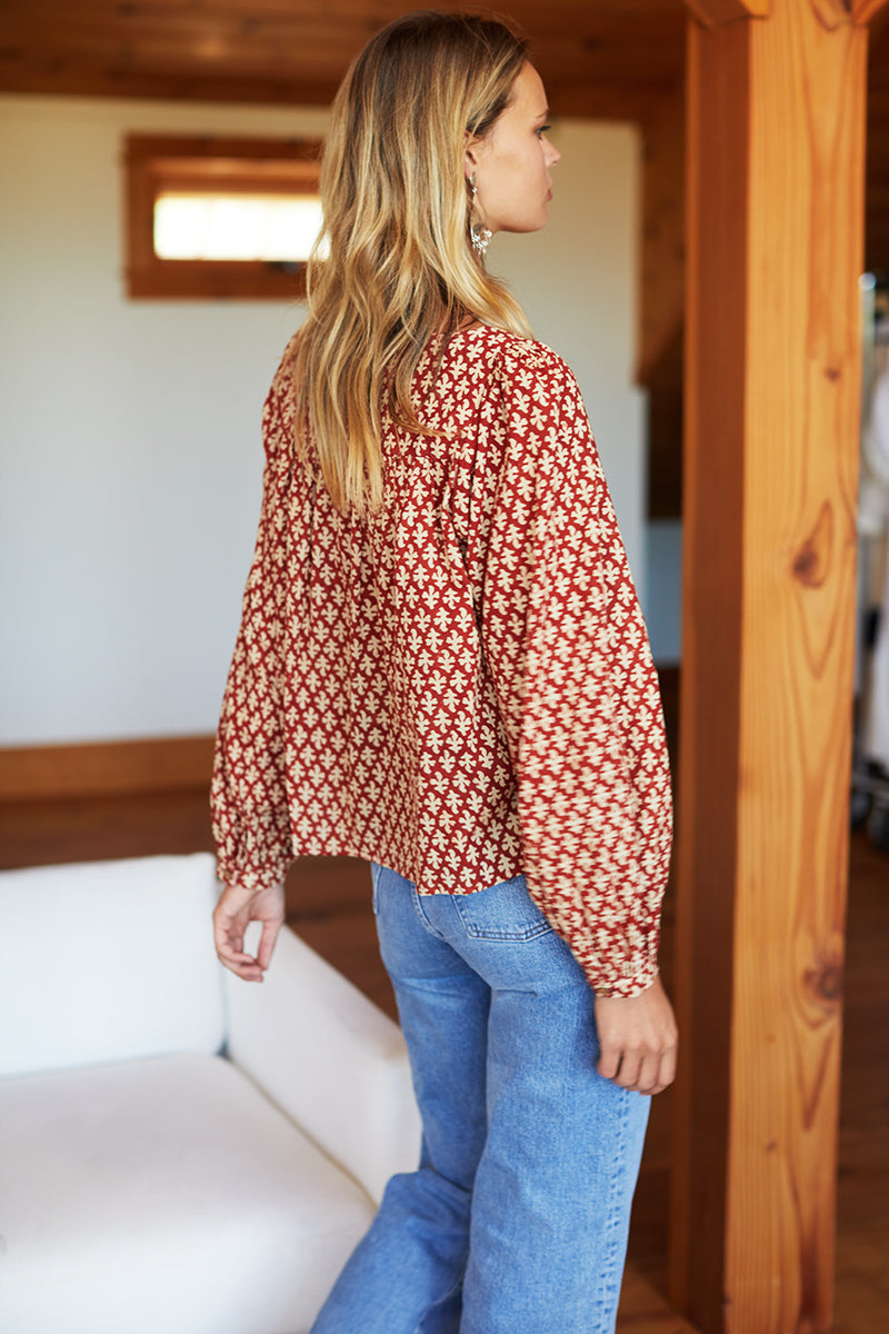 Organic Cotton Hand block printed and dyed using low impact dye Scoop neckline w/ keyhole opening & tie closure Gathered short sleeve w/ smocking at cuff Ruffle trim at neckline,...