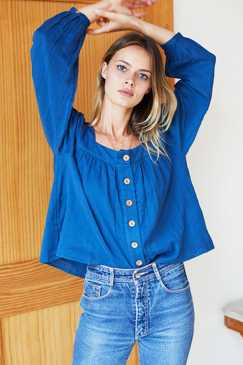 Organic Cotton Swiss Dots Hand dyed using low impact dye Wooden button front shirt Lined Hand wash, line dry Made in Rajasthan, India Size XS: Bust 40”, Center Back Length...