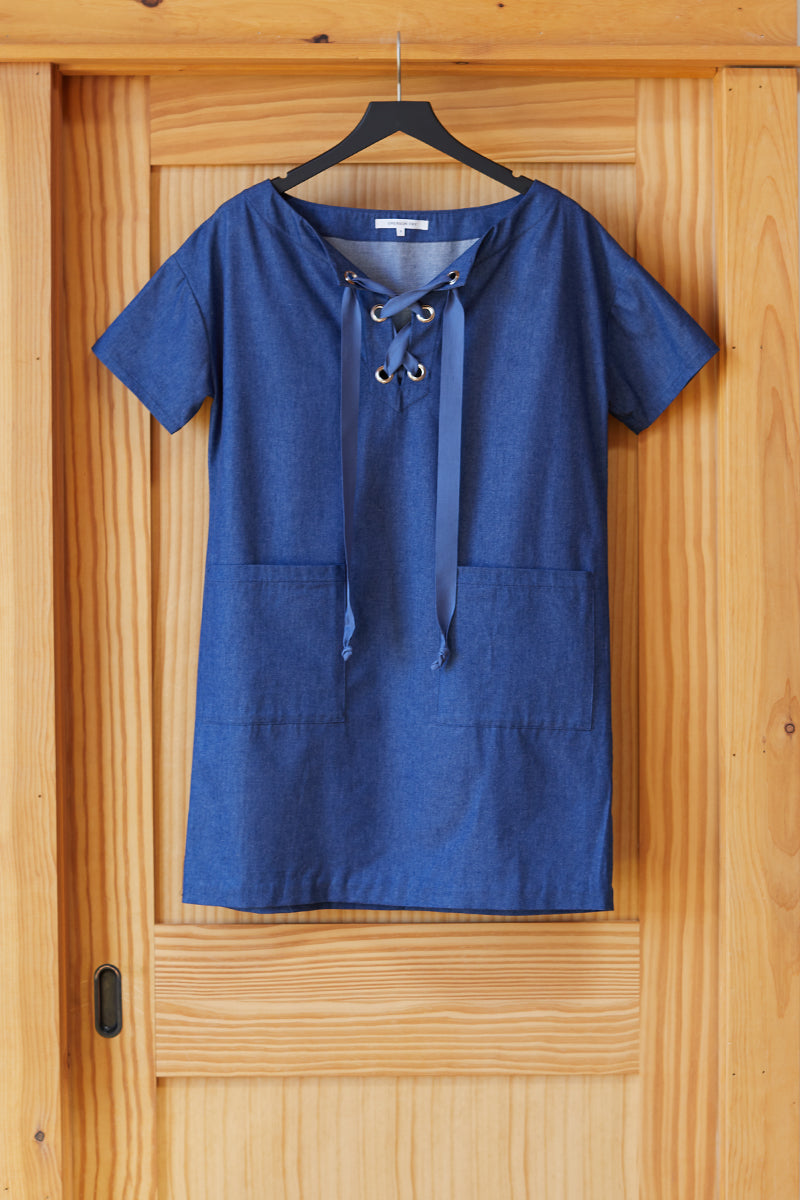100% Cotton - light dress weight denim Lace up neckline Dropped shoulder Front patch pockets Model is 5'9" and wearing a size medium for an oversized look Made in NYC...