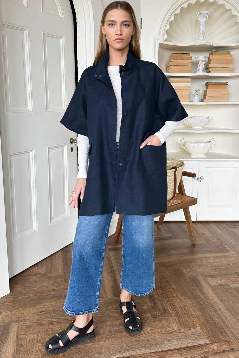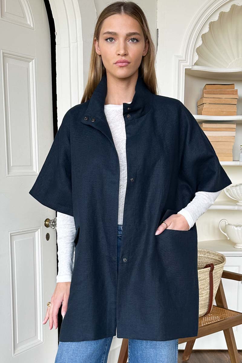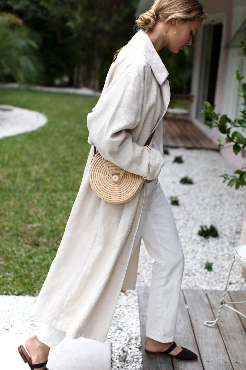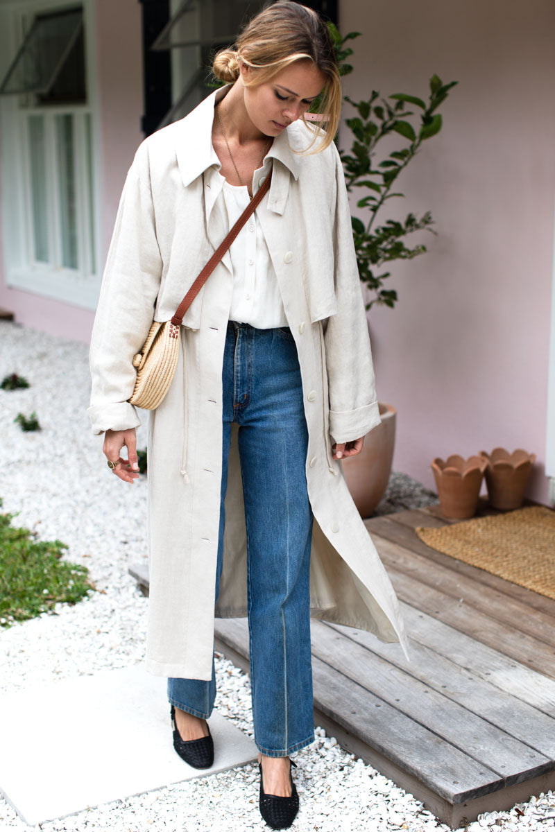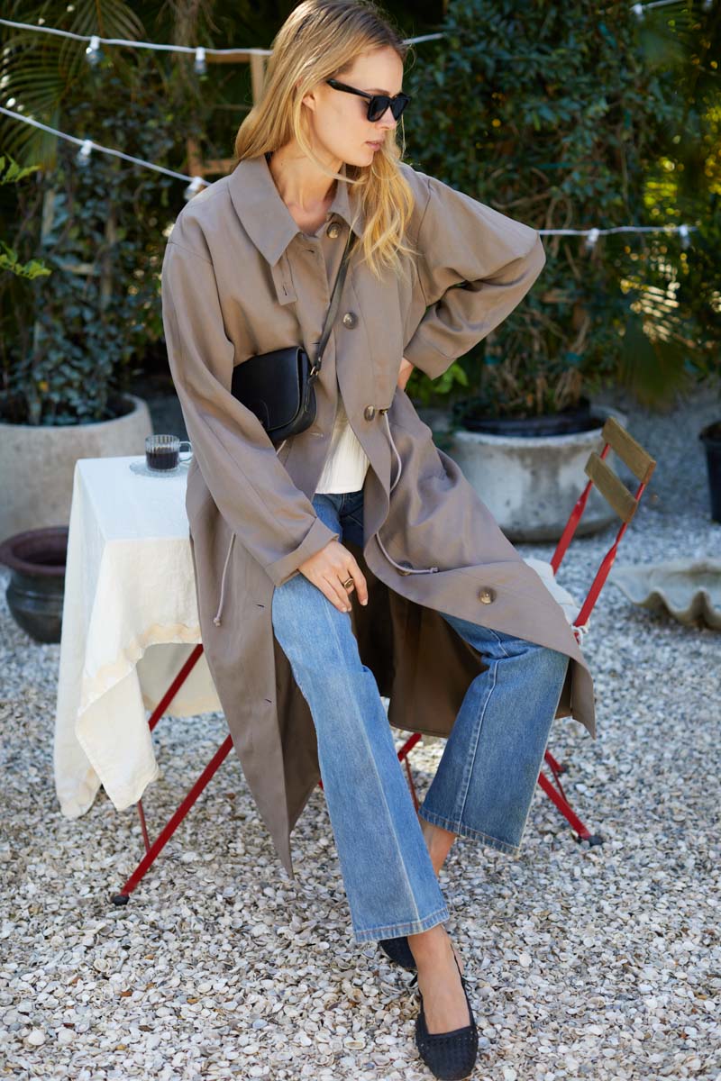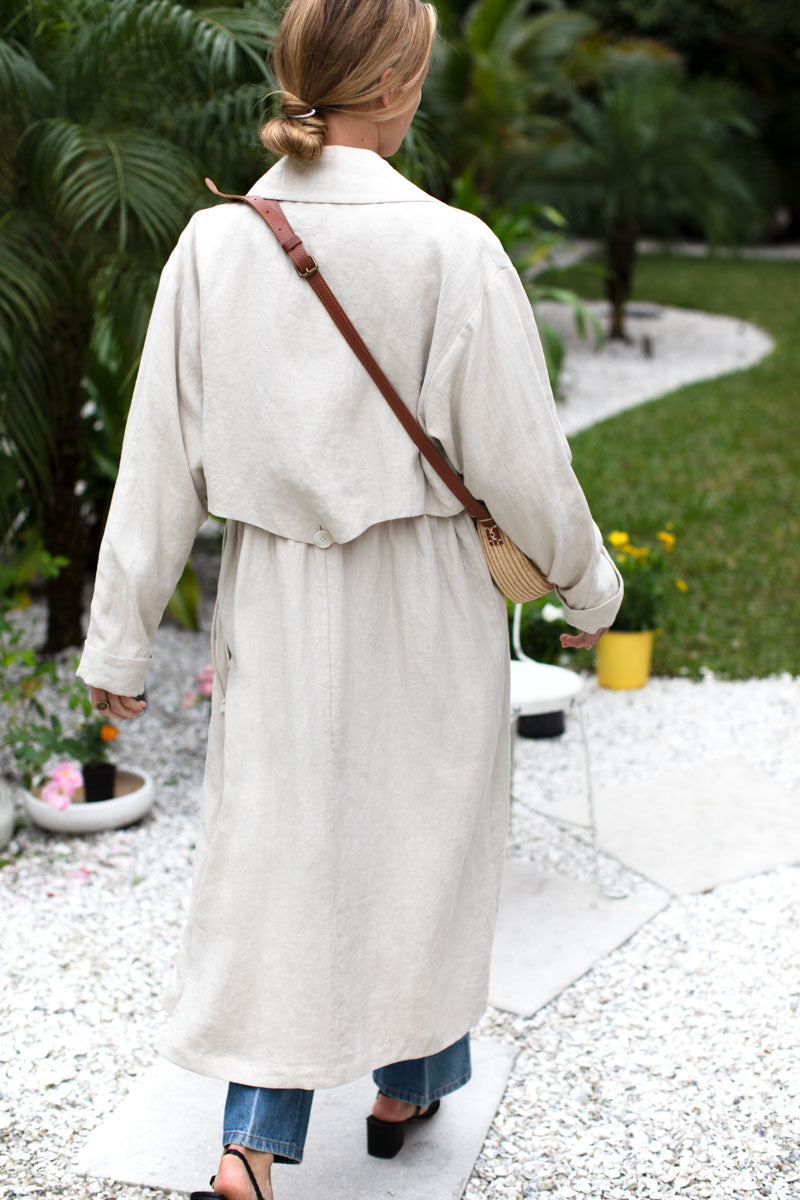 Washed linen Classic Trench Style Button down front Wear collar up or down Rainguard detail Drawstring waist Angled welt pockets at side Rolled cuff Fully lined Boxy, slightly A-line fit...