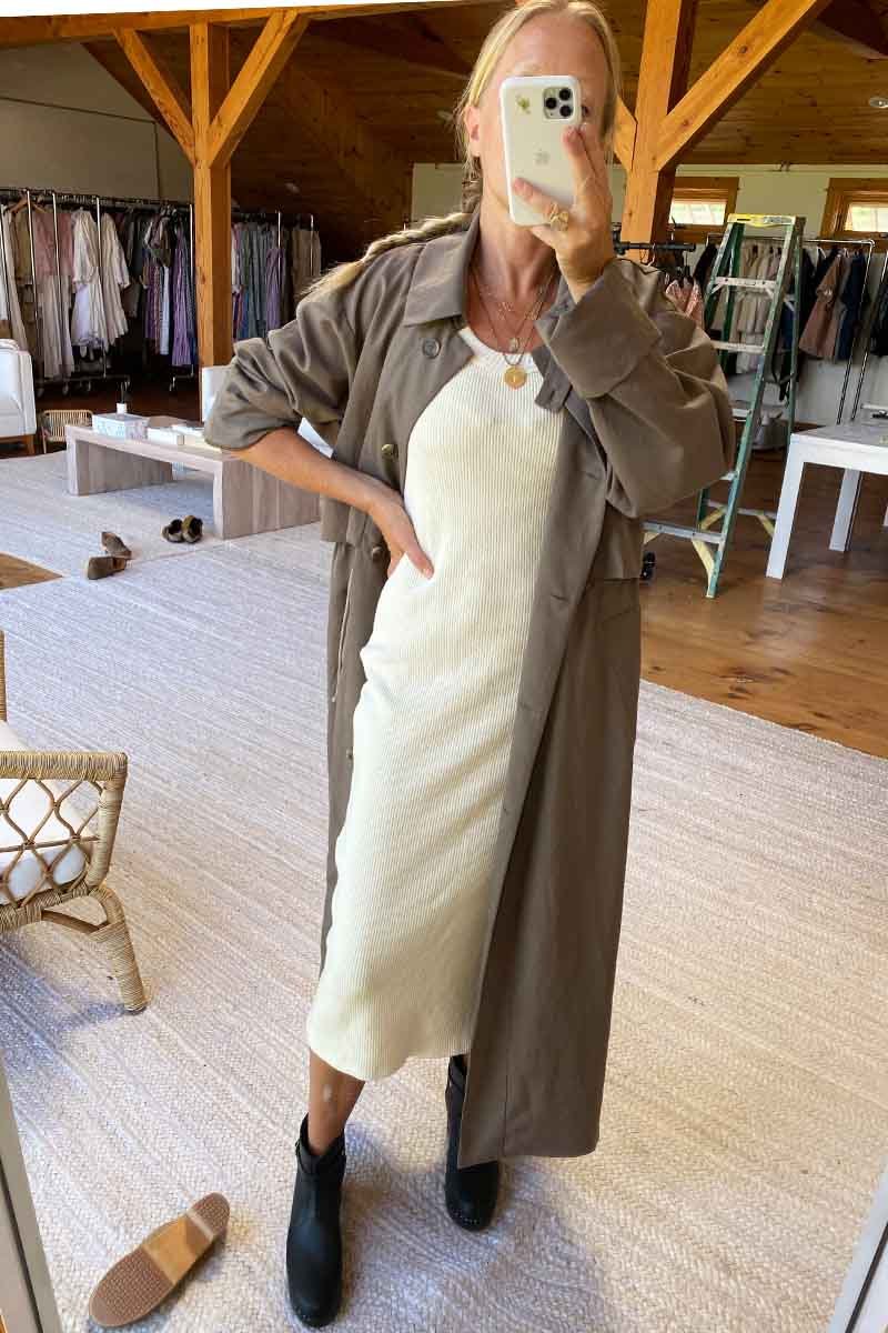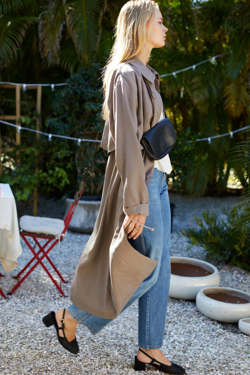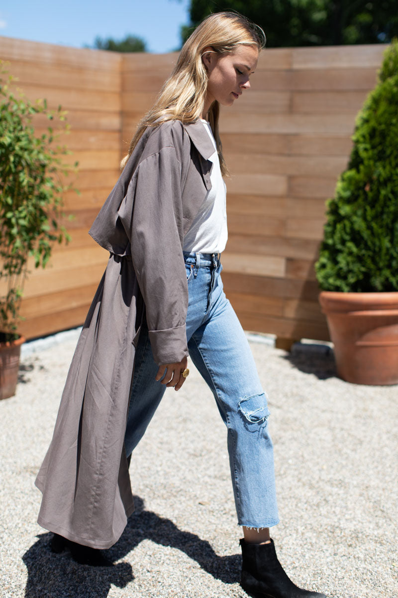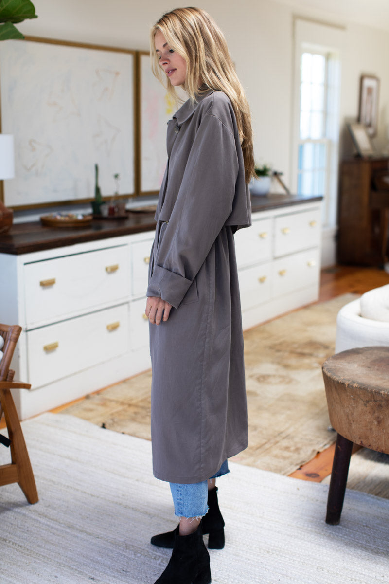 Tencel Fabric with soft hand feel + weighty drape Classic Trench Style Button down front Wear collar up or down Rainguard detail Drawstring waist Angled welt pockets at side Rolled...
