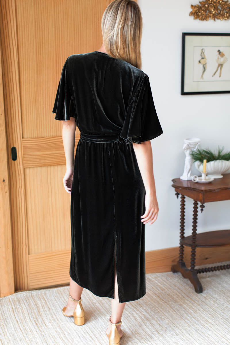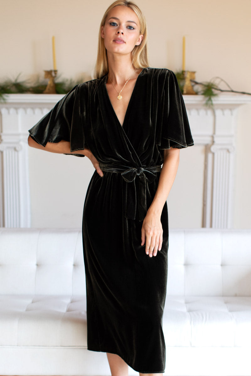 Luxe Silk Velvet blend Elbow length fluttery angel style sleeve Elastic waist w/ removable tie sash Unlined 14" Center back hem opening Green dry clean Made in NYC XS: Bust...