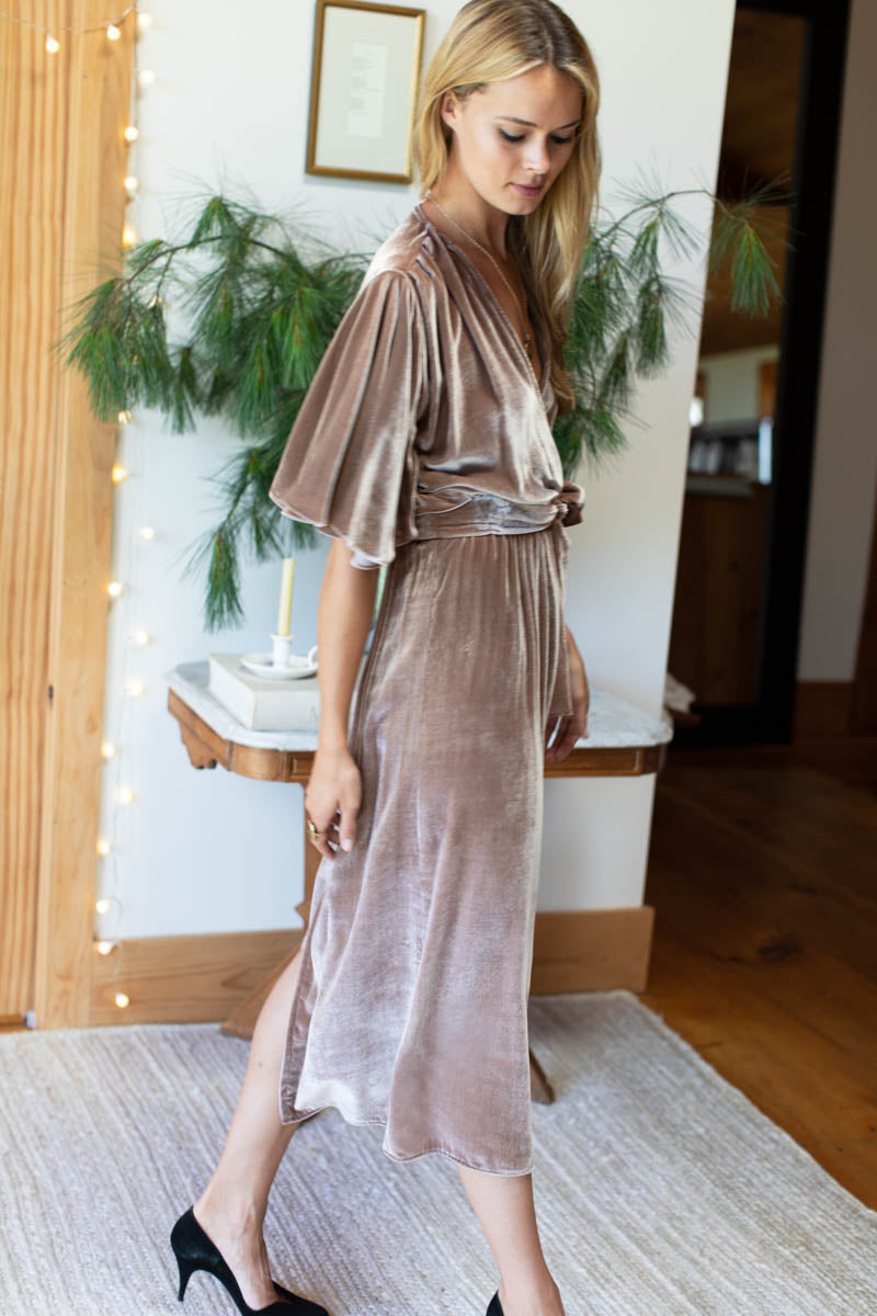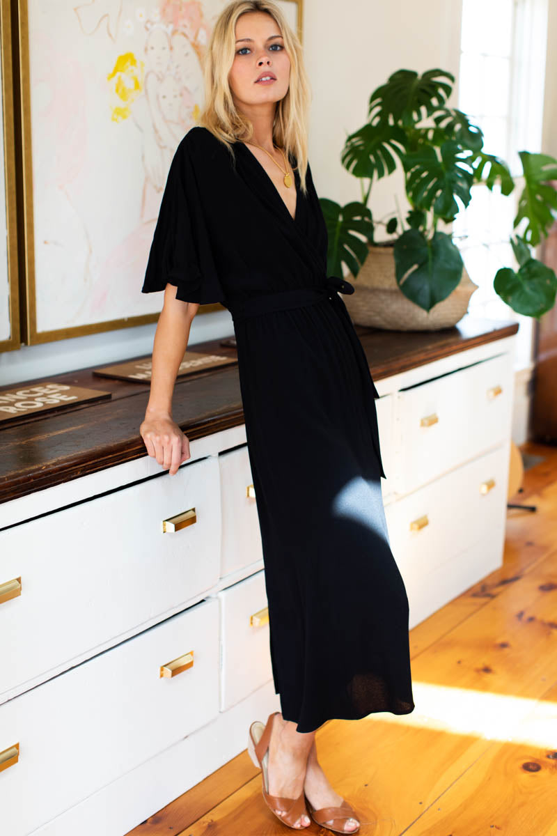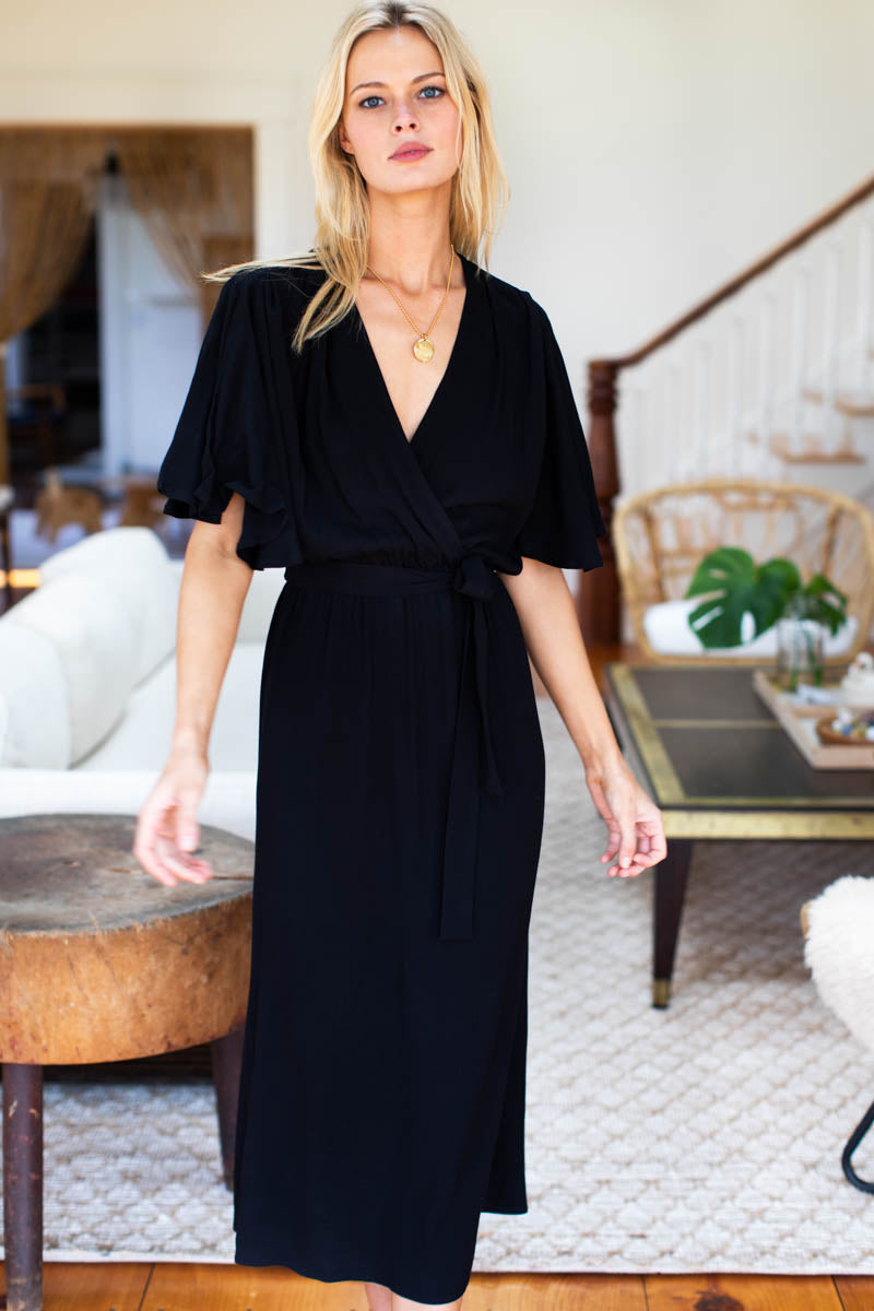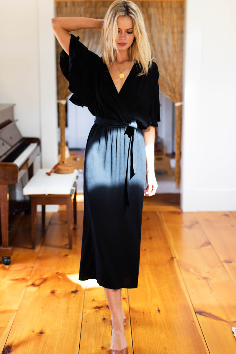New! Updated fit for 2021 Viscose/Rayon Crepe with beautiful drape Elbow length Capelet style sleeve Wrap style bodice with high waist Elastic waist with tie sash 14" Center back slit...