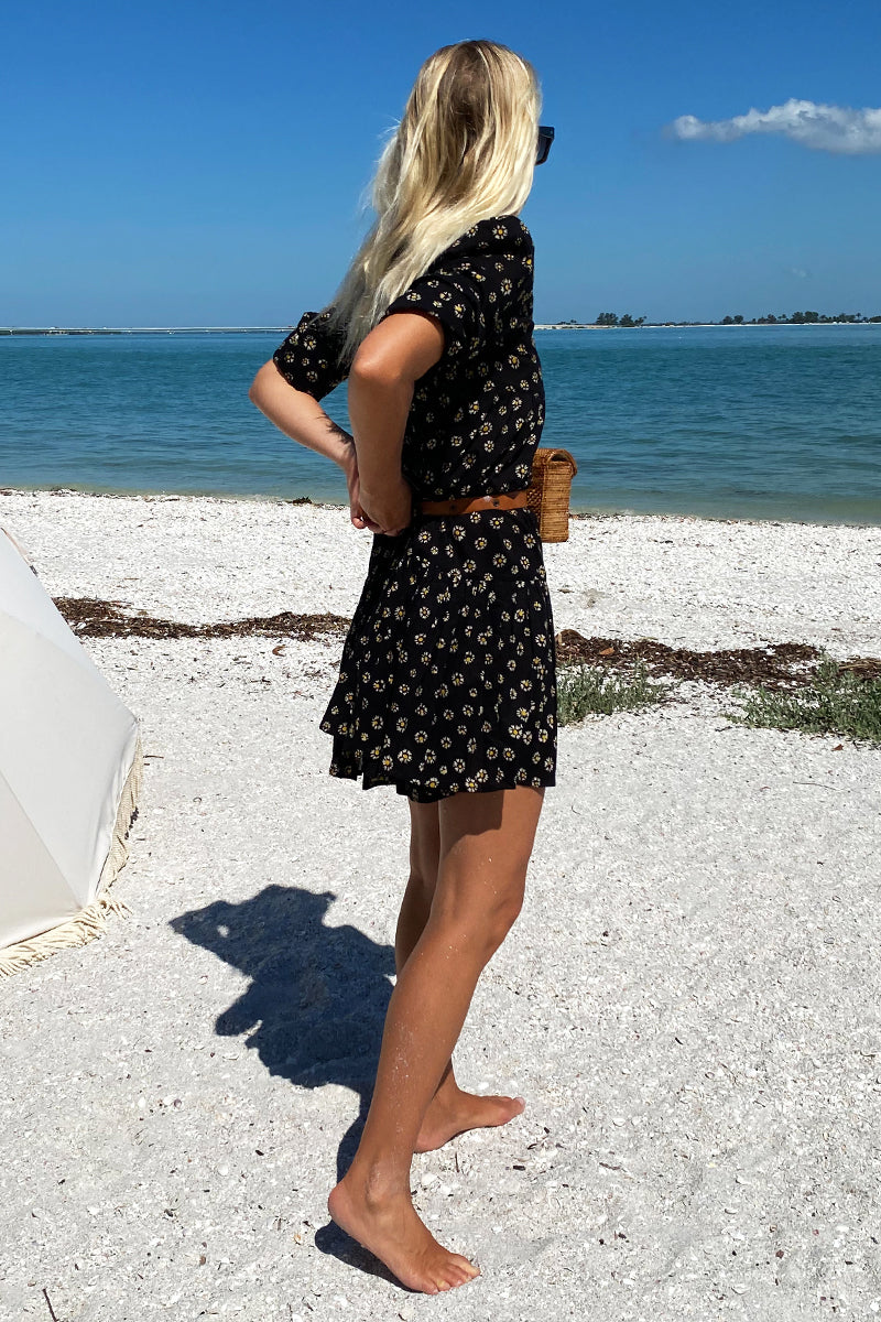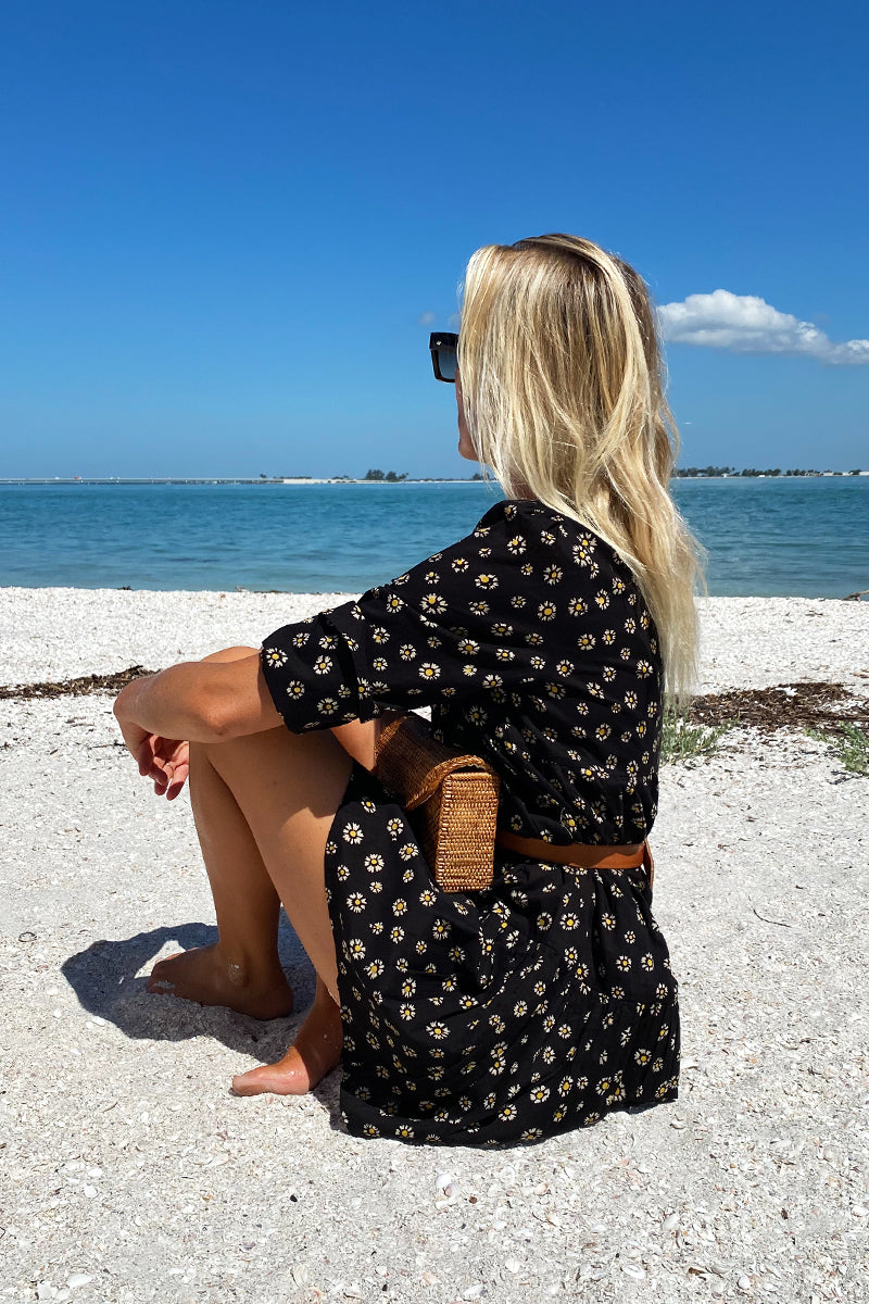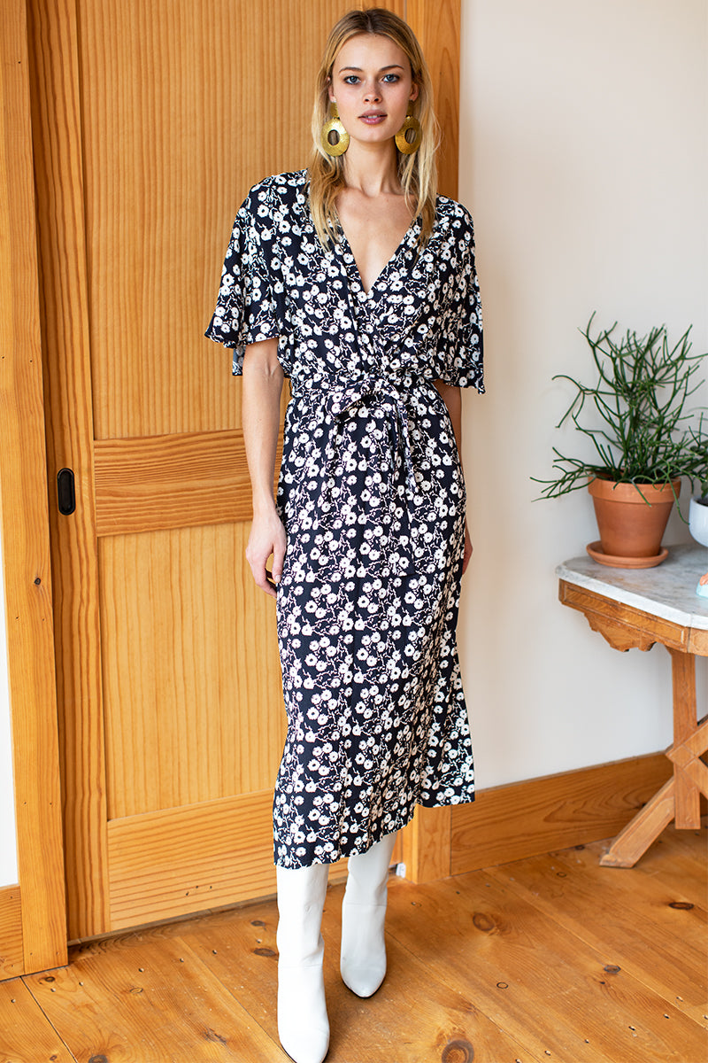 Soft back background w/ white wildflower print Viscose/Rayon Crepe Elbow length Capelet style sleeve Elastic waist w/ tie sash 14" Center back hem opening Model is wearing a size 5'9"...