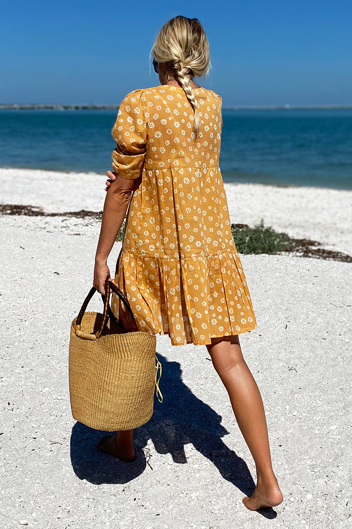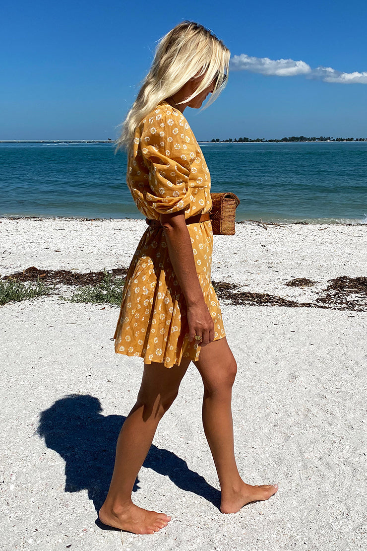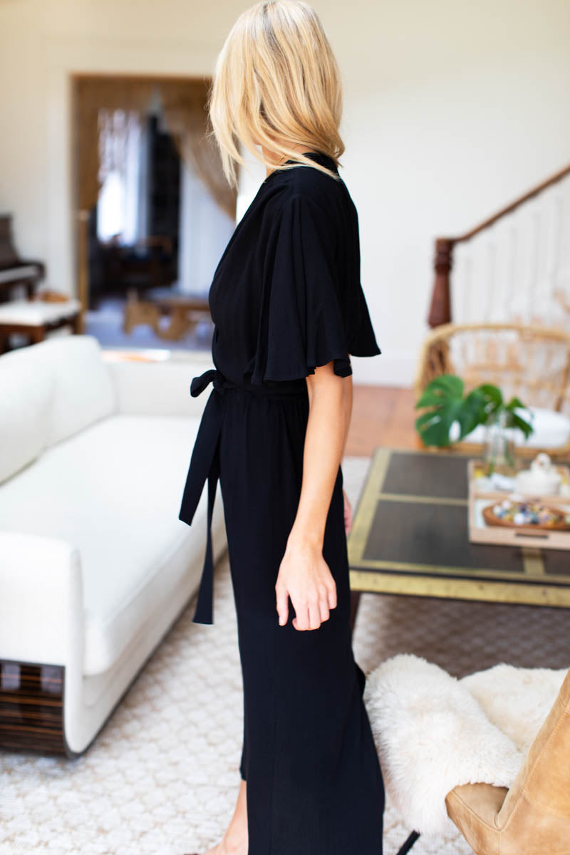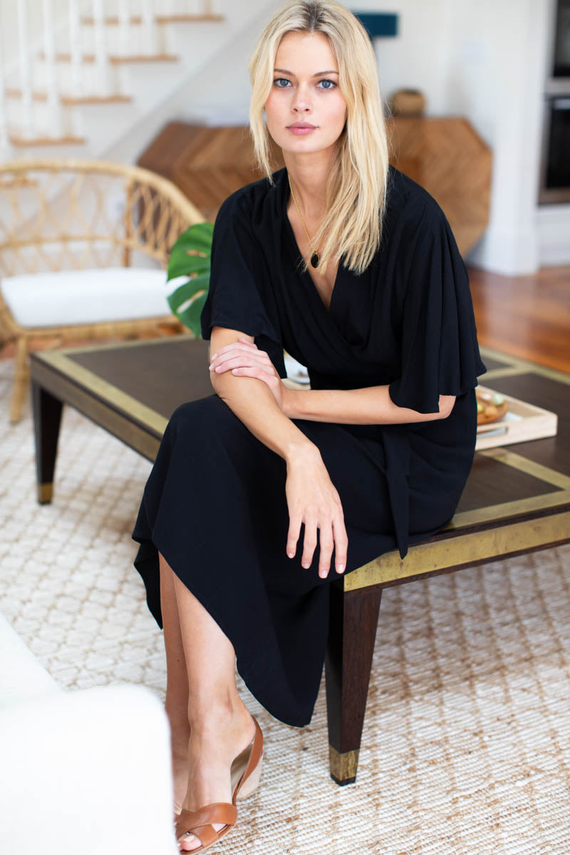 Soft back background w/ white wildflower print Viscose/Rayon Crepe Elbow length Capelet style sleeve Elastic waist w/ tie sash 14" Center back hem opening Model is wearing a size 5'9"...